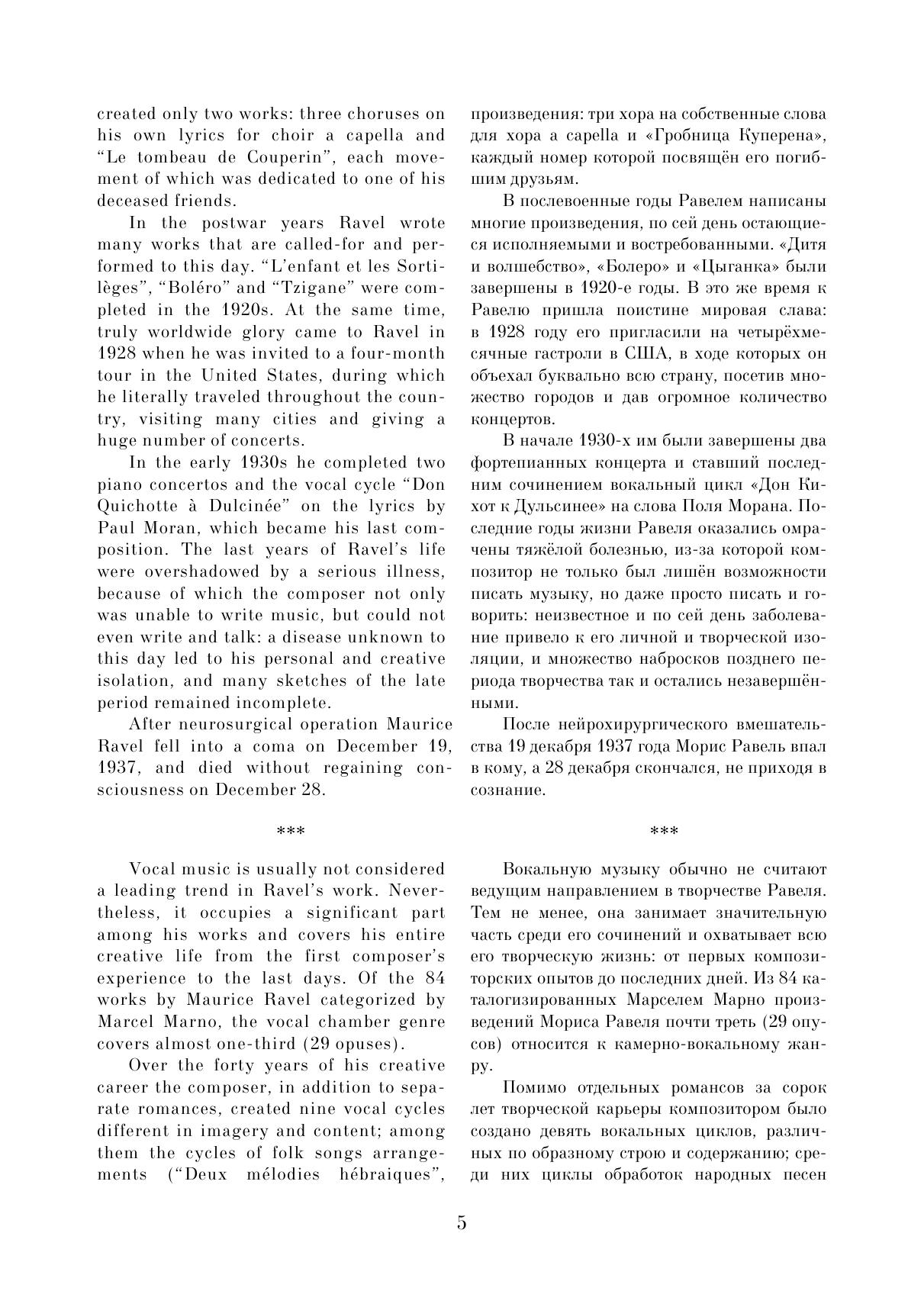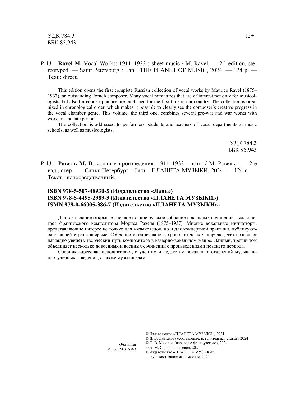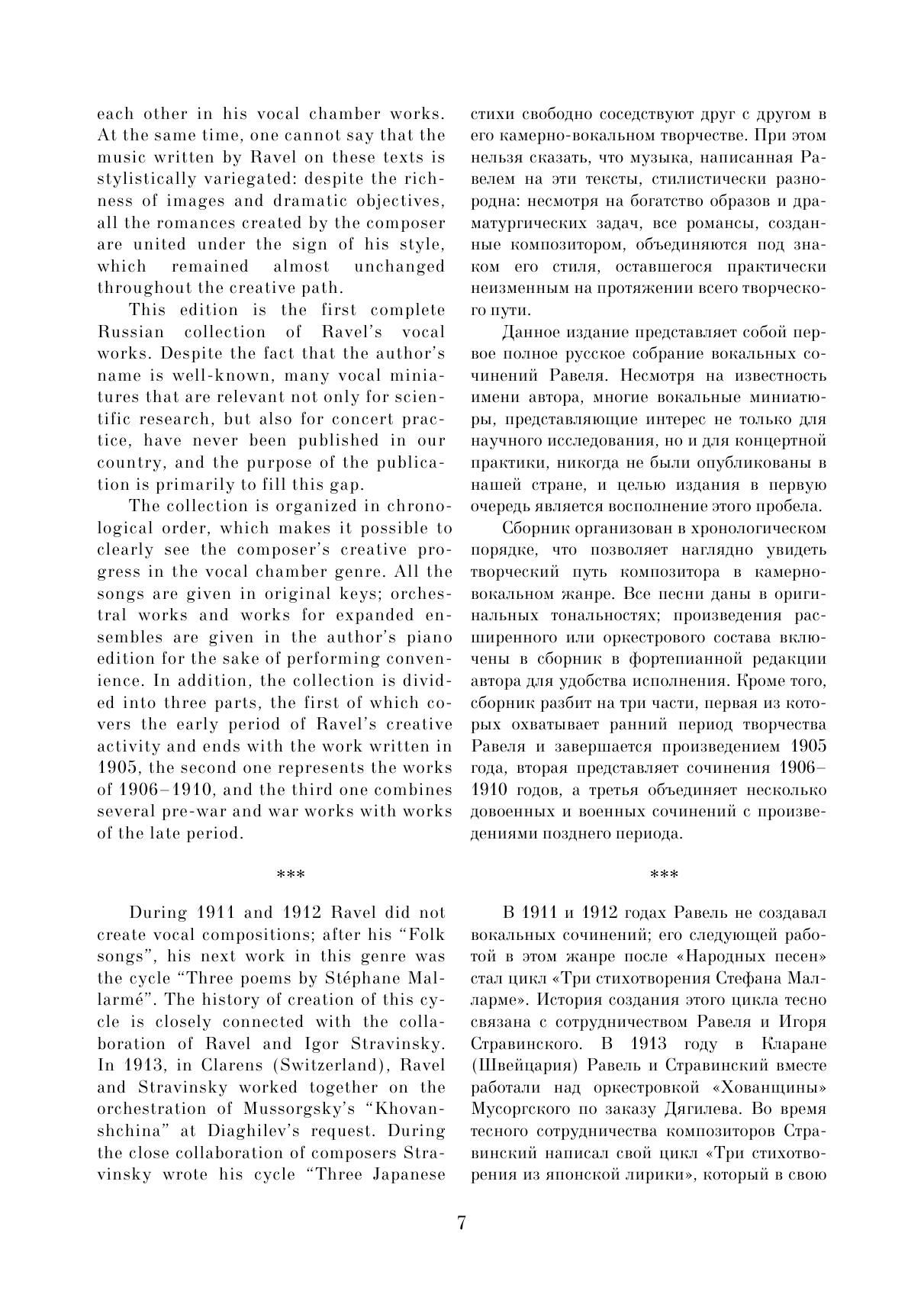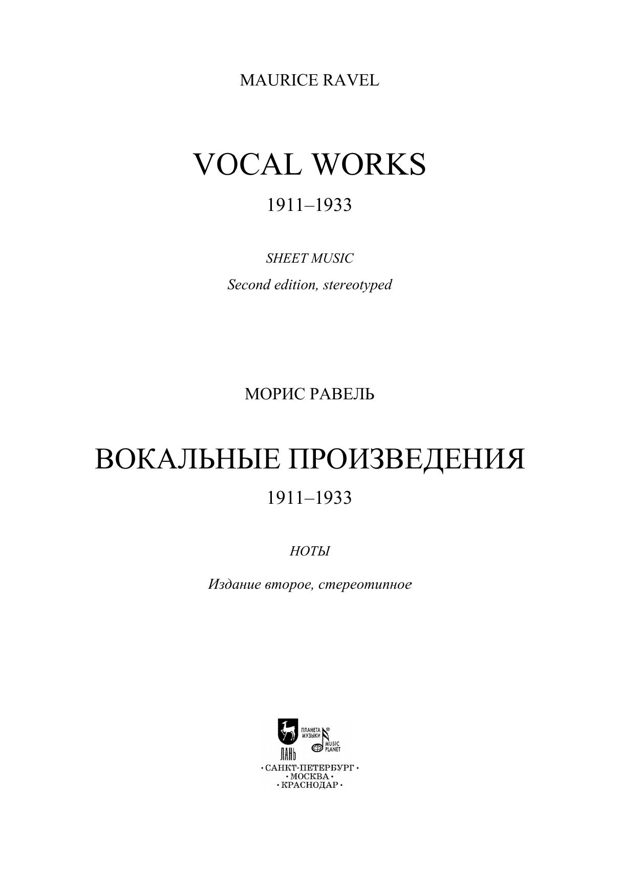 Данное издание представляет собой первое полное русское собрание вокальных сочинений выдающегося французского композитора Мориса Равеля (1875–1937). Многие вокальные миниатюры, представляющие интерес не только для музыковедов, но и для концертной практики, публикуются в нашей стране впервые. Сборник организован в хронологическом порядке, что позволяет наглядно увидеть творческий путь композитора в камерно-вокальном жанре. Издание включает три тома. Данный, третий том объединяет несколько довоенных и военных сочинений с произведениями позднего периода. Сборник адресован певцам, студентам и педагогам вокальных отделений музыкальных учебных заведений, музыковедам.