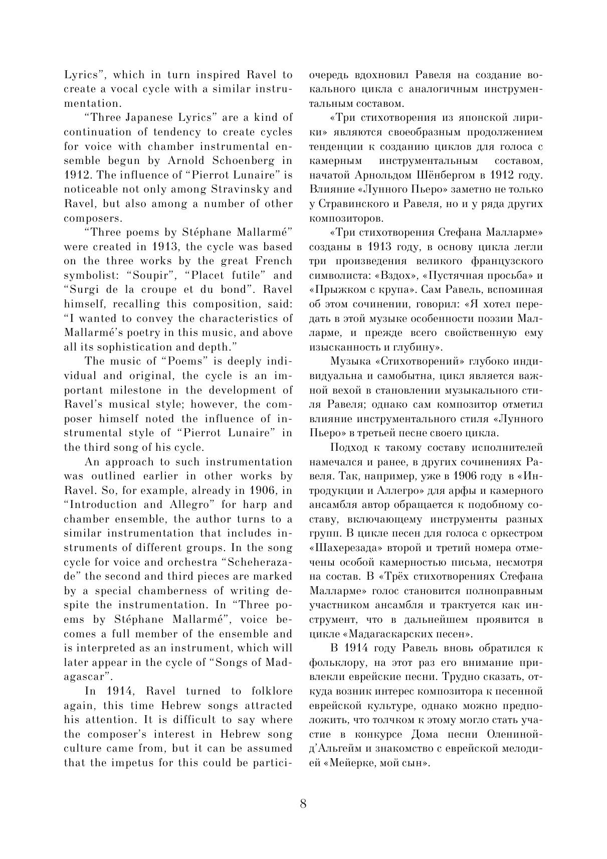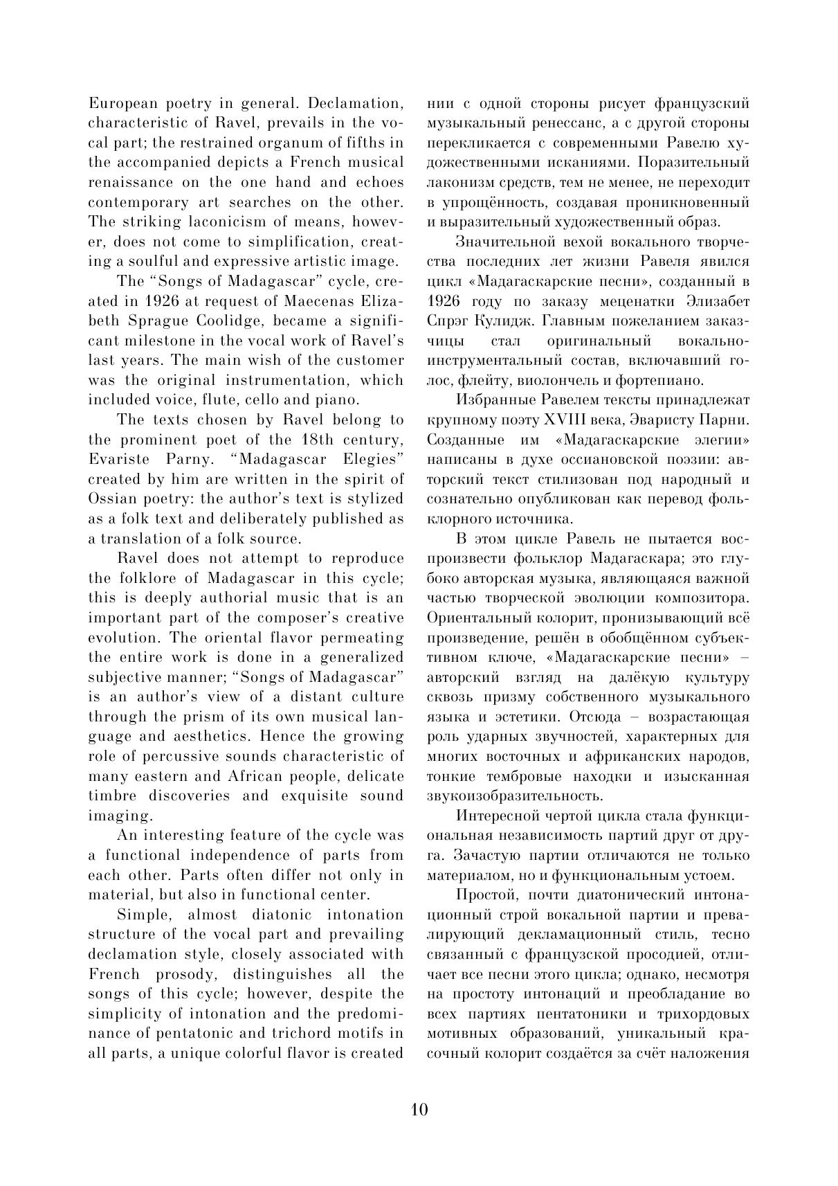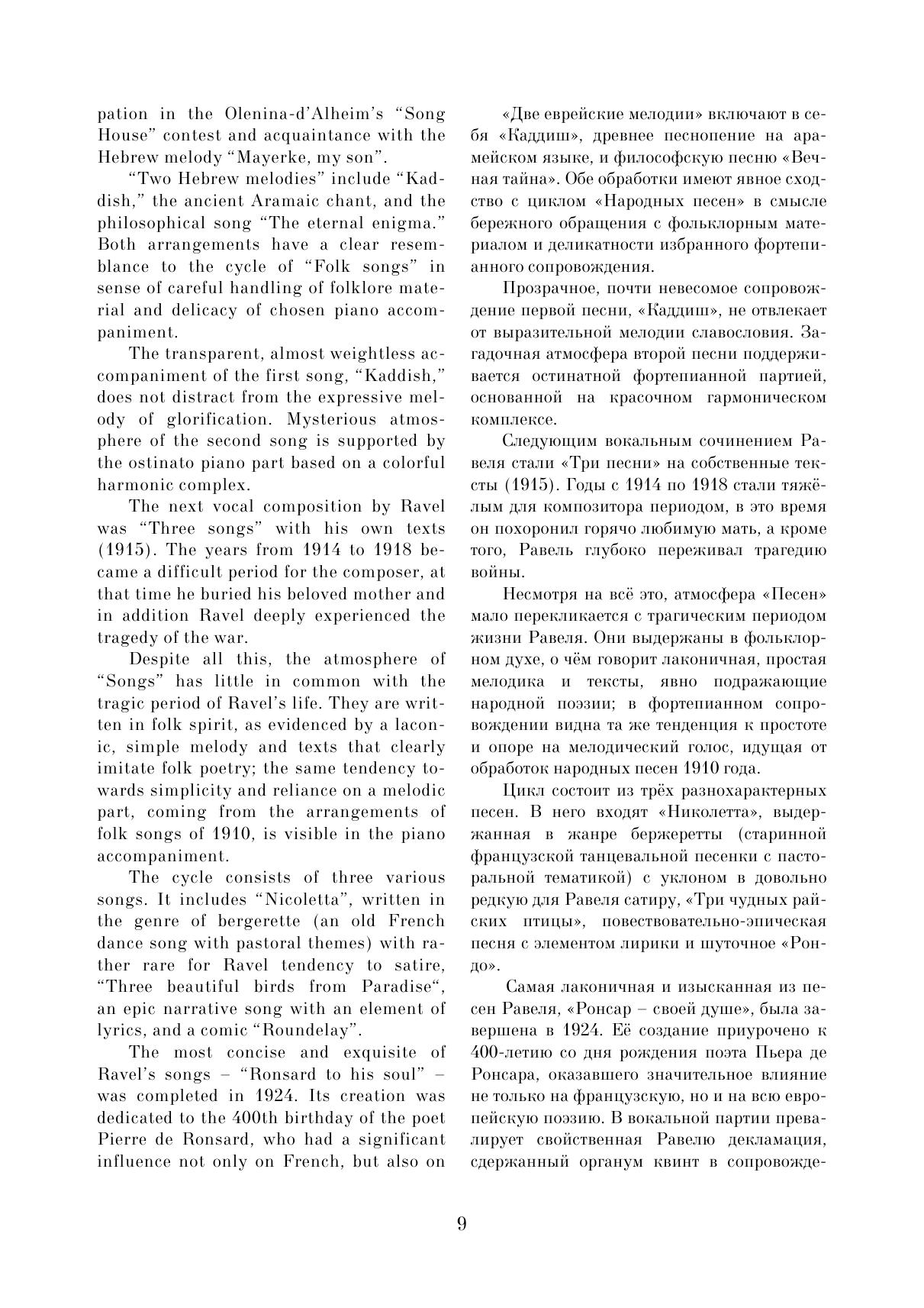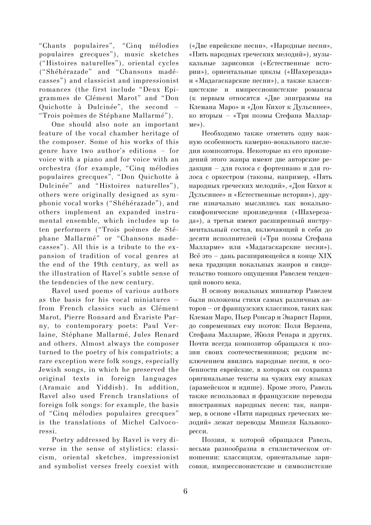 Данное издание представляет собой первое полное русское собрание вокальных сочинений выдающегося французского композитора Мориса Равеля (1875–1937). Многие вокальные миниатюры, представляющие интерес не только для музыковедов, но и для концертной практики, публикуются в нашей стране впервые. Сборник организован в хронологическом порядке, что позволяет наглядно увидеть творческий путь композитора в камерно-вокальном жанре. Издание включает три тома. Данный, третий том объединяет несколько довоенных и военных сочинений с произведениями позднего периода. Сборник адресован певцам, студентам и педагогам вокальных отделений музыкальных учебных заведений, музыковедам.