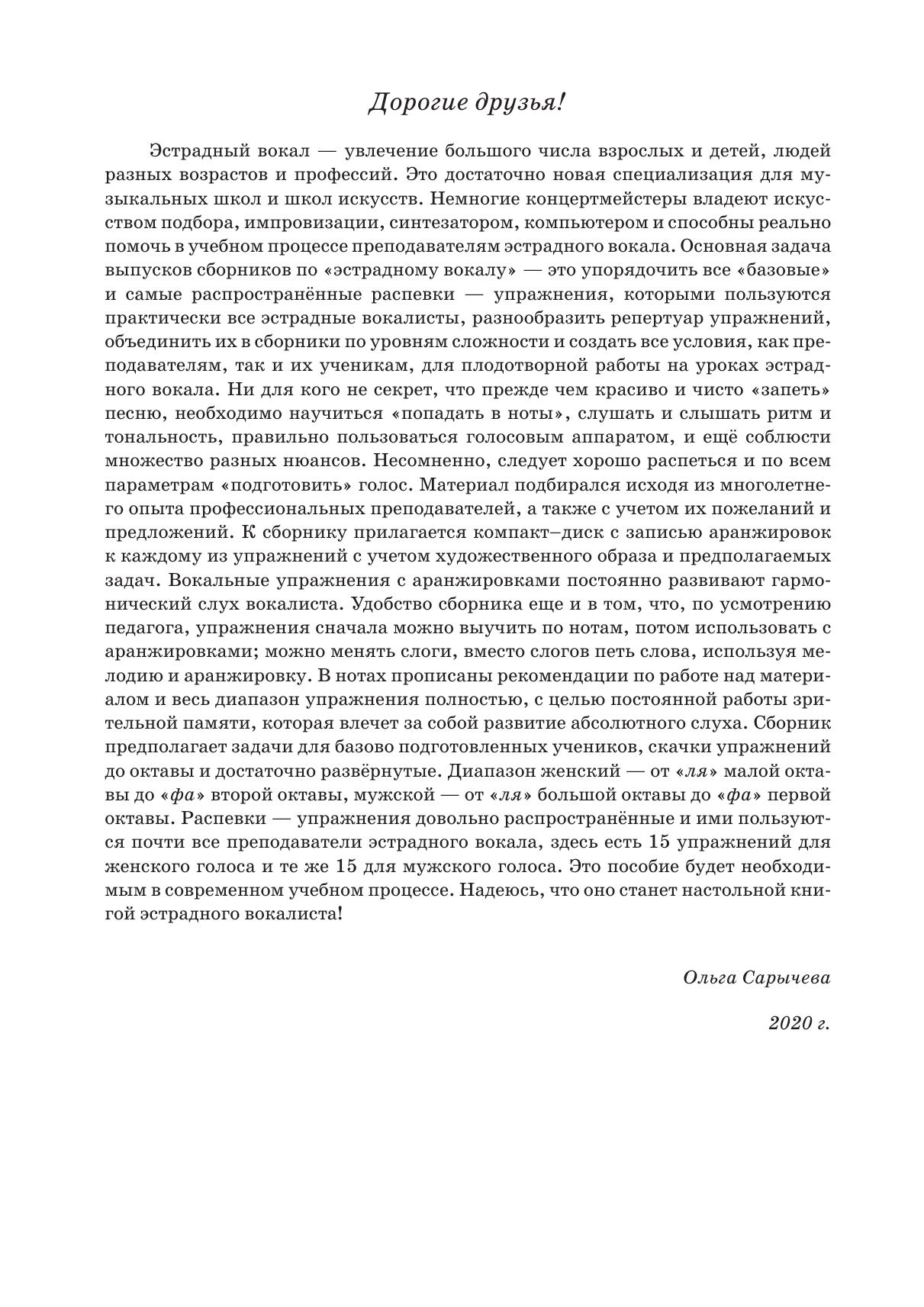 Сборник адресован преподавателям эстрадного вокала в помощь в учебном процессе, а так же действующим эстрадным вокалистам и ученикам с базовыми навыками пения. Основная задача выпусков сборников по «эстрадному вокалу» - это упорядочить все «базовые» и самые распространённые распевки - упражнения, которыми пользуются практически все эстрадные вокалисты, разнообразить репертуар упражнений, создать все условия, как преподавателям, так и их ученикам, для плодотворной работы на уроках эстрадного вокала. Вокальные упражнения с аранжировками постоянно развивают гармонический слух вокалиста, в виду этого к сборнику прилагается компакт-диск с записью аранжировок к каждому из упражнений с учетом художественного образа и предполагаемых задач.