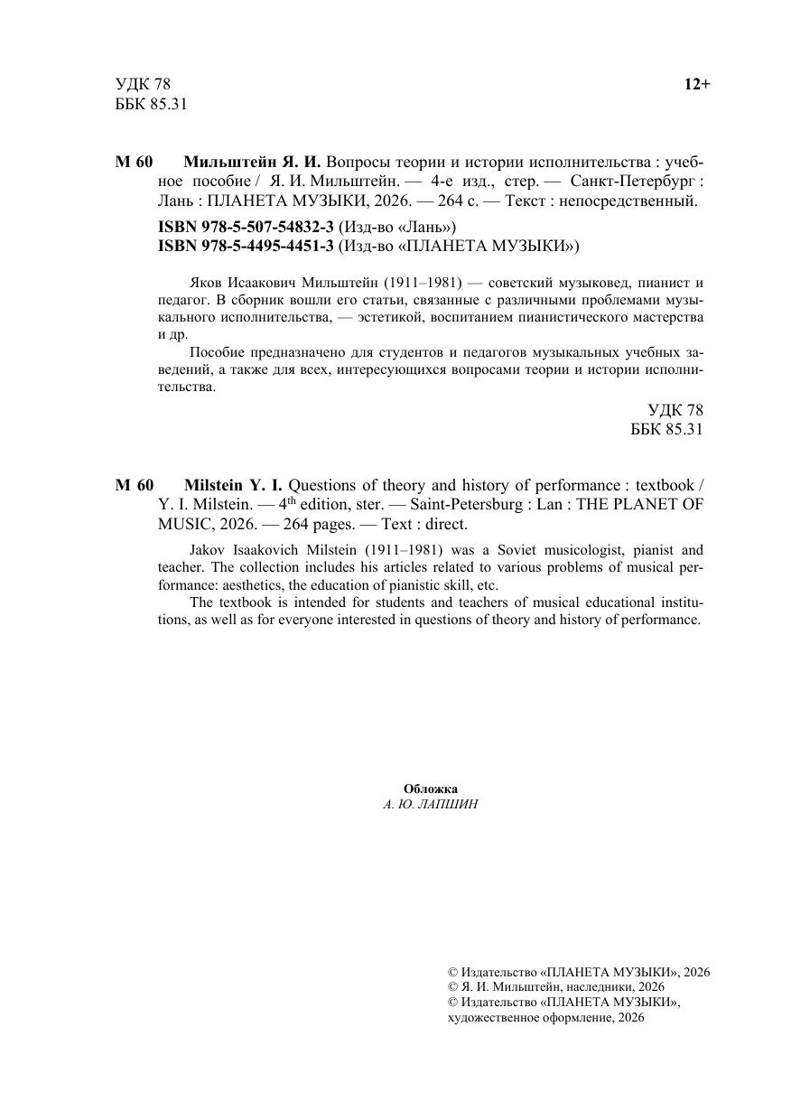 Яков Исаакович Мильштейн (1911–1981) — советский музыковед, пианист и педагог. В сборник вошли его статьи, связанные с различными проблемами музыкального исполнительства, — эстетикой, воспитанием пианистического мастерства и др. Пособие предназначено для студентов и педагогов музыкальных учебных заведений, а также для всех, интересующихся вопросами теории и истории исполнительства. Jakov Isaakovich Milstein (1911–1981) was a Soviet musicologist, pianist and teacher. The collection includes his articles related to various problems of musical performance: aesthetics, the education of pianistic skill, etc. The textbook is intended for students and teachers of musical educational institutions, as well as for everyone interested in questions of theory and history of performance.