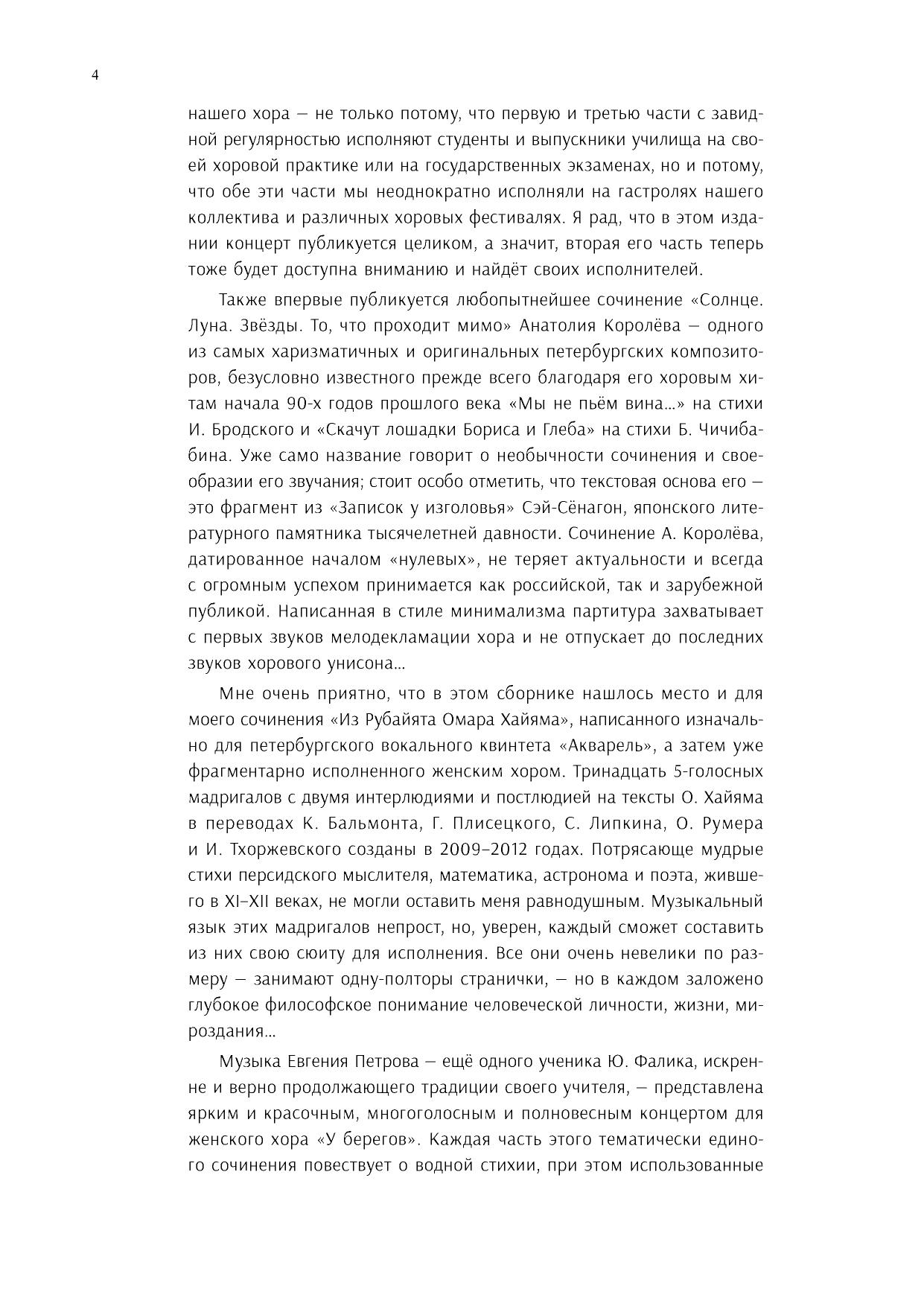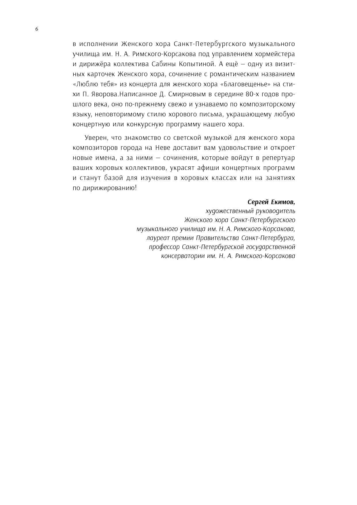 В предлагаемый вашему вниманию сборник включены светские сочинения для женского хора a cappella. Они написаны композиторами, которые работают в жанре хоровой музыки многие годы. Все эти произведения, несомненно, стоило собрать под одной обложкой, дабы хормейстерам было удобно познакомиться с материалом высокой художественной ценности для включения его в свои концертные программы.Практически все публикуемые опусы создавались в последние два десятилетия специально для Женского хора Санкт-Петербургского музыкального училища им. Н. А. Римского-Корсакова либо были ему посвящены. Этот коллектив и стал их первым исполнителем.