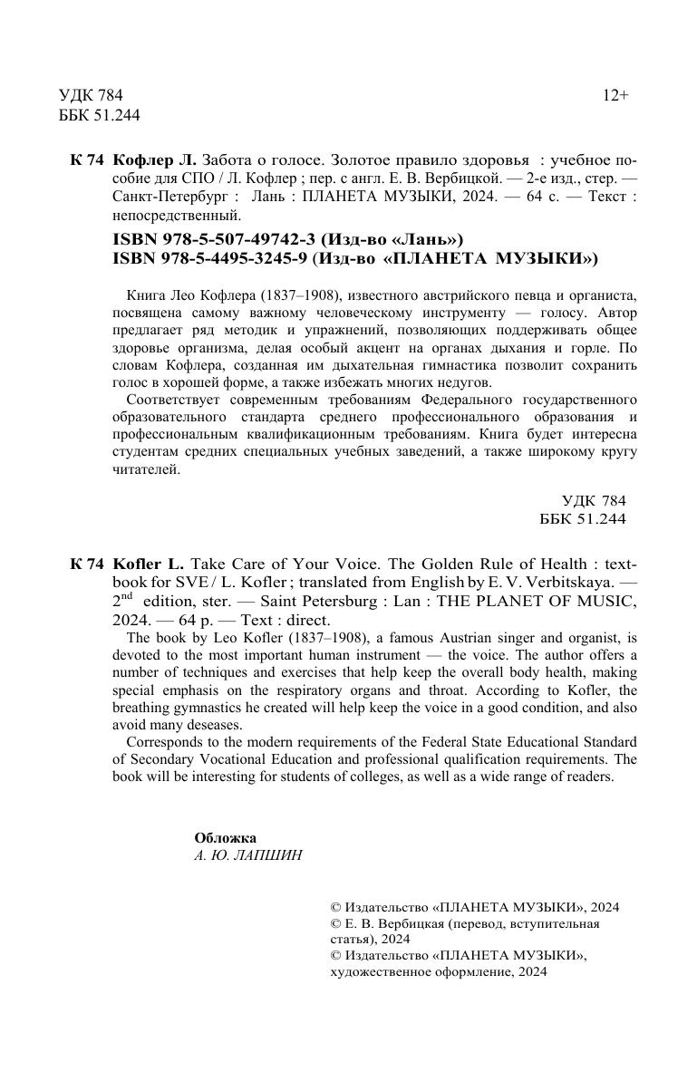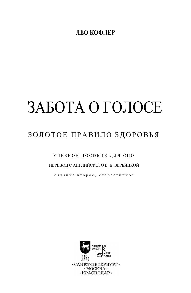 Книга Лео Кофлера (1837 - 1908), известного австрийского певца и органиста, посвящена самому важному человеческому инструменту — голосу. Автор предлагает ряд методик и упражнений, позволяющих поддерживать общее здоровье организма, делая особый акцент на органах дыхания и горле. По словам Кофлера, созданная им дыхательная гимнастика позволит сохранить голос в хорошей форме, а также избежать многих недугов. Соответствует современным требованиям Федерального государственного образовательного стандарта среднего профессионального образования и профессиональным квалификационным требованиям. Книга будет интересна студентам средних специальных учебных заведений, а также широкому кругу читателей. The book by Leo Kofler (1837–1908), a famous Austrian singer and organist, is devoted to the most important human instrument – the voice. The author offers a number of techniques and exercises that help keep the overall body health, making special emphasis on the respiratory organs and throat. According to Kofler, the breathing gymnastics he created will help keep the voice in a good condition, and also avoid many deseases. Corresponds to the modern requirements of the Federal State Educational Standard of Secondary Vocational Education and professional qualification requirements. The book will be interesting for students of colleges, as well as a wide range of readers.