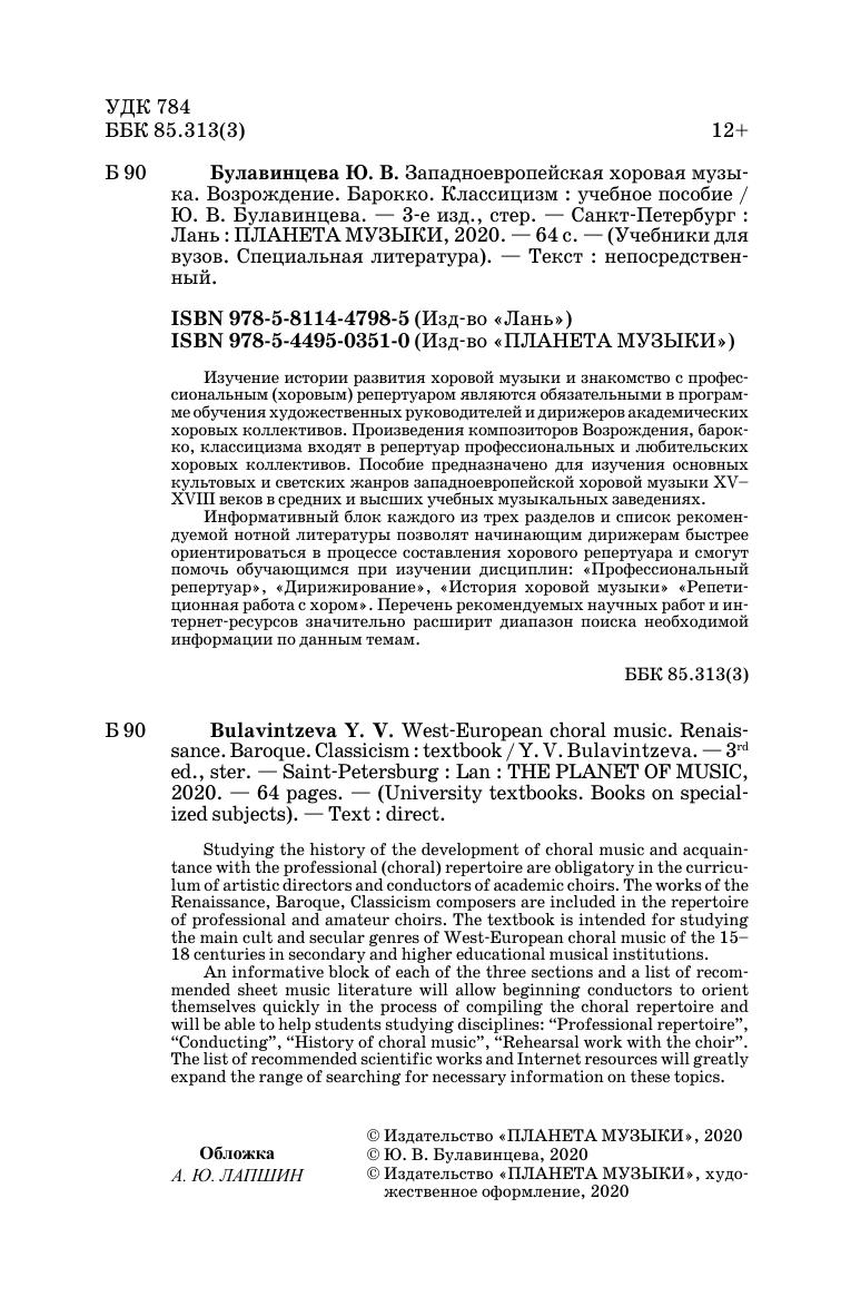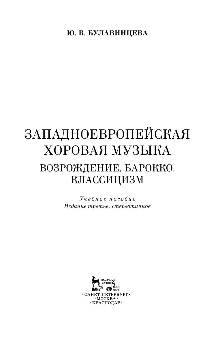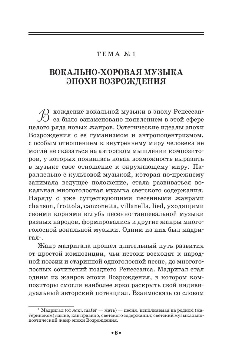 Изучение истории развития хоровой музыки и знакомство с профессиональным (хоровым) репертуаром являются обязательными в программе обучения художественных руководителей и дирижеров академических хоровых коллективов. Произведения композиторов Возрождения, барокко, классицизма входят в репертуар профессиональных и любительских хоровых коллективов. Пособие предназначено для изучения основных культовых и светских жанров западноевропейской хоровой музыки XV–XVIII веков в средних и высших учебных музыкальных заведениях.