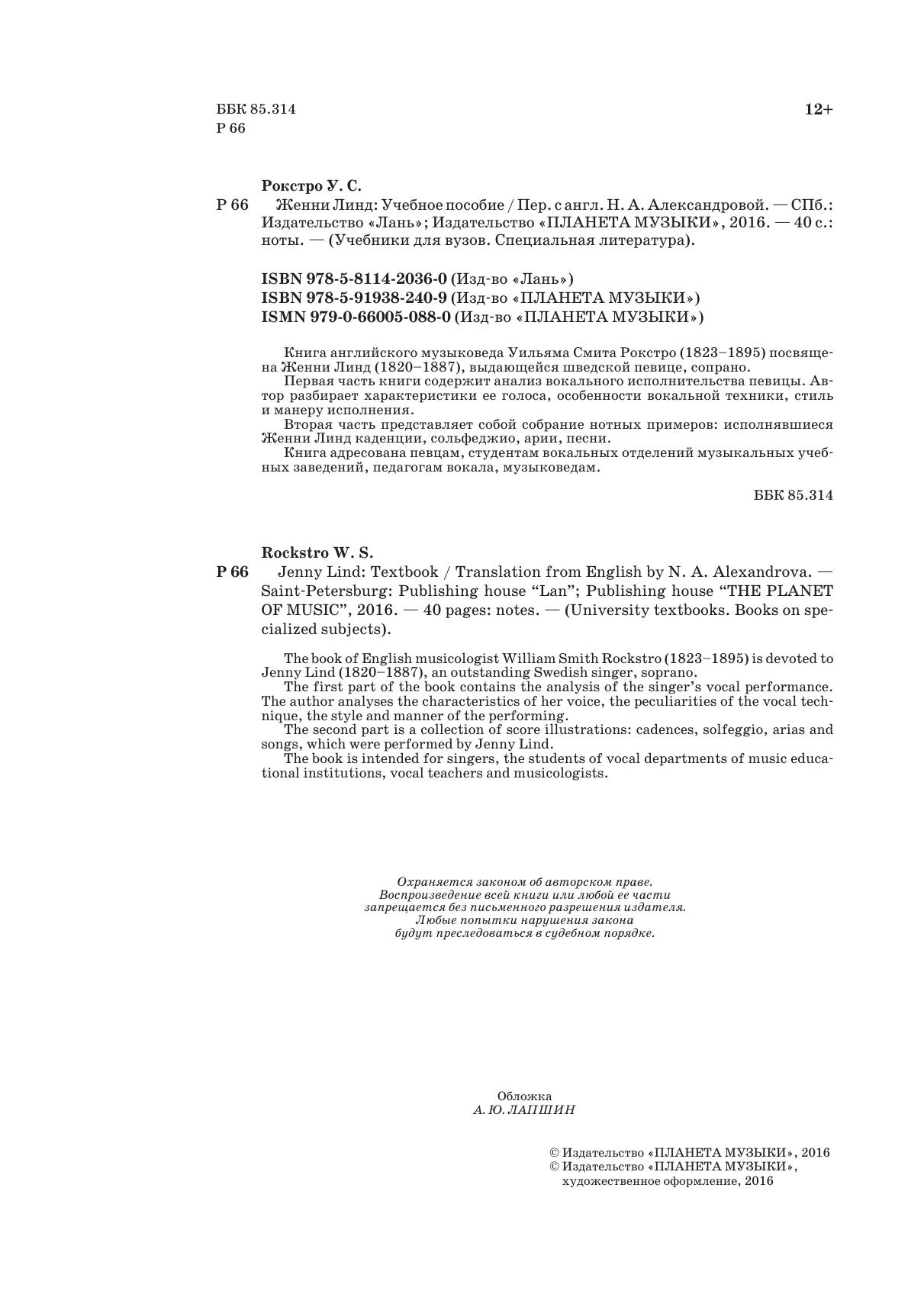 The book of English musicologist William Smith Rockstro (1823–1895) is devoted to Jenny Lind (1820–1887), an outstanding Swedish singer, soprano. The first part of the book contains the analysis of the singer’s vocal performance. The author analyses the characteristics of her voice, the peculiarities of the vocal technique, the style and manner of the performing. The second part is a collection of score illustrations: cadences, solfeggio, arias and songs, which were performed by Jenny Lind. The book is intended for singers, the students of vocal departments of music educational institutions, vocal teachers and musicologists.