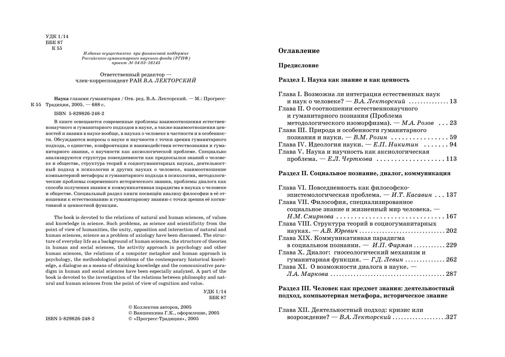 В книге освещаются современные проблемы взаимоотношения естественнонаучного и гуманитарного подходов в науке, а также взаимоотношения ценностей и знания в науке вообще, в науках о человеке в частности и в особенности. Обсуждаются вопросы о науке и научности с точки зрения гуманитарного подхода, о единстве, конфронтации и взаимодействии естествознания и гуманитарного знания, о научности как аксиологической проблеме. Специально анализируются структура повседневности как предпосылки знаний о человеке и обществе, структура теорий в социогуманитарных науках, деятельностный подход в психологии и других науках о человеке, взаимоотношение компьютерной метафоры и гуманитарного подхода в психологии, методологические проблемы современного исторического знания, проблемы диалога как способа получения знания и коммуникативная парадигма в науках о человеке и обществе. Специальный раздел книги посвящён анализу философии в её отношении к естествознанию и гуманитарному знанию с точки зрения её когнитивной и ценностной функции.