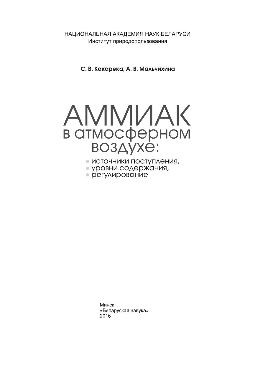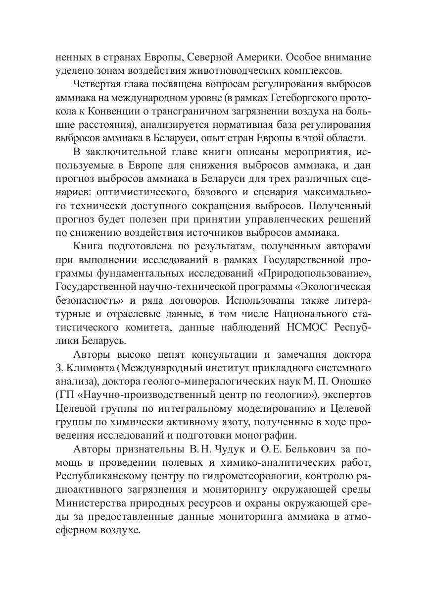Монография посвящена проблемам, связанным с поступлением аммиака в атмосферный воздух. Приведены характеристика свойств аммиака, подходы к нормированию и оценке выбросов. Выполнена оценка выбросов аммиака в Беларуси от основных категорий источников, приведена серия картосхем выбросов. Охарактеризованы уровни содержания аммиака в атмосферном воздухе городов Беларуси по сравнению с городами Европы. Приведены результаты исследований содержания аммиака в атмосферном воздухе в зонах воздействия животноводческих комплексов. Описаны меры по снижению выбросов аммиака от основных источников, в первую очередь в сельском хозяйстве, подходы к их регулированию, представлен прогноз выбросов аммиака для различных сценариев экономического развития страны. Рассчитана на специалистов в области природопользования и охраны окружающей среды, студентов вузов, всех, интересующихcя экологическими проблемами.