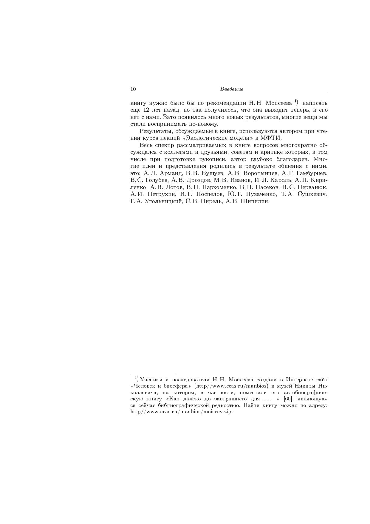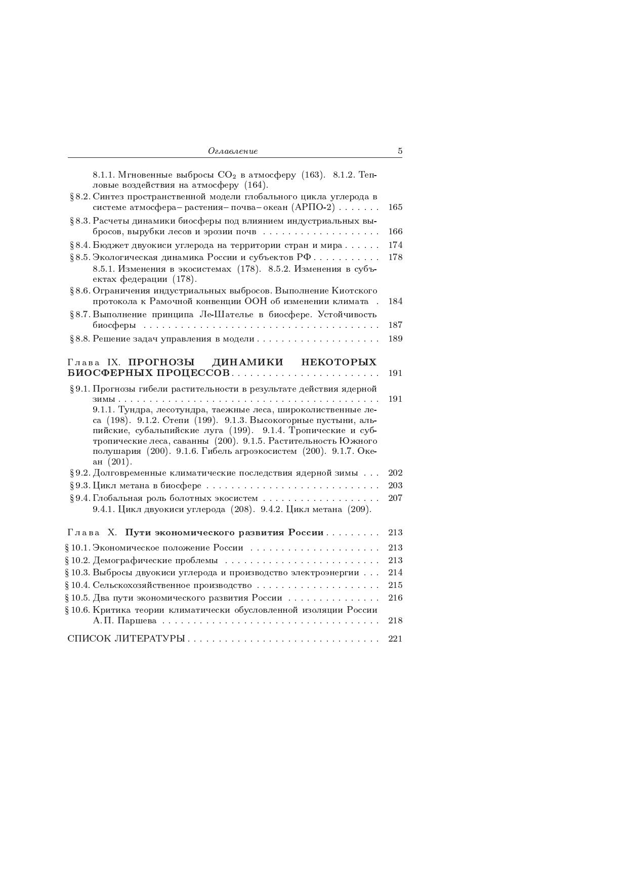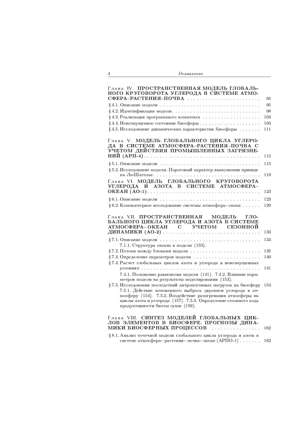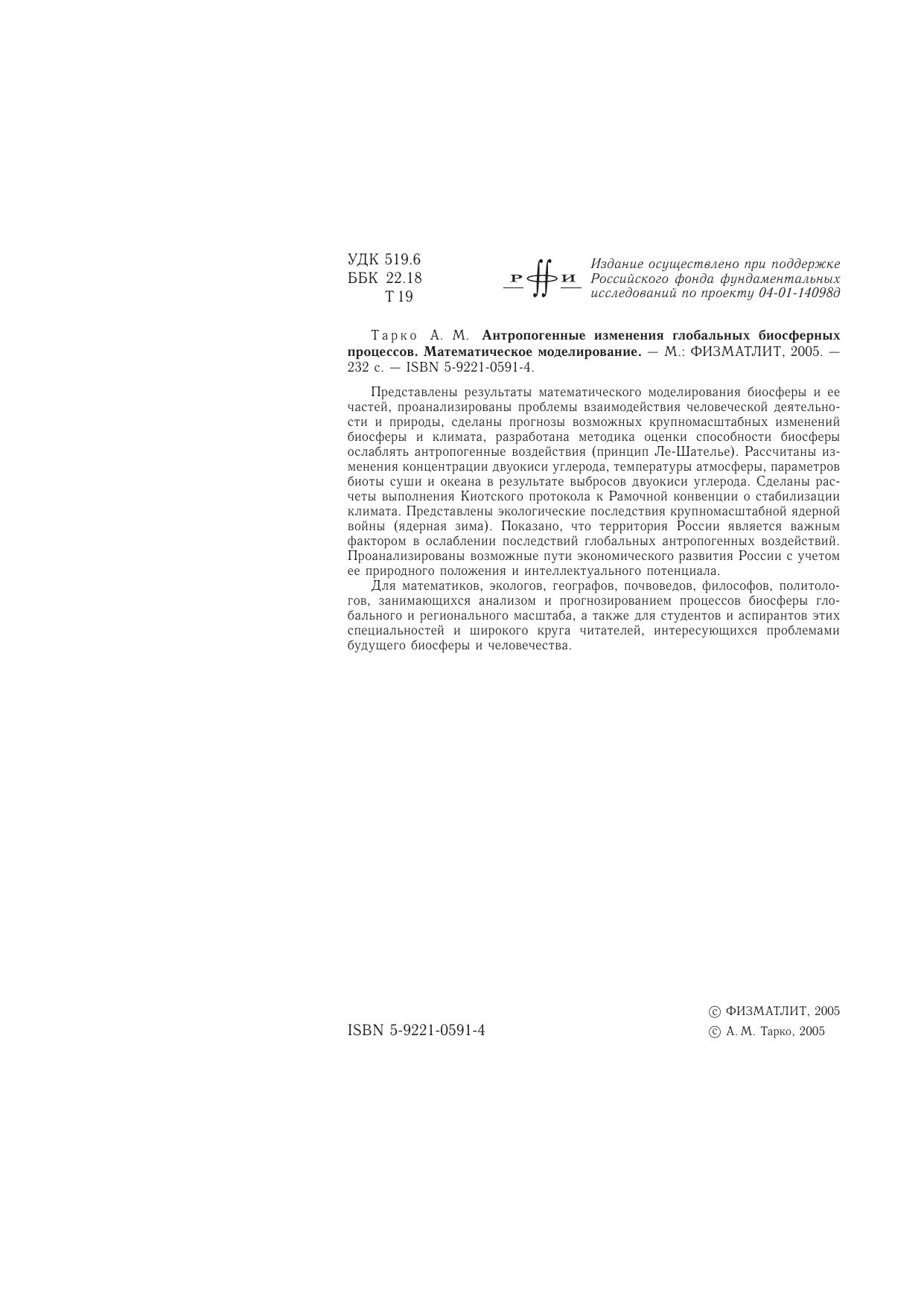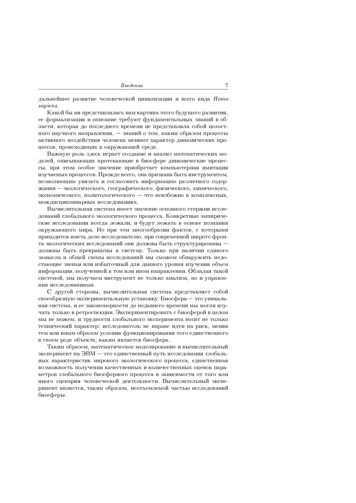 Представлены результаты математического моделирования биосферы и ее частей, проанализированы проблемы взаимодействия человеческой деятельности и природы, сделаны прогнозы возможных крупномасштабных изменений биосферы и климата, разработана методика оценки способности биосферы ослаблять антропогенные воздействия (принцип Ле-Шателье). Рассчитаны изменения концентрации двуокиси углерода, температуры атмосферы, параметров биоты суши и океана в результате выбросов двуокиси углерода. Сделаны расчеты выполнения Киотского протокола к Рамочной конвенции о стабилизации климата. Представлены экологические последствия крупномасштабной ядерной войны (ядерная зима). Показано, что территория России является важным фактором в ослаблении последствий глобальных антропогенных воздействий. Проанализированы возможные пути экономического развития России с учетом ее природного положения и интеллектуального потенциала. Для математиков, экологов, географов, почвоведов, философов, политологов, занимающихся анализом и прогнозированием процессов биосферы глобального и регионального масштаба, а также для студентов и аспирантов этих специальностей и широкого круга читателей, интересующихся проблемами будущего биосферы и человечества.