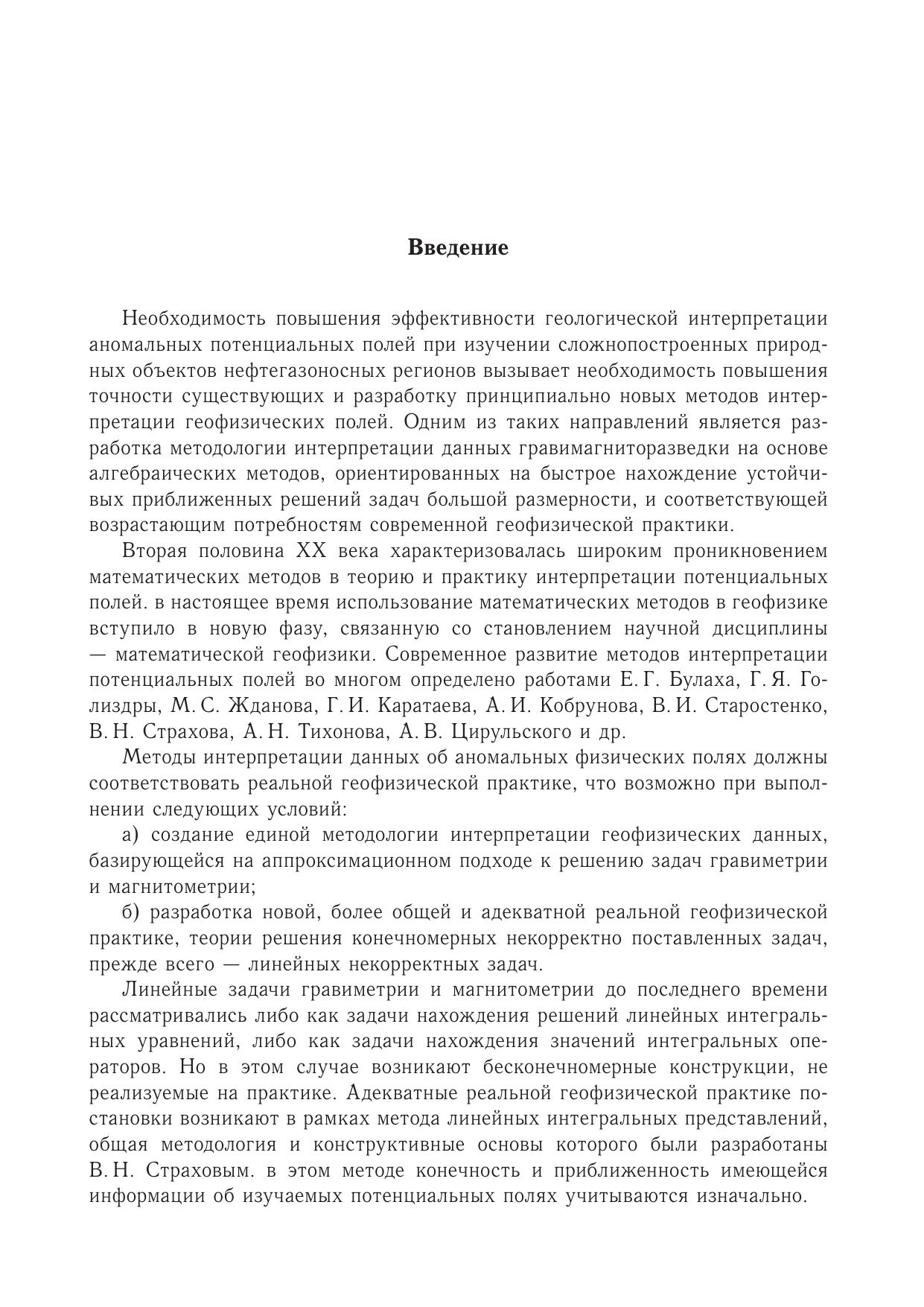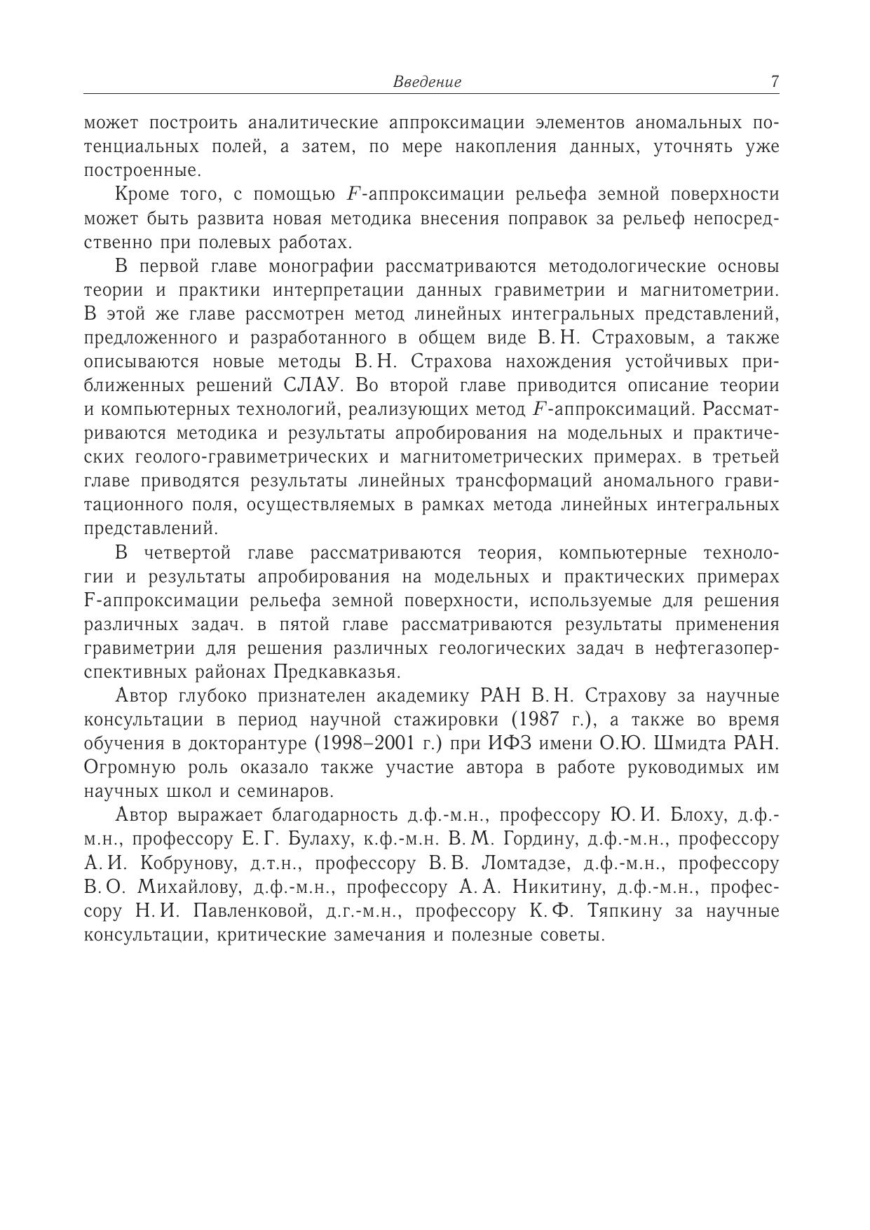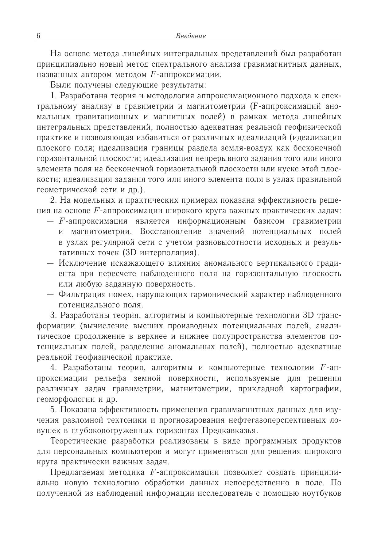 На основе метода линейных интегральных представлений разработан принципиально новый метод спектрального анализа гравимагнитных данных (методом F-аппроксимации), полностью адекватный реальной геофизической практике и позволяющий избавиться от различных идеализаций (идеализация плоского поля идеализация границы раздела земля–воздух как бесконечной горизонтальной плоскости идеализация непрерывного задания того или иного элемента поля на бесконечной горизонтальной плоскости или куске этой плоскости идеализация задания того или иного элемента поля в узлах правильной геометрической сети и др.). На модельных и практических примерах показана эффективность решения на основе F-аппроксимации широкого круга задач (3D-интерполяция, исключение искажающего влияния аномального вертикального градиента при пересчете наблюденного поля на любую заданную поверхность, фильтрация помех, нарушающих гармонический характер наблюденного потенциального поля). Разработаны теория, алгоритмы и компьютерные технологии 3D-трансформации (вычисление высших производных потенциальных полей, аналитическое продолжение в верхнее и нижнее полупространства элементов потенциальных полей, разделение аномальных полей) и F-аппроксимации рельефа земной поверхности, используемые для решения различных задач гравиметрии, магнитометрии, прикладной картографии, геоморфологии и др. Показана эффективность применения гравимагнитных данных для изучения разломной тектоники и прогнозирования нефтегазоперспективных ловушек в глубокопогруженных горизонтах Предкавказья.Книга предназначена научным работникам, геофизикам, аспирантам и студентам геофизических специальностей.