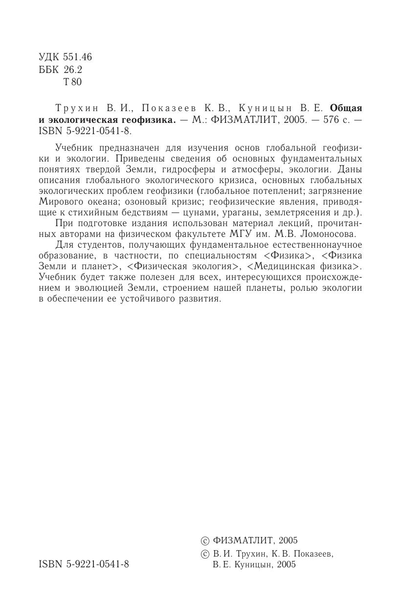 Учебник предназначен для изучения основ глобальной геофизики и экологии. Приведены сведения об основных фундаментальных понятиях твердой Земли, гидросферы и атмосферы, экологии. Даны описания глобального экологического кризиса, основных глобальных экологических проблем геофизики (глобальное потеплениt загрязнение Мирового океана озоновый кризис геофизические явления, приводящие к стихийным бедствиям — цунами, ураганы, землетрясения и др.). При подготовке издания использован материал лекций, прочитанных авторами на физическом факультете МГУ им. М.В. Ломоносова. Для студентов, получающих фундаментальное естественнонаучное образование, в частности, по специальностям <Физика>, <Физика Земли и планет>, <Физическая экология>, <Медицинская физика>. Учебник будет также полезен для всех, интересующихся происхождением и эволюцией Земли, строением нашей планеты, ролью экологии в обеспечении ее устойчивого развития.