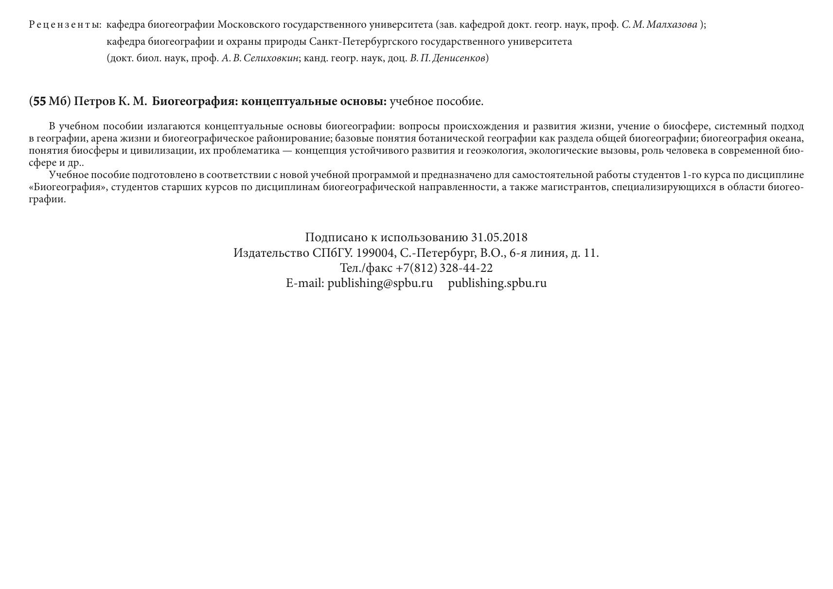 Учебное пособие подготовлено в соответствии с новой учебной программой и предназначено для самостоятельной работы студентов 1-го курса по дисциплине «Биогеография», студентов старших курсов по дисциплинам биогеографической направленности, а также магистрантов, специализирующихся в области биогеографии.