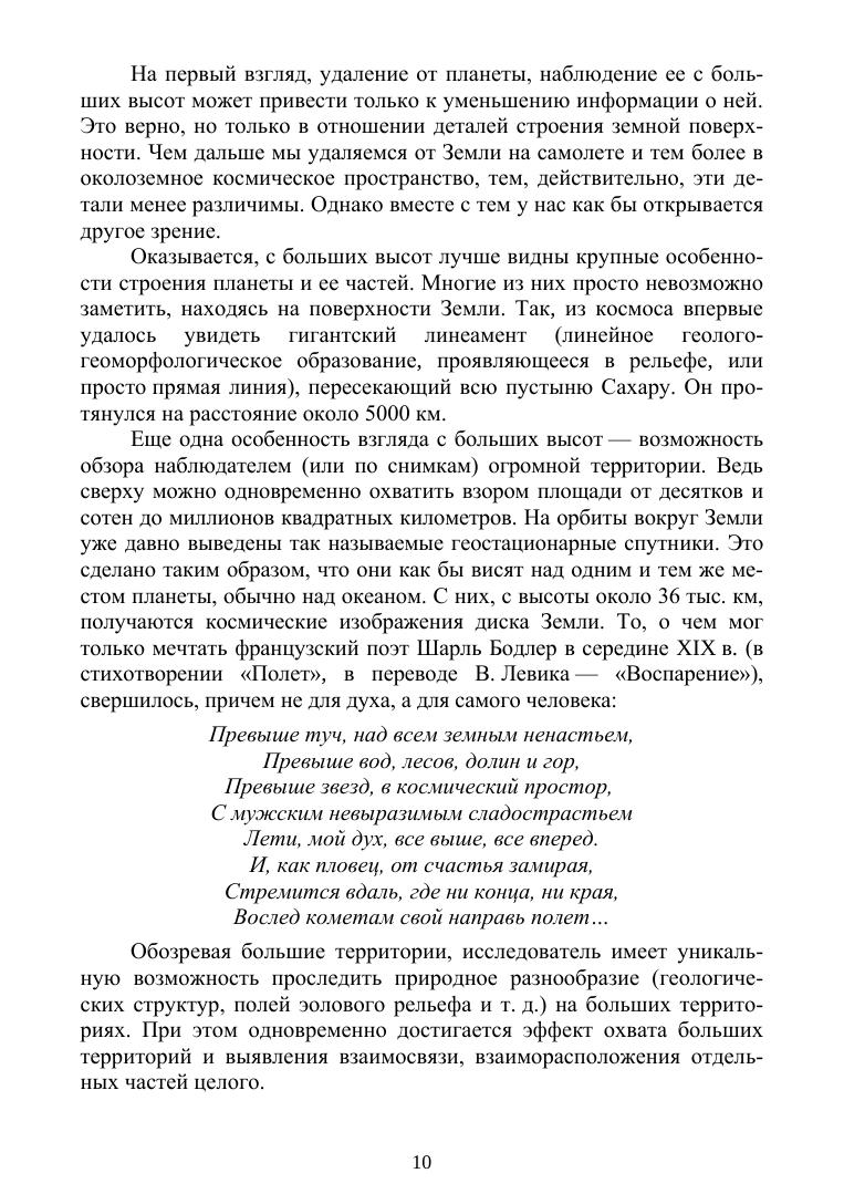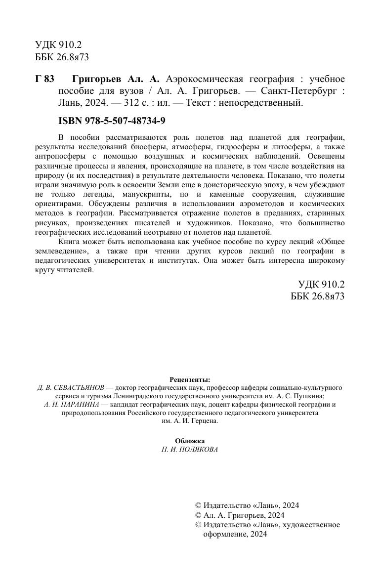 В пособии рассматриваются роль полетов над планетой для географии, результаты исследований биосферы, атмосферы, гидросферы и литосферы, а также антропосферы с помощью воздушных и космических наблюдений. Освещены различные процессы и явления, происходящие на планете, в том числе воздействия на природу (и их последствия) в результате деятельности человека. Показано, что полеты играли значимую роль в освоении Земли еще в доисторическую эпоху, в чем убеждают не только легенды, манускрипты, но и каменные сооружения, служившие ориентирами. Обсуждены различия в использовании аэрометодов и космических методов в географии. Рассматривается отражение полетов в преданиях, старинных рисунках, произведениях писателей и художников. Показано, что большинство географических исследований неотрывно от полетов над планетой. Книга может быть использована как учебное пособие по курсу лекций «Общее землеведение», а также при чтении других курсов лекций по географии в педагогических университетах и институтах. Она может быть интересна широкому кругу читателей.