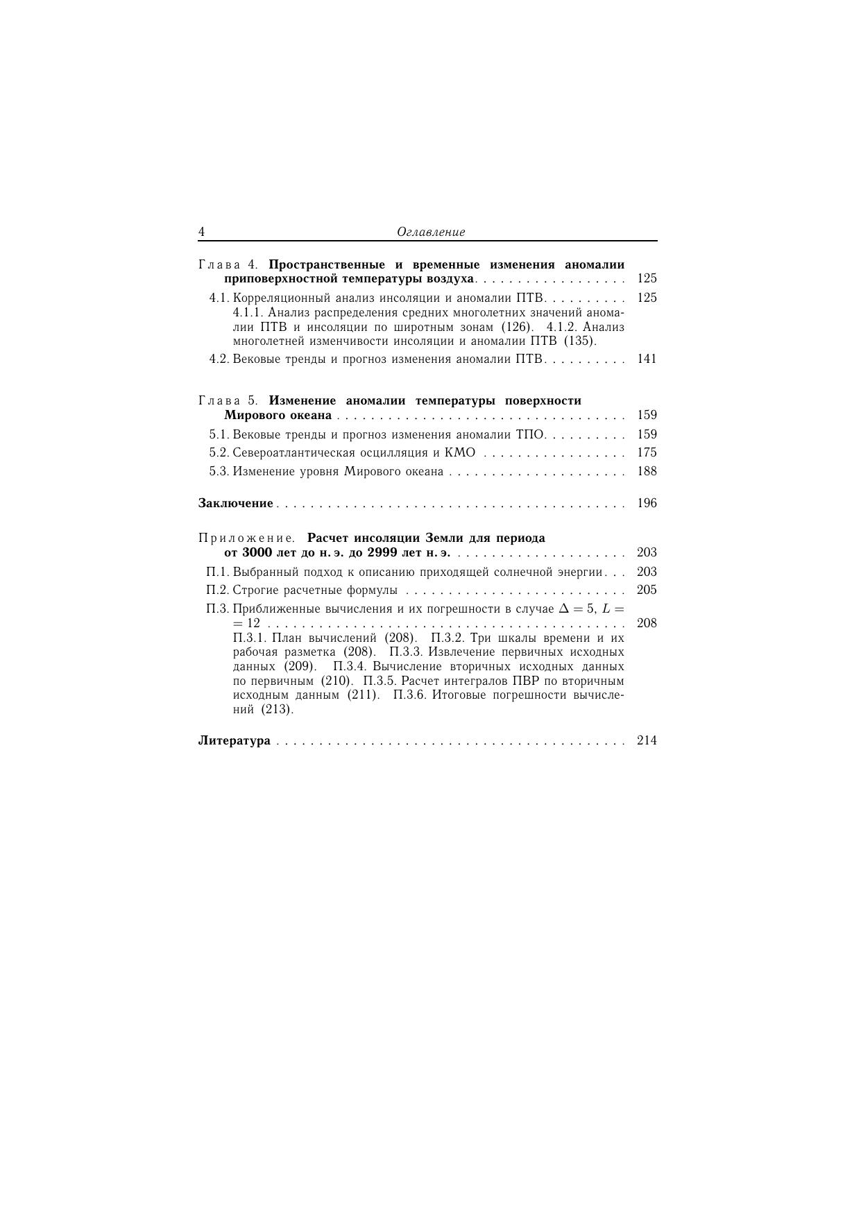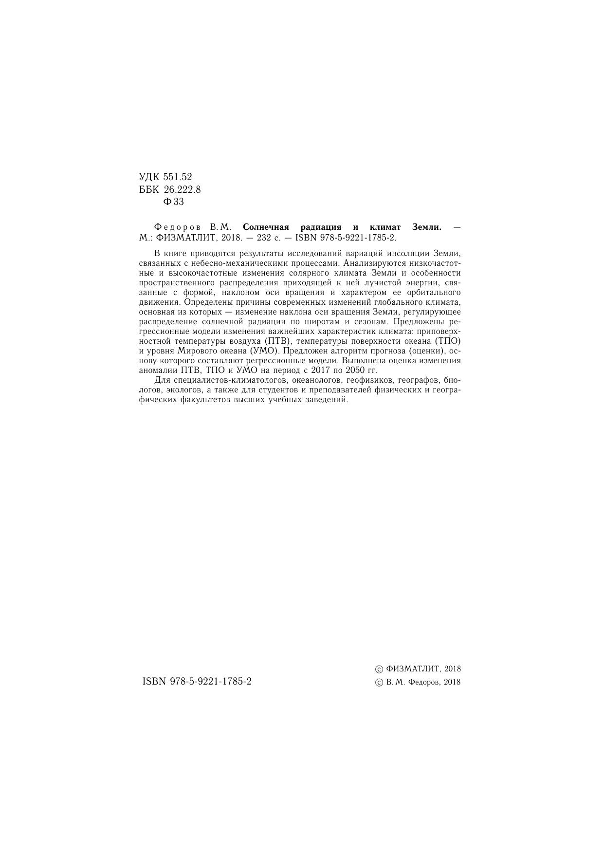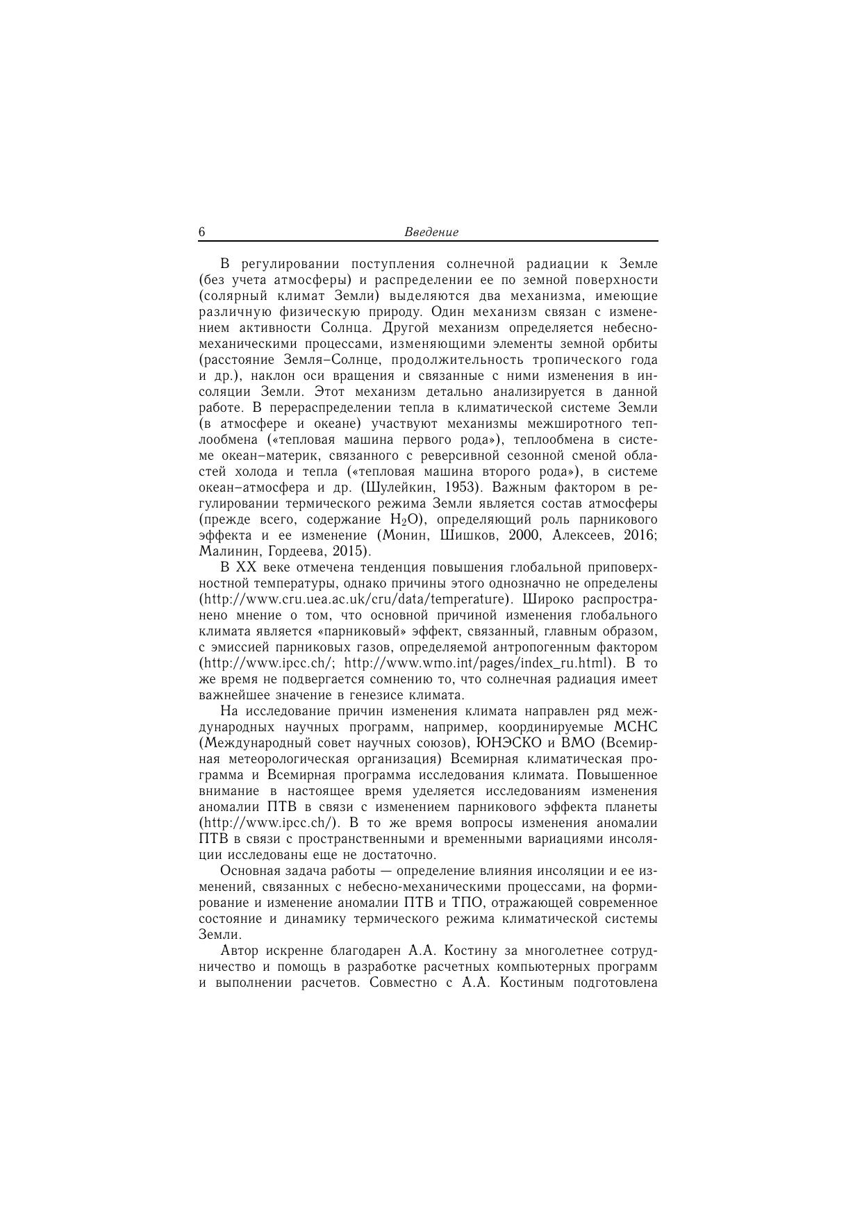 В книге приводятся результаты исследований вариаций инсоляции Земли, связанных с небесно-механическими процессами. Анализируются низкочастотные и высокочастотные изменения солярного климата Земли и особенности пространственного распределения приходящей к ней лучистой энергии, связанные с формой, наклоном оси вращения и характером ее орбитального движения. Определены причины современных изменений глобального климата, основная из которых — изменение наклона оси вращения Земли, регулирующее распределение солнечной радиации по широтам и сезонам. Предложены регрессионные модели изменения важнейших характеристик климата: приповерхностной температуры воздуха (ПТВ), температуры поверхности океана (ТПО) и уровня Мирового океана (УМО). Предложен алгоритм прогноза (оценки), основу которого составляют регрессионные модели. Выполнена оценка изменения аномалии ПТВ, ТПО и УМО на период с 2017 по 2050 гг. Для специалистов-климатологов, океанологов, геофизиков, географов, биологов, экологов, а также для студентов и преподавателей физических и географических факультетов высших учебных заведений.