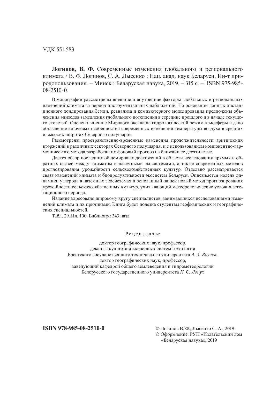 В монографии рассмотрены внешние и внутренние факторы глобальных и региональных изменений климата за период инструментальных наблюдений. На основании данных дистанционного зондирования Земли, реанализа и компьютерного моделирования предложены объяснения эпизодов замедления глобального потепления в середине прошлого и в начале текущего столетий. Оценено влияние Мирового океана на гидрологический режим атмосферы и дано объяснение ключевых особенностей современных изменений температуры воздуха в средних и высоких широтах Северного полушария. Рассмотрены пространственно-временные изменения продолжительности арктических вторжений в различных секторах Северного полушария, и с использованием компонентно-гармонического метода разработан их фоновый прогноз на ближайшее десятилетие. Дается обзор последних общемировых достижений в области исследования прямых и обратных связей между климатом и наземными экосистемами, а также современных методов прогнозирования урожайности сельскохозяйственных культур. Отдельно рассматривается связь изменений климата и биопродуктивности экосистем Беларуси. Описывается модель динамики углерода в наземных экосистемах и основанный на ней новый метод прогнозирования урожайности сельскохозяйственных культур, учитывающий метеорологические условия вегетационного периода. Издание адресовано широкому кругу специалистов, занимающихся исследованиями изменений климата и их причинами. Книга будет полезна студентам геофизических и географических специальностей.
