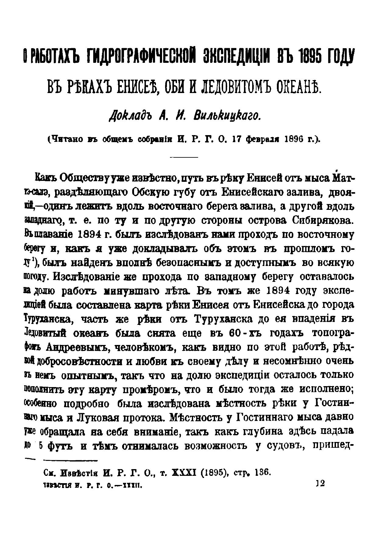 О работах гидрографической экспедиции в 1895 г. в реках Енисее, Оби и Ледовитом океане