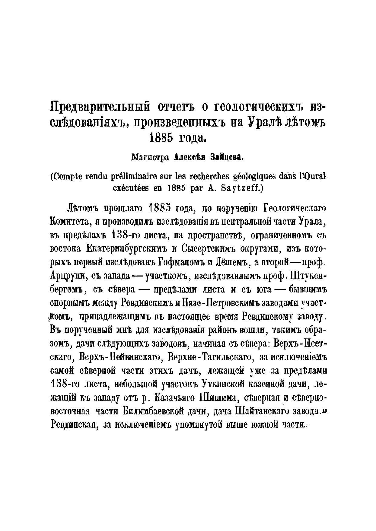 Предварительный отчет о геологическом исследовании, произведенном на Урале летом 1885года