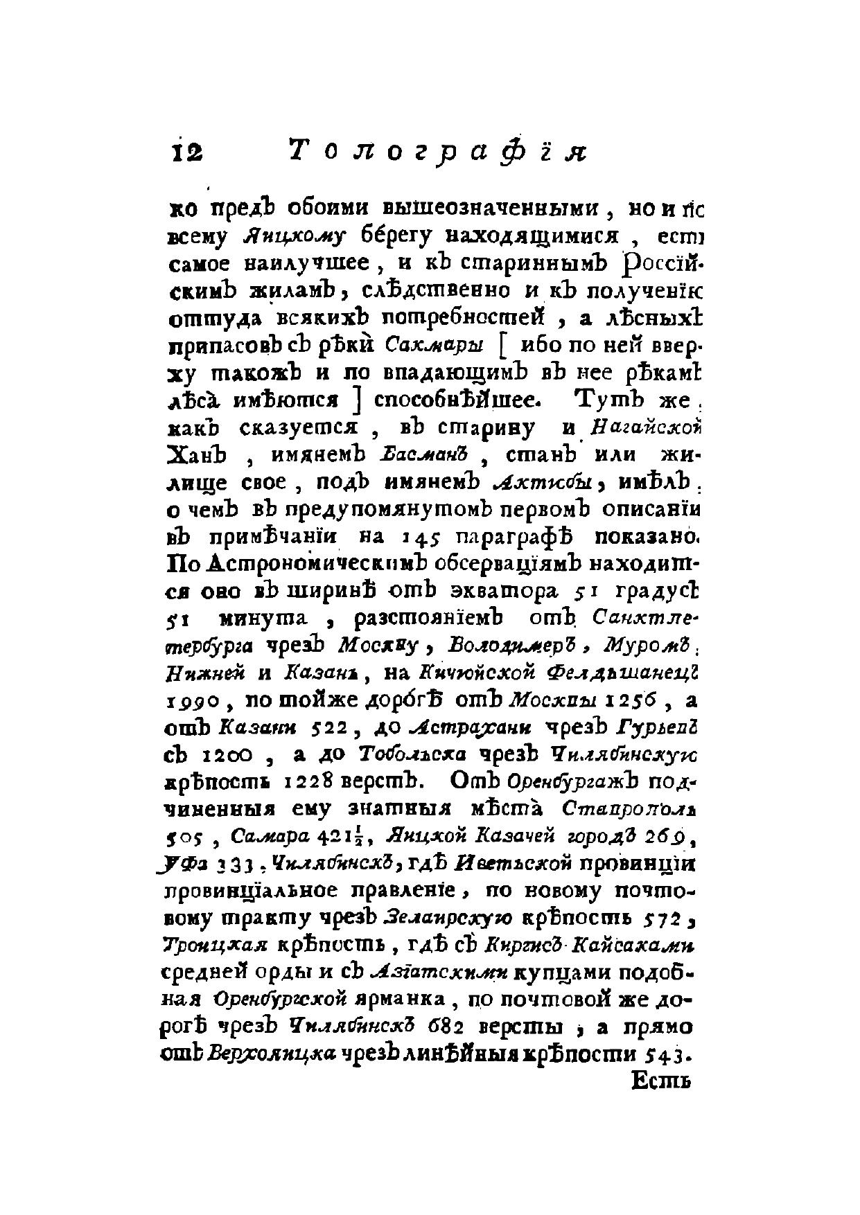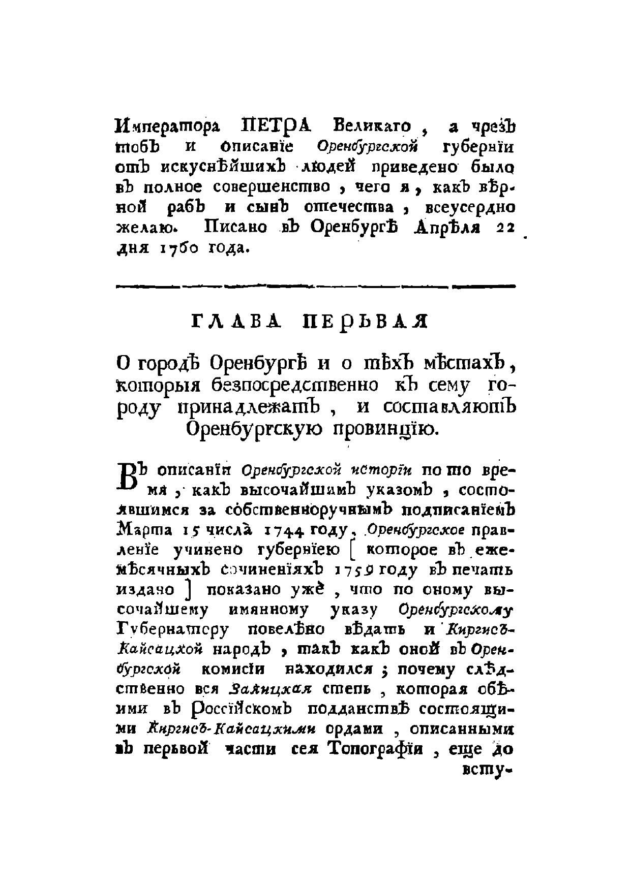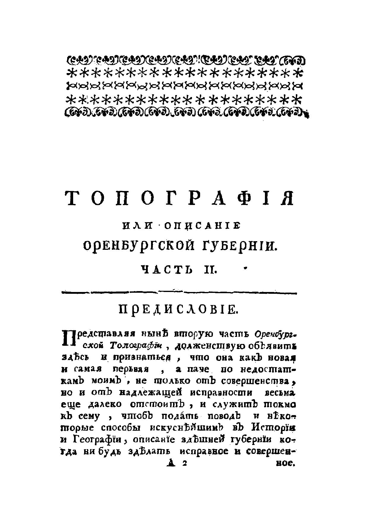 Топография Оренбургская, то есть обстоятельное описание Оренбургской губернии, сочиненное коллежским советником и императорской Академии наук корреспондентом Петром Рычковым. Часть вторая