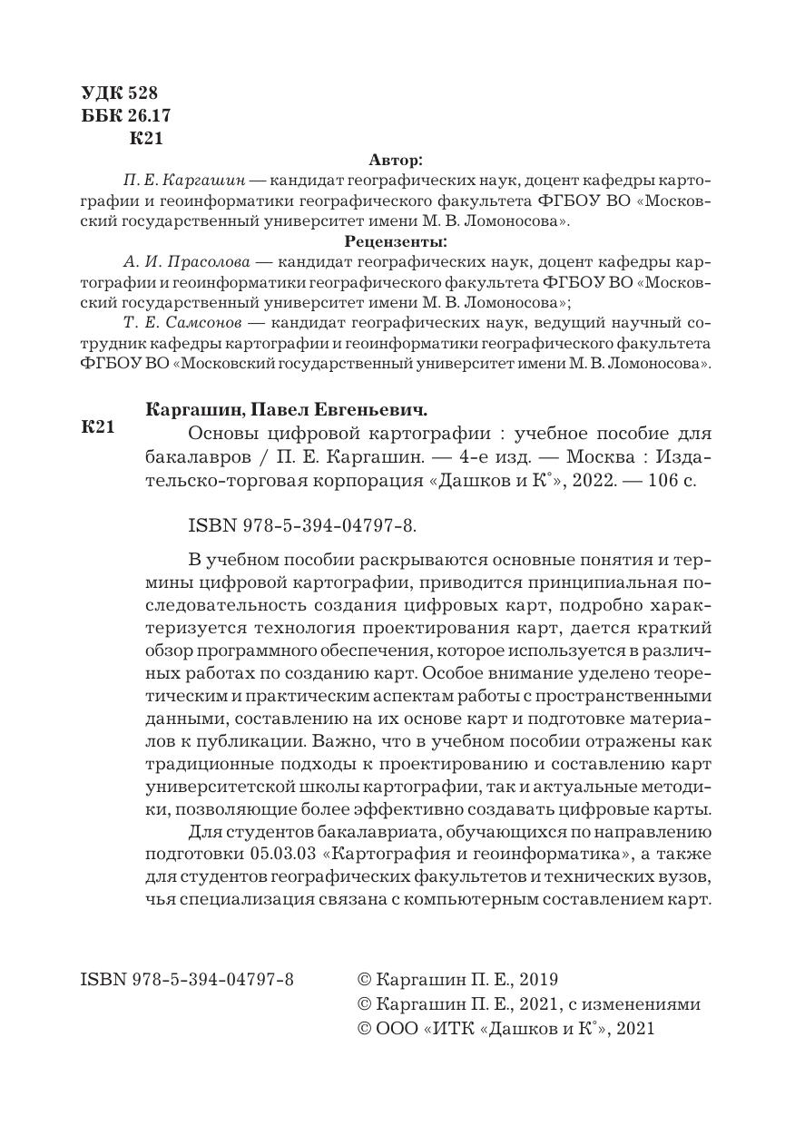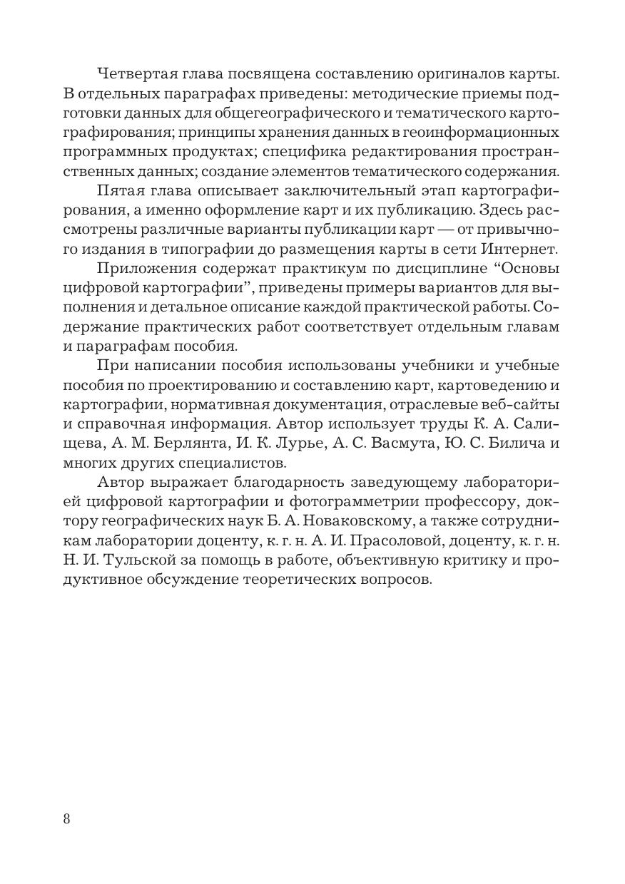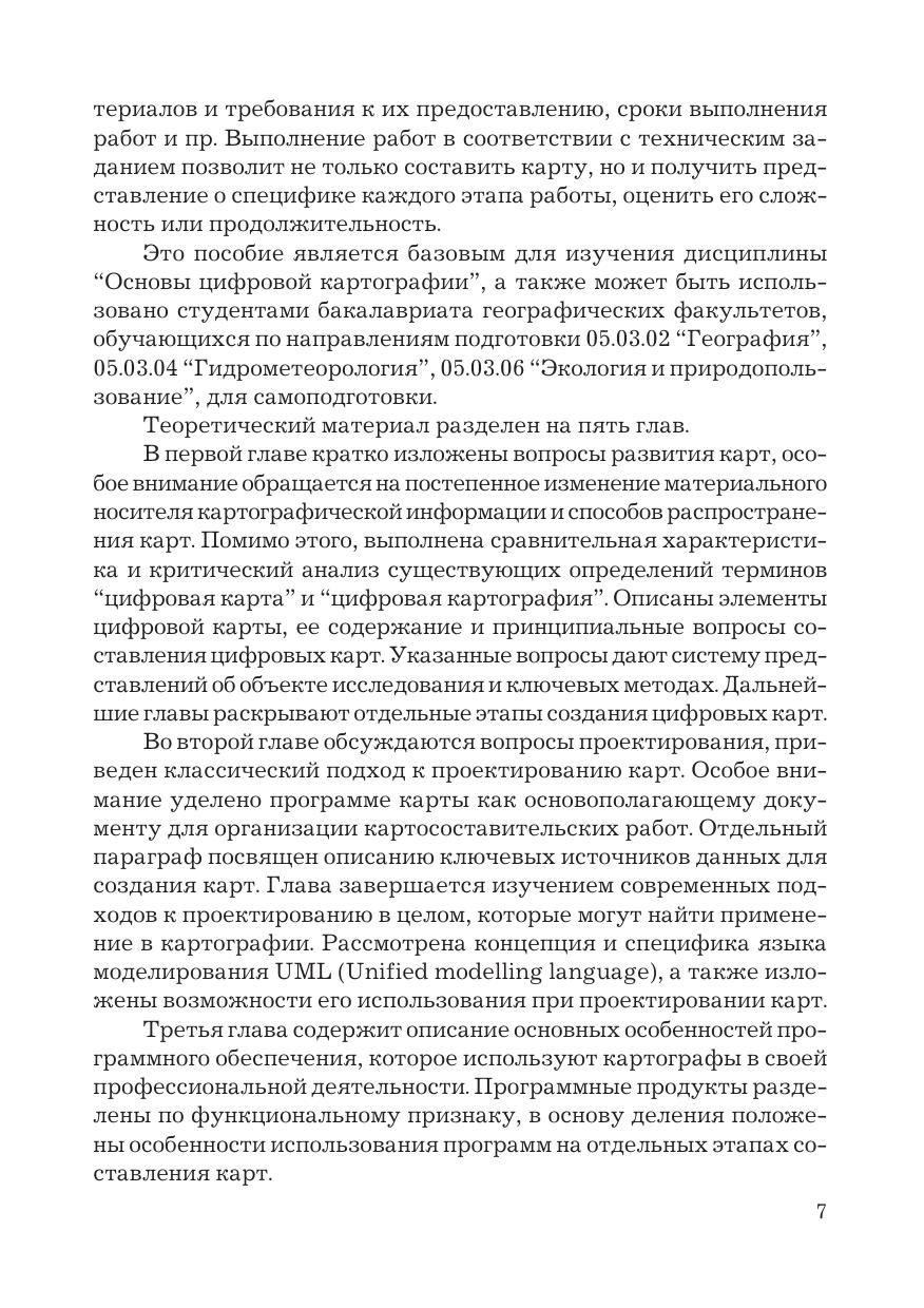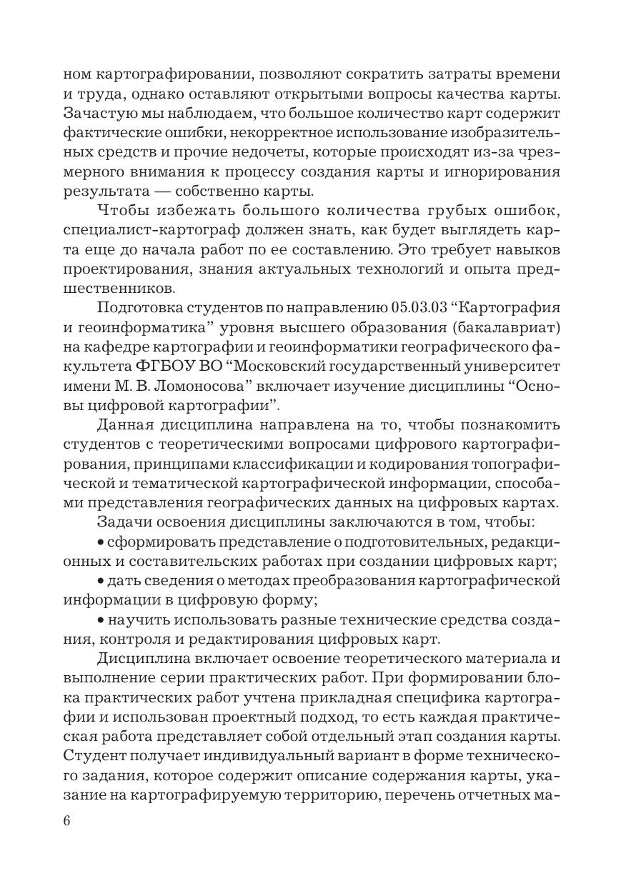 В учебном пособии раскрываются основные понятия и термины цифровой картографии, приводится принципиальная последовательность создания цифровых карт, подробно характеризуется технология проектирования карт, дается краткий обзор программного обеспечения, которое используется в различных работах по созданию карт. Особое внимание уделено теоретическим и практическим аспектам работы с пространственными данными, составлению на их основе карт и подготовке материалов к публикации. Важно, что в учебном пособии отражены как традиционные подходы к проектированию и составлению карт университетской школы картографии, так и актуальные методики, позволяющие более эффективно создавать цифровые карты. Для студентов бакалавриата, обучающихся по направлению подготовки 05.03.03 «Картография и геоинформатика», а также для студентов географических факультетов и технических вузов, чья специализация связана с компьютерным составлением карт.