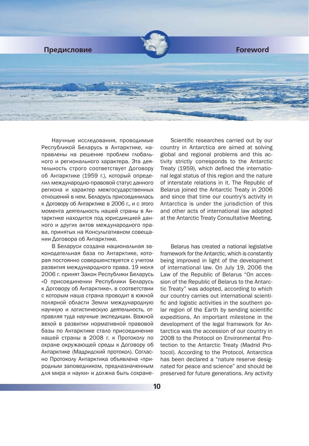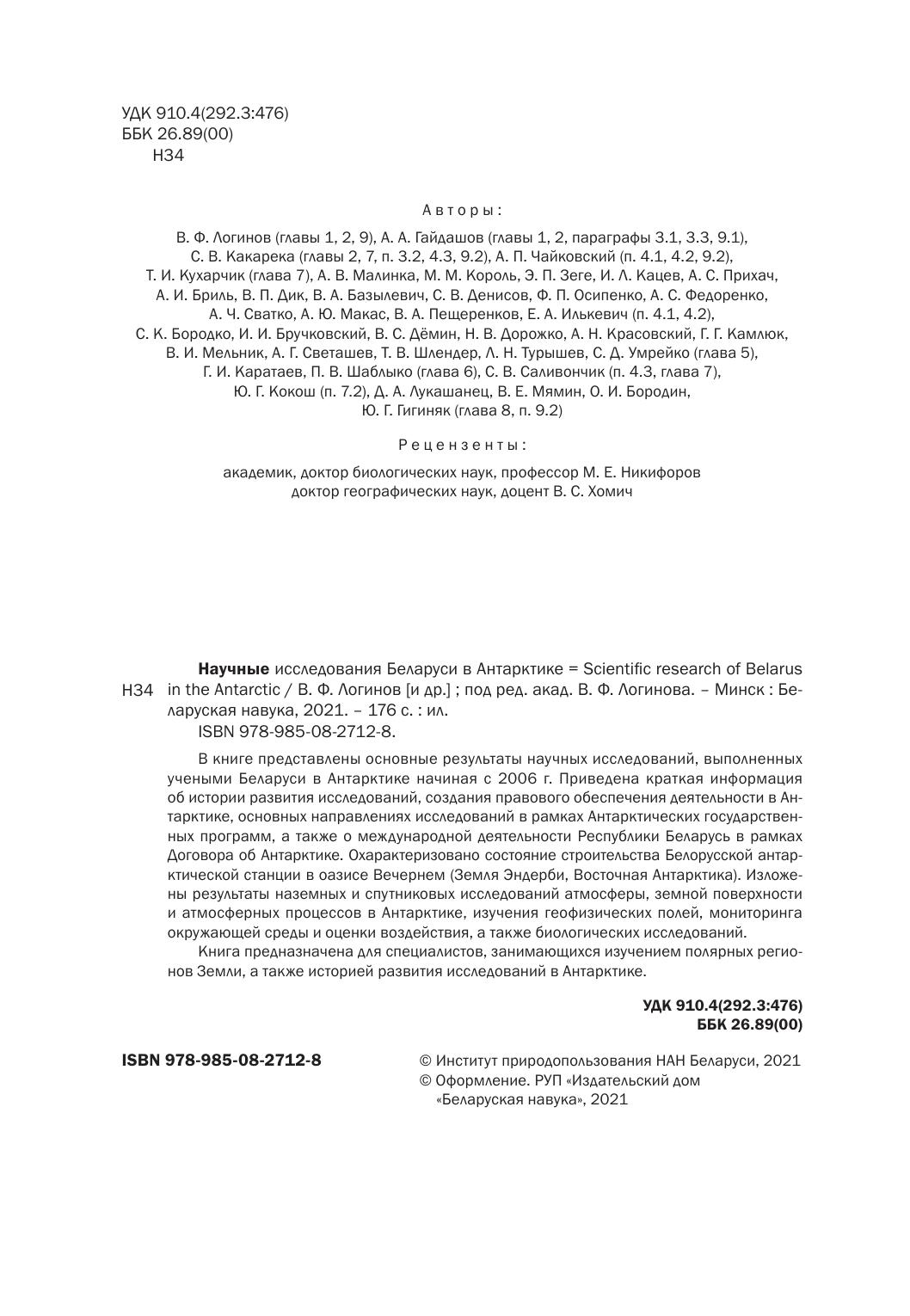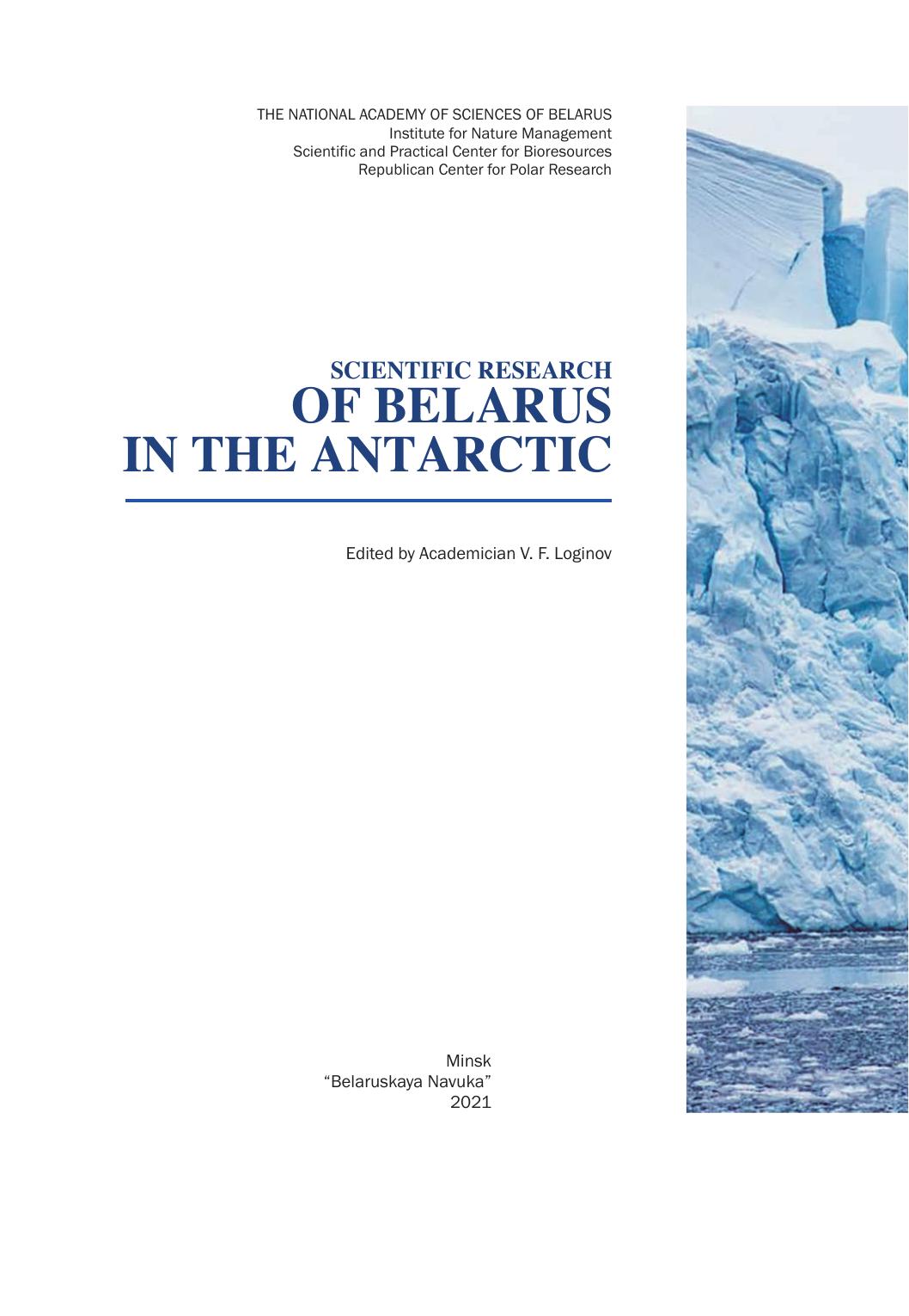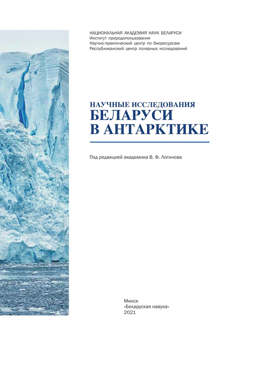 В книге представлены основные результаты научных исследований, выполненных учеными Беларуси в Антарктике начиная с 2006 г. Приведена краткая информация об истории развития исследований, создания правового обеспечения деятельности в Антарктике, основных направлениях исследований в рамках Антарктических государственных программ, а также о международной деятельности Республики Беларусь в рамках Договора об Антарктике. Охарактеризовано состояние строительства Белорусской антарктической станции в оазисе Вечернем (Земля Эндерби, Восточная Антарктика). Изложены результаты наземных и спутниковых исследований атмосферы, земной поверхности и атмосферных процессов в Антарктике, изучения геофизических полей, мониторинга окружающей среды и оценки воздействия, а также биологических исследований.