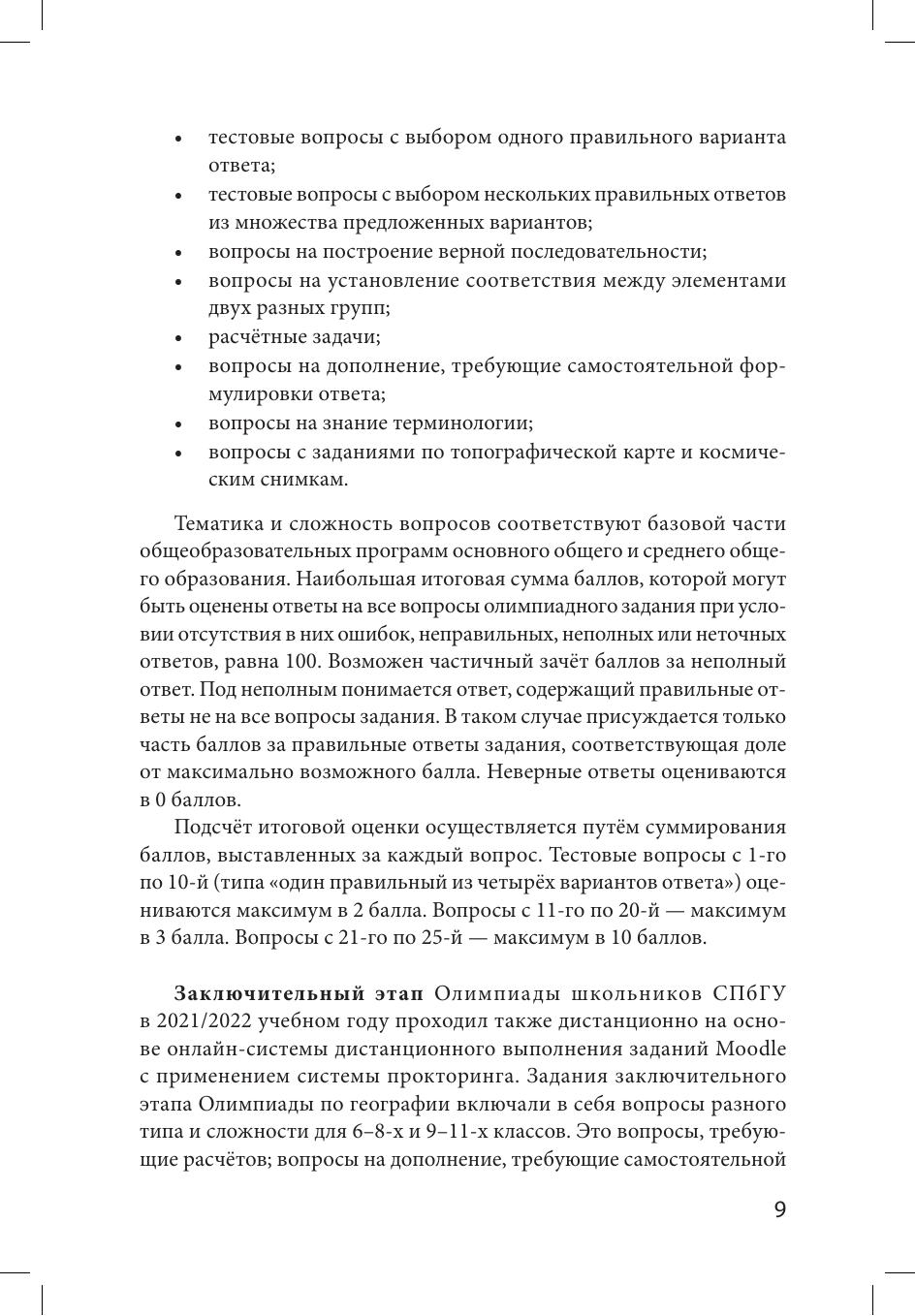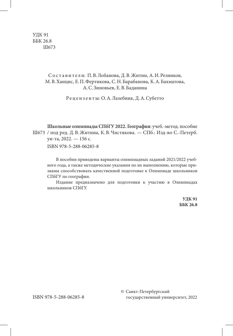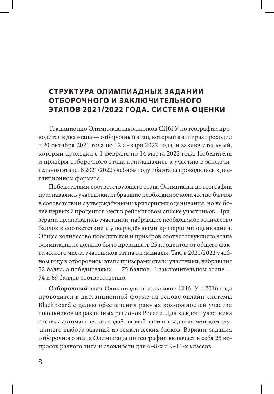 В пособии приведены варианты олимпиадных заданий 2021/2022 учебного года, а также методические указания по их выполнению, которые призваны способствовать качественной подготовке к Олимпиаде школьников СПбГУ по географии. Издание предназначено для подготовки к участию в Олимпиадах школьников СПбГУ.