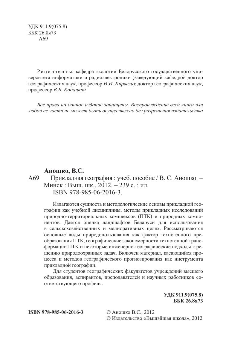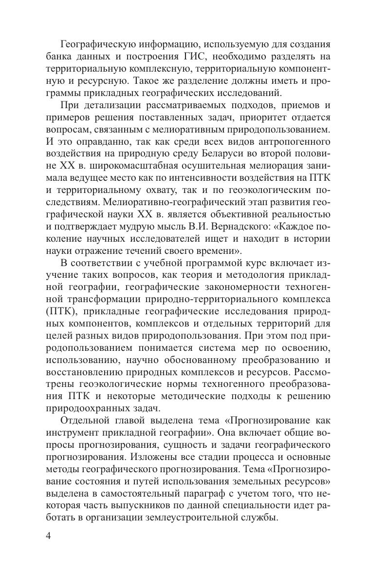 Излагаются сущность и методологические основы прикладной географии как учебной дисциплины, методы прикладных исследований природно-территориальных комплексов (ПТК) и природных компонентов. Дается оценка ландшафтов Беларуси для использования в сельскохозяйственных и мелиоративных целях. Рассматриваются основные виды природопользования как фактор техногенного преобразования ПТК, географические закономерности техногенной трансформации ПТК и некоторые инженерно-географические подходы к решению природоохранных задач. Включен материал, касающийся процесса и методов географического прогнозирования как инструмента прикладной географии. Для студентов географических факультетов вузов, аспирантов, преподавателей и научных работников соответствующего профиля.