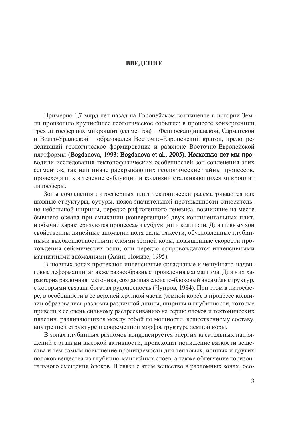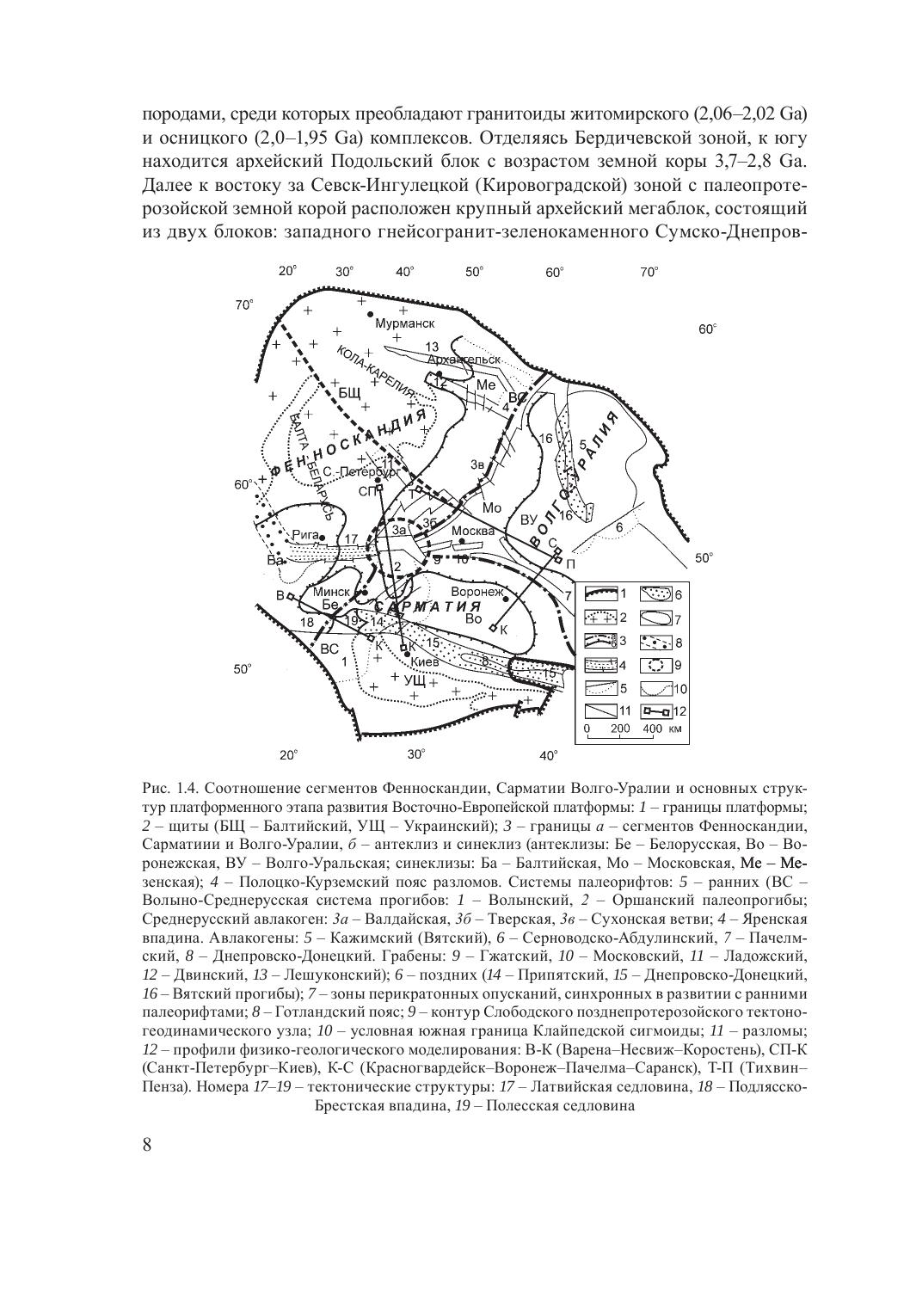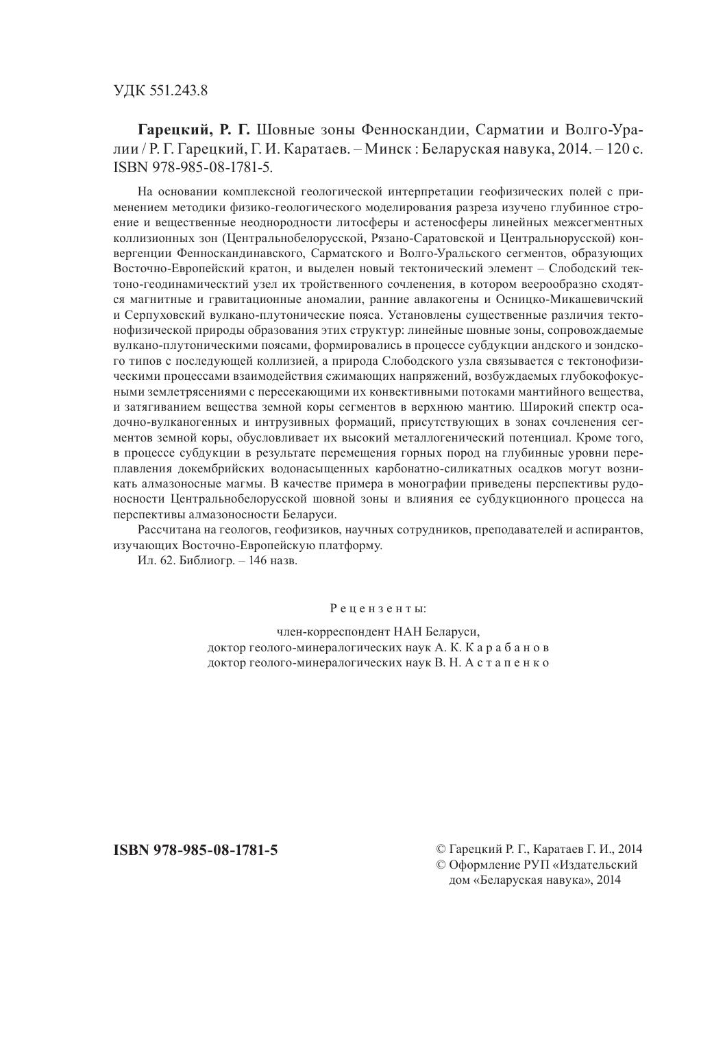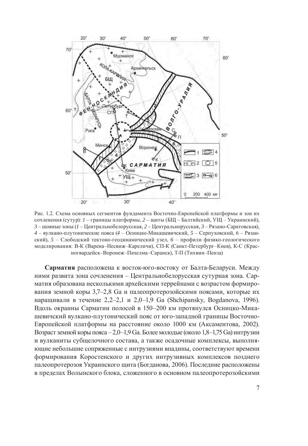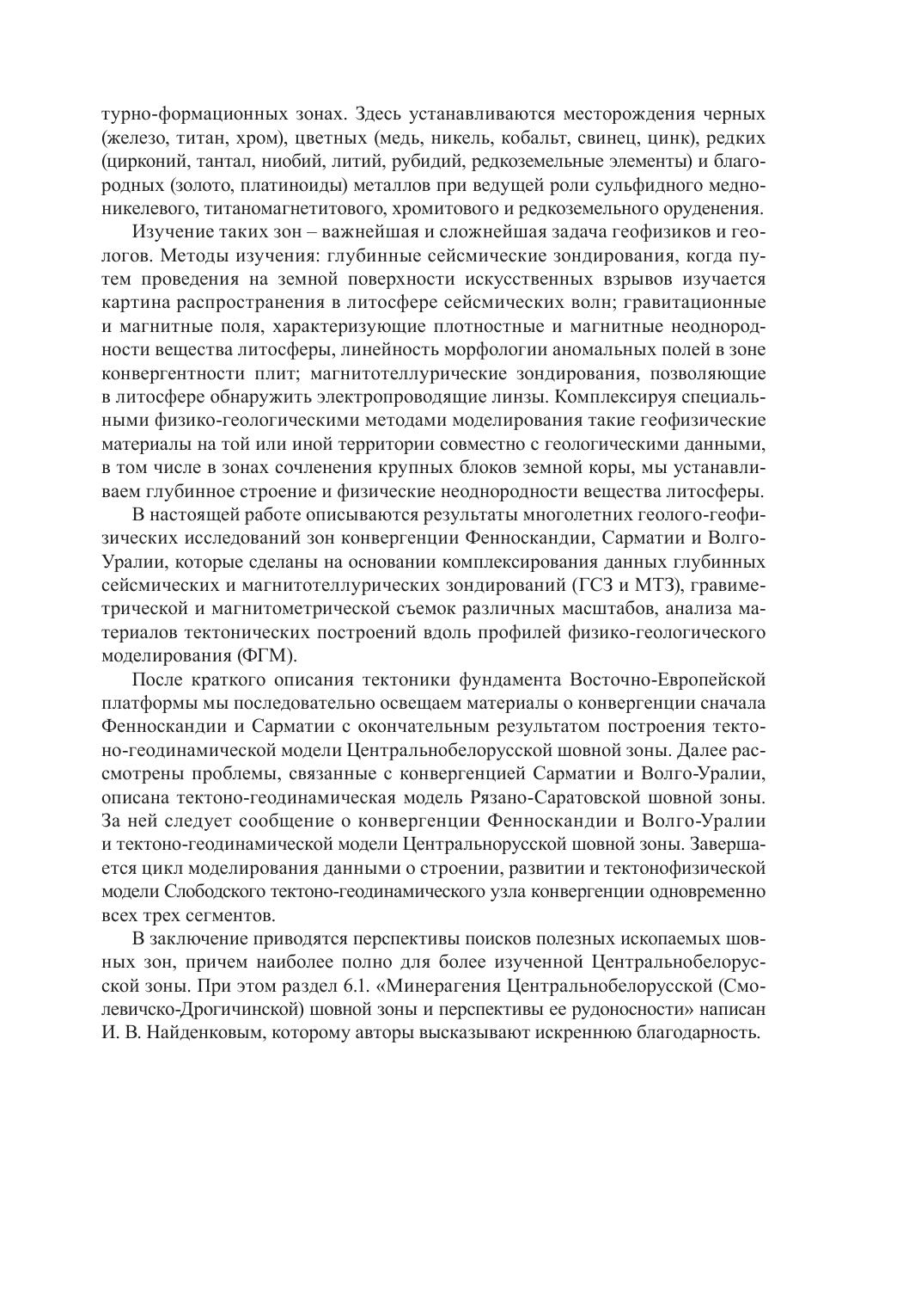 На основании комплексной геологической интерпретации геофизических полей с применением методики физико-геологического моделирования разреза изучено глубинное строение и вещественные неоднородности литосферы и астеносферы линейных межсегментных коллизионных зон (Центральнобелорусской, Рязано-Саратовской и Центральнорусской) конвергенции Фенноскандинавского, Сарматского и Волго-Уральского сегментов, образующих Восточно-Европейский кратон, и выделен новый тектонический элемент – Слободский тектоно-геодинамическтий узел их тройственного сочленения, в котором веерообразно сходятся магнитные и гравитационные аномалии, ранние авлакогены и Осницко-Микашевичский и Серпуховский вулкано-плутонические пояса. Установлены существенные различия тектонофизической природы образования этих структур: линейные шовные зоны, сопровождаемые вулкано-плутоническими поясами, формировались в процессе субдукции андского и зондского типов с последующей коллизией, а природа Слободского узла связывается с тектонофизическими процессами взаимодействия сжимающих напряжений, возбуждаемых глубокофокусными землетрясениями с пересекающими их конвективными потоками мантийного вещества, и затягиванием вещества земной коры сегментов в верхнюю мантию. Широкий спектр осадочно-вулканогенных и интрузивных формаций, присутствующих в зонах сочленения сегментов земной коры, обусловливает их высокий металлогенический потенциал. Кроме того, в процессе субдукции в результате перемещения горных пород на глубинные уровни переплавления докембрийских водонасыщенных карбонатно-силикатных осадков могут возникать алмазоносные магмы. В качестве примера в монографии приведены перспективы рудоносности Центральнобелорусской шовной зоны и влияния ее субдукционного процесса на перспективы алмазоносности Беларуси. Рассчитана на геологов, геофизиков, научных сотрудников, преподавателей и аспирантов, изучающих Восточно-Европейскую платформу.