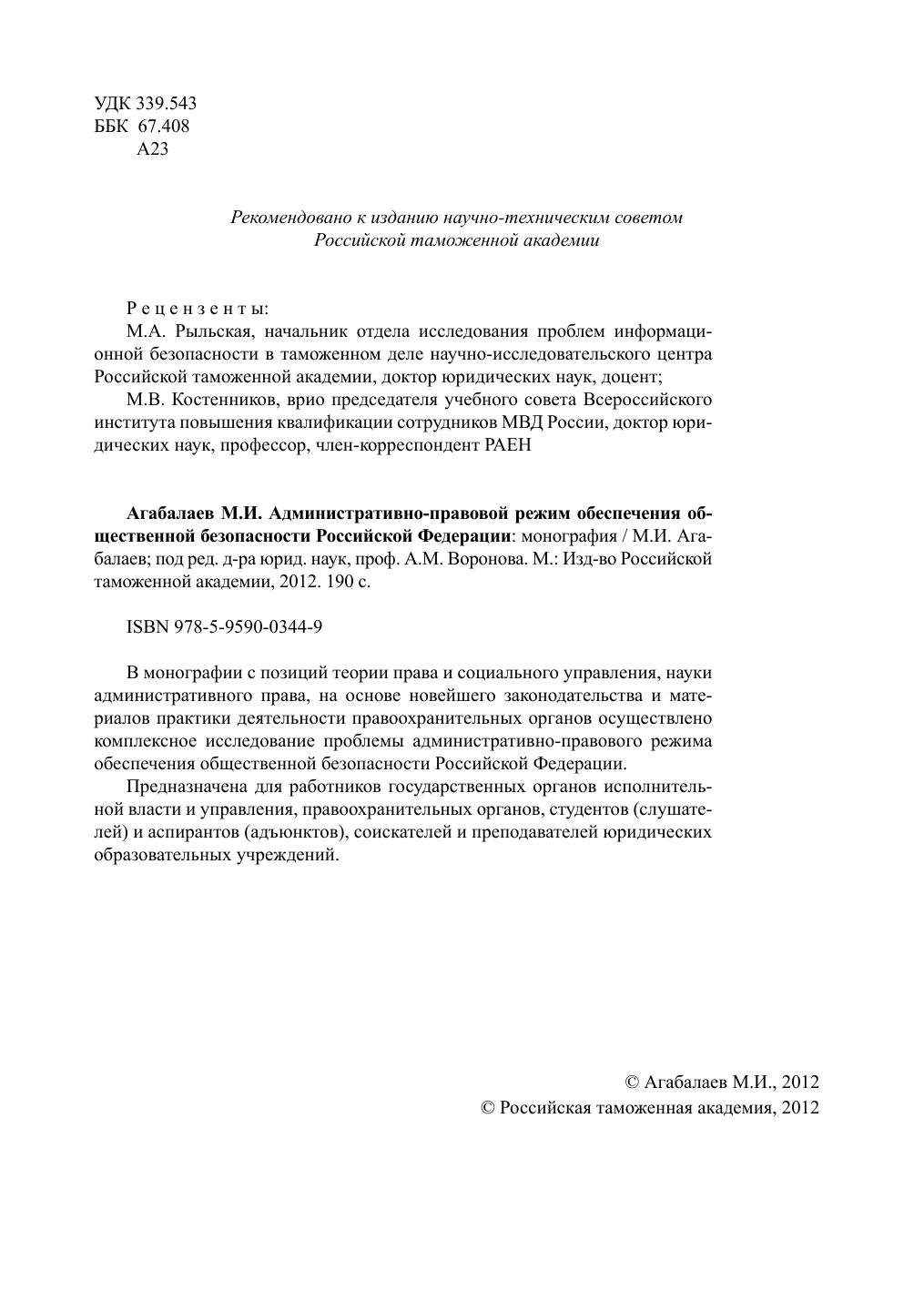 В монографии с позиций теории права и социального управления, науки административного права, на основе новейшего законодательства и материалов практики деятельности правоохранительных органов осуществлено комплексное исследование проблемы административно-правового режима обеспечения общественной безопасности Российской Федерации. Предназначена для работников государственных органов исполнительной власти и управления, правоохранительных органов, студентов (слушателей) и аспирантов (адъюнктов), соискателей и преподавателей юридических образовательных учреждений.