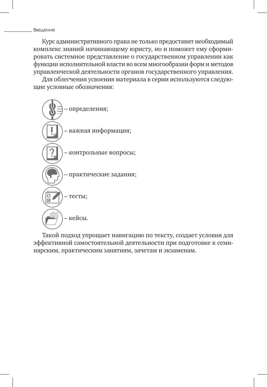 В настоящем учебном издании изучаются административно-правовые нормы и регулируемые ими общественные отношения в сфере реализации задач и функций исполнительной власти. Помимо теоретического материала, в учебнике имеются выдержки из источников, а также практические задания, основные виды нормативных документов по административно-процессуальной деятельности, что способствует выработке профессиональных умений и навыков в работе с правовыми актами.
