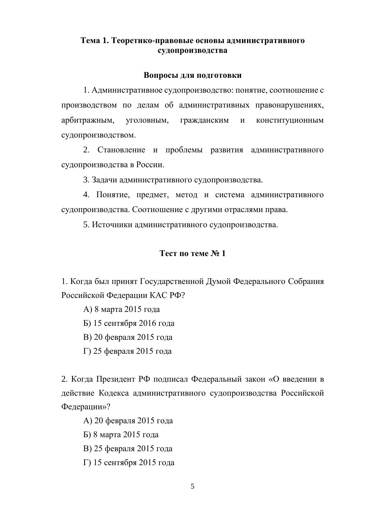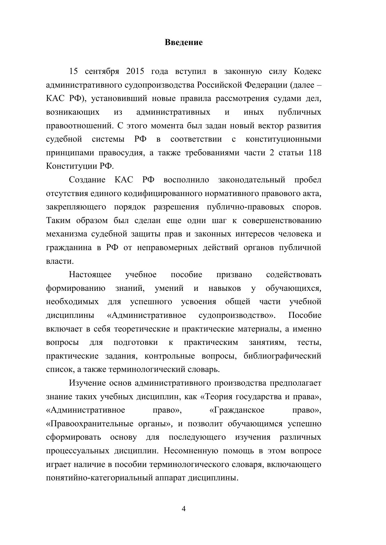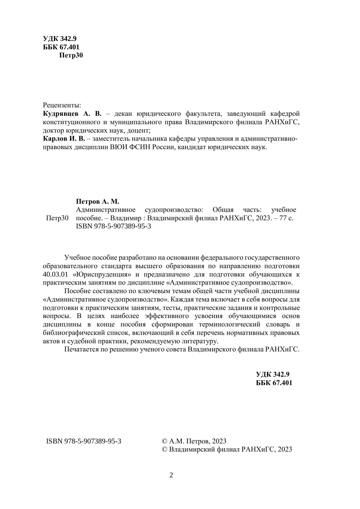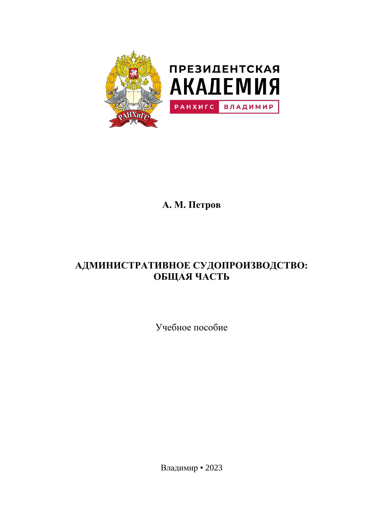 Учебное пособие разработано на основании федерального государственного образовательного стандарта высшего образования по направлению подготовки 40.03.01 «Юриспруденция» и предназначено для подготовки обучающихся к практическим занятиям по дисциплине «Административное судопроизводство». Пособие составлено по ключевым темам общей части учебной дисциплины «Административное судопроизводство». Каждая тема включает в себя вопросы для подготовки к практическим занятиям, тесты, практические задания и контрольные вопросы. В целях наиболее эффективного усвоения обучающимися основ дисциплины в конце пособия сформирован терминологический словарь и библиографический список, включающий в себя перечень нормативных правовых актов и судебной практики, рекомендуемую литературу. Печатается по решению ученого совета Владимирского филиала РАНХиГС.