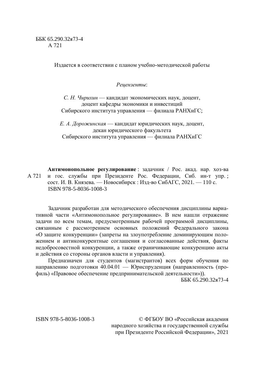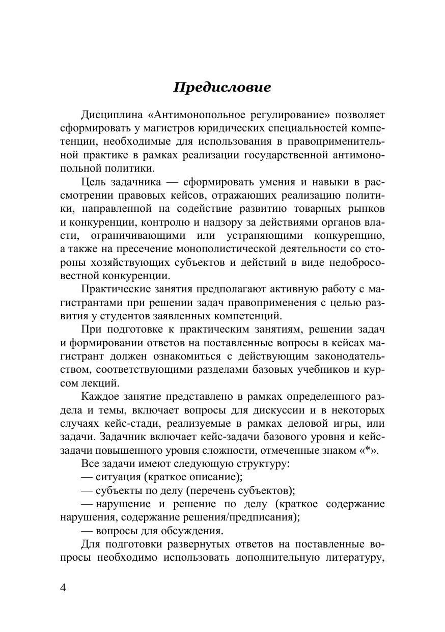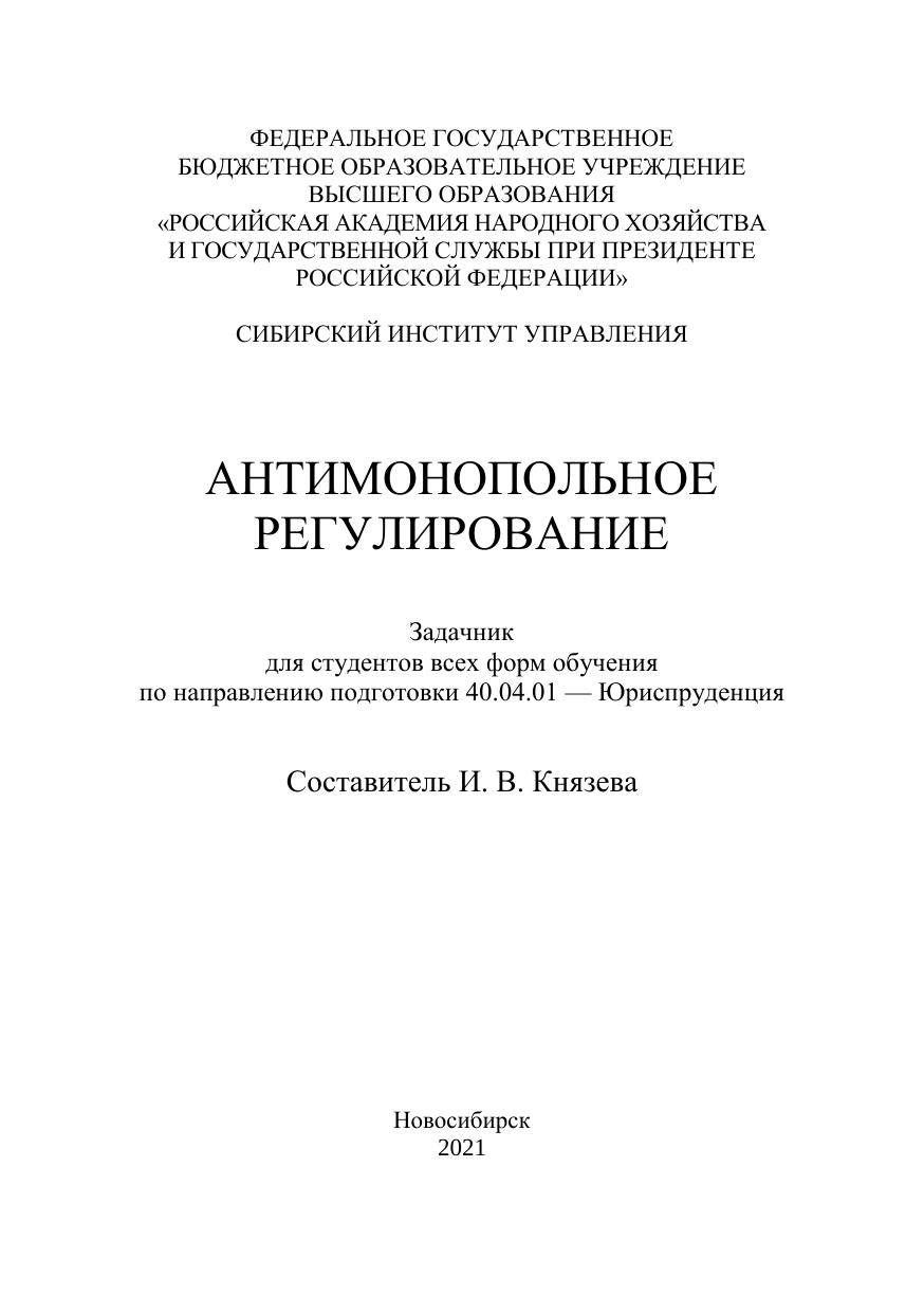 Задачник разработан для методического обеспечения дисциплины вариа-тивной части «Антимонопольное регулирование». В нем нашли отражение задачи по всем темам, предусмотренным рабочей программой дисциплины, связанным с рассмотрением основных положений Федерального закона «О защите конкуренции» (запреты на злоупотребление доминирующим поло-жением и антиконкурентные соглашения и согласованные действия, факты недобросовестной конкуренции, а также ограничивающие конкуренцию акты и действия со стороны органов власти и управления). Предназначен для студентов (магистрантов) всех форм обучения по направлению подготовки 40.04.01 — Юриспруденция (направленность (про-филь) «Правовое обеспечение предпринимательской деятельности»)).