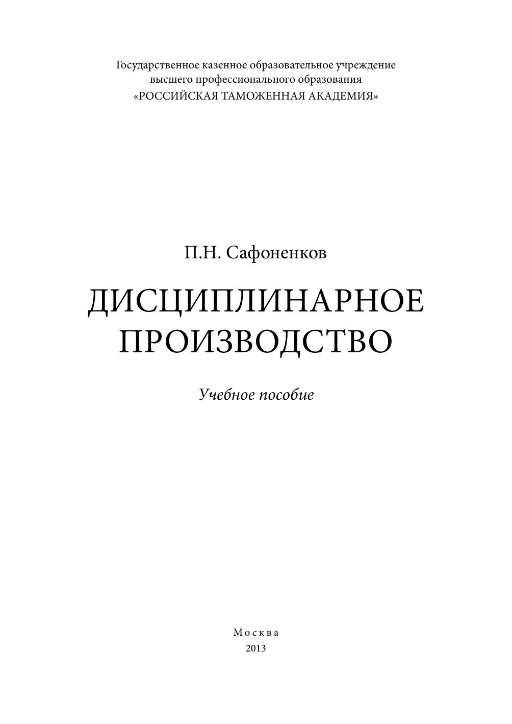 В пособии раскрываются теоретико-правовые положения, характеризующие дисциплинарное производство как вид административно-юрисдикционной деятельности властных субъектов по применению дисциплинарных взысканий. Учебное пособие предназначено для магистрантов Российской таможенной академии, изучающих правовые основы дисциплинарного производства по направлению подготовки: 030900.68 «Юриспруденция» (магистерская программа «Административная юрисдикционная деятельность таможенной администрации»).