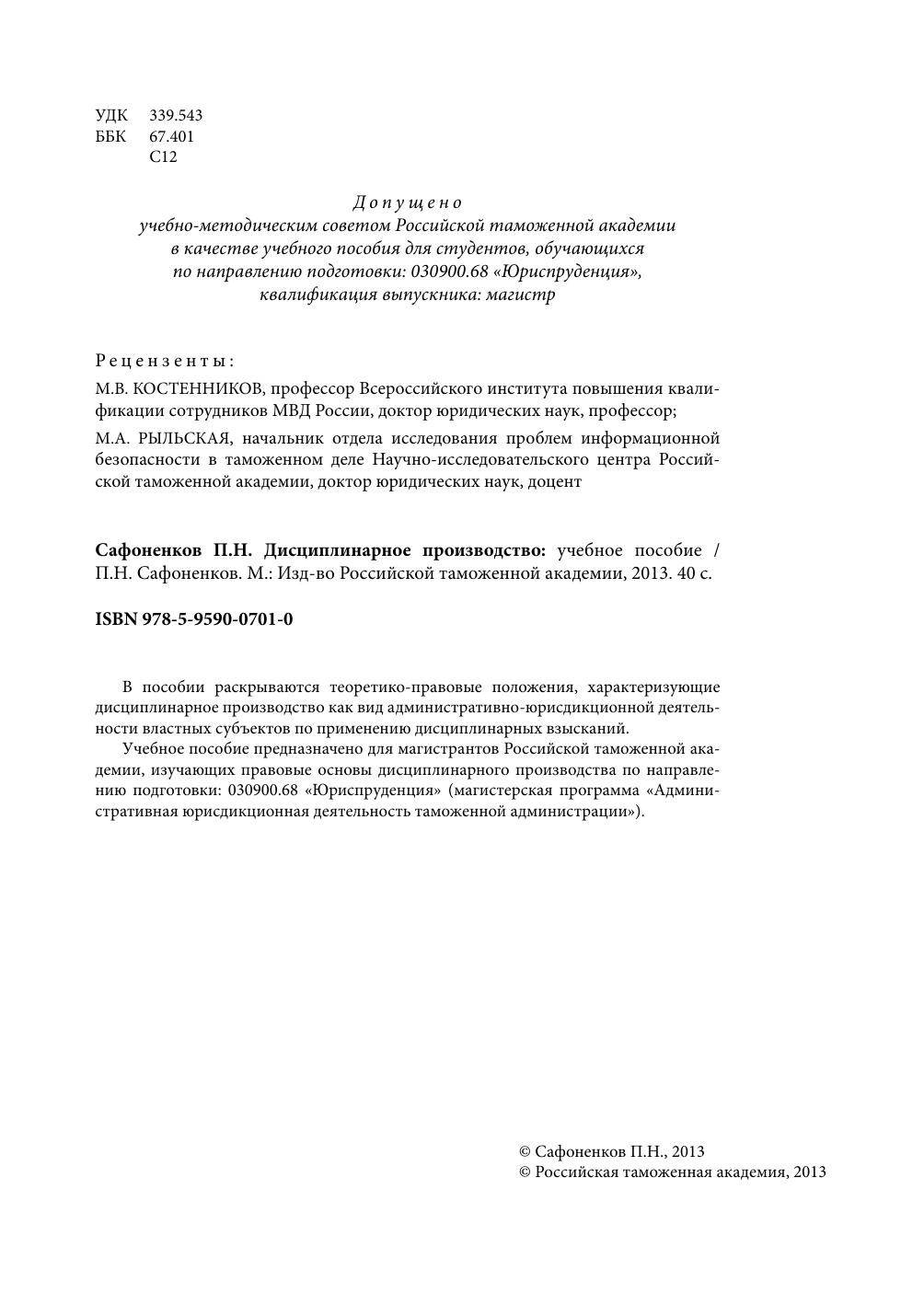Гриф: Допущено учебно-методическим советом Российской таможенной академии в качестве учебного пособия для студентов, обучающихся по направлению подготовки: 030900.68 «Юриспруденция», квалификация выпускника: магистр