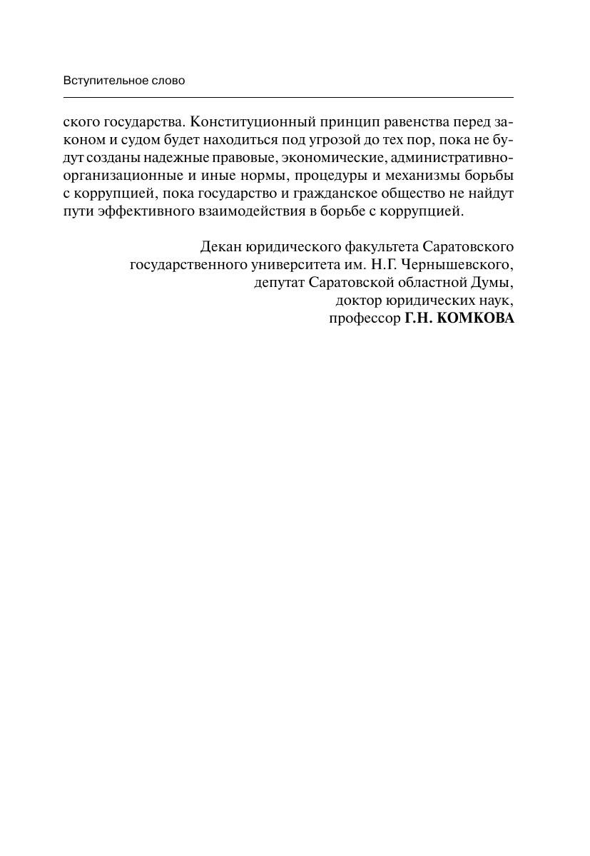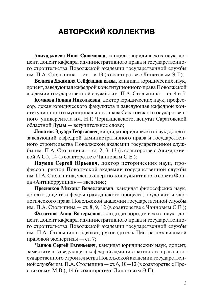 В книге приводится постатейный комментарий к Федеральному закону от 25 декабря 2008 г. № 273-ФЗ «О противодействии коррупции». Подготовка комментария осуществлена коллективом преподавателей Поволжской академии государственной службы им. П.А. Столыпина (г. Саратов). Авторы данного комментария являются членами различных конкурсных, аттестационных и конфликтных комиссий, создаваемых в органах государственной власти и местного самоуправления участниками правовых и антикоррупционных экспертиз нормативных актов. В силу этого в рамках данного комментария не только проведен анализ новейших положений антикоррупционного законодательства, но и даются конкретные рекомендации по применению его положений на государственной и муниципальной службе. Комментарий предназначен в первую очередь для государственных и муниципальных служащих. Вместе с тем он может быть полезен и депутатам представительных органов различных уровней власти, а также преподавателям, аспирантам и студентам при изучении курсов «Административное право», «Муниципальное право», «Уголовное право», спецкурса «Антикоррупционное законодательство» и др.