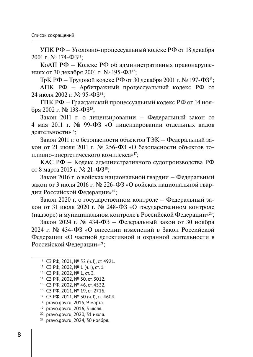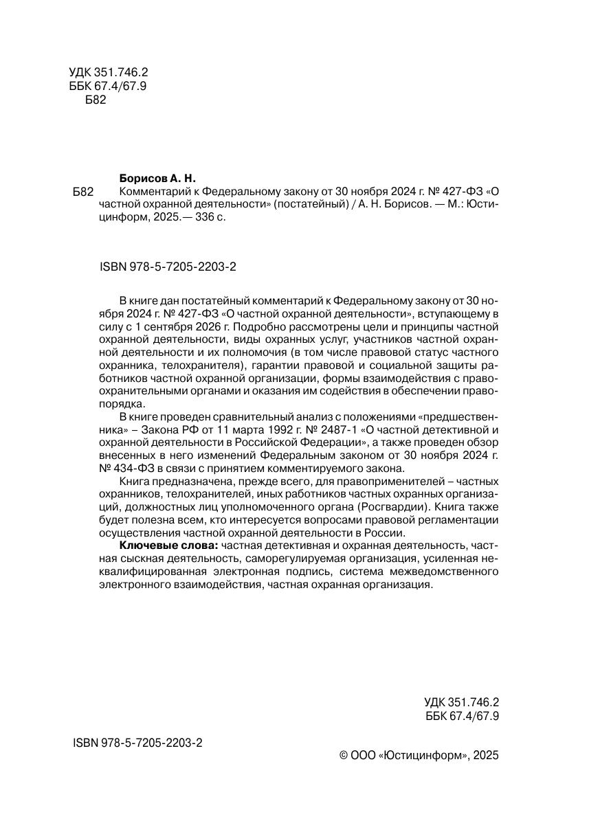 охранной деятельности в Российской Федерации», а также проведен обзор внесенных в него изменений Федеральным законом от 30 ноября 2024 г. № 434-ФЗ в связи с принятием комментируемого закона. Книга предназначена, прежде всего, для правоприменителей – частных охранников, телохранителей, иных работников частных охранных организаций, должностных лиц уполномоченного органа (Росгвардии). Книга также будет полезна всем, кто интересуется вопросами правовой регламентации осуществления частной охранной деятельности в России.