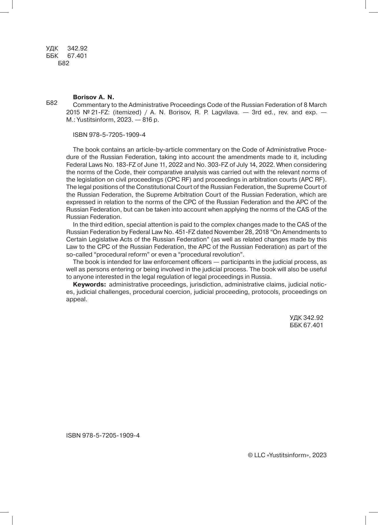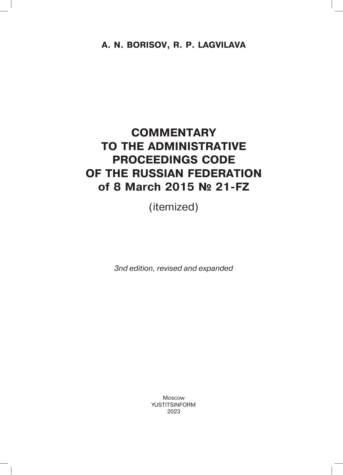 проведен их сравнительный анализ с соответствующими нормами законодательства о гражданском судопроизводстве (ГПК РФ) и судопроизводстве в арбитражных судах (АПК РФ). Приведены правовые позиции Конституционного Суда РФ, Верховного Суда РФ, Высшего Арбитражного Суда РФ, которые выражены в отношении норм ГПК РФ и АПК РФ, но могут быть учтены при применении норм КАС РФ. В третьем издании особое внимание уделено комплексным изменениям, внесенным в КАС РФ Федеральным законом от 28 ноября 2018 г. № 451‑ФЗ «О внесении изменений в отдельные законодательные акты Российской Федерации» (как и связанным с ними изменениям, внесенным данным Законом в ГПК РФ, АПК РФ) в рамках так называемой «процессуальной реформы» или даже «процессуальной революции». Книга предназначена для правоприменителей — участников судебного процесса, а также лиц, вступающих или вовлекаемых в судебный процесс. Книга также будет полезна всем, кто интересуется вопросами правового регулирования судопроизводства в России.