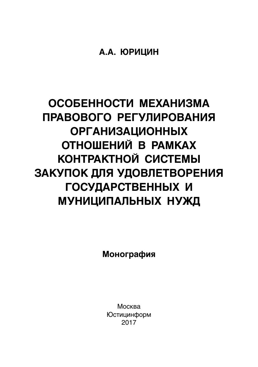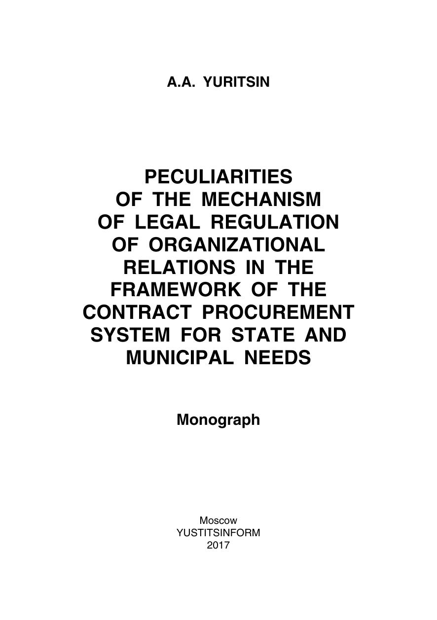 Особенности механизма правового регулирования организационных отношений в рамках контрактной системы закупок для удовлетворения государственных и муниципальных нужд: монография