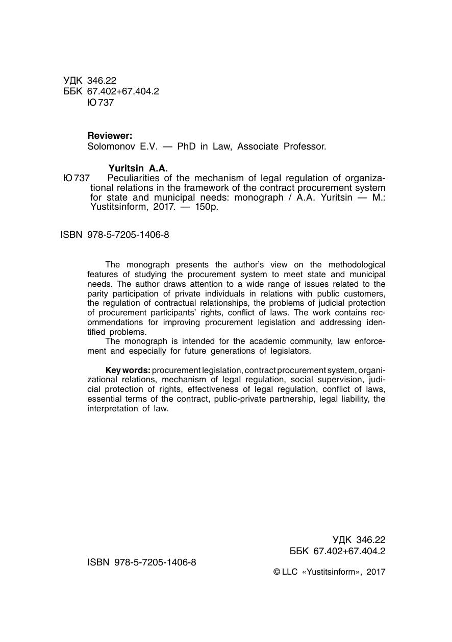 В монографии представлен авторский взгляд на методологические особенности изучения системы закупок для удовлетворения государственных и муниципальных нужд. Автор обращает внимание на широкий круг вопросов, связанных с паритетным участием частных лиц в отношениях с публичными заказчиками, регулированием контрактных правоотношений, проблемами юрисдикционной защиты прав участников закупок, коллизиями норм права. Работа содержит рекомендации по совершенствованию закупочного законодательства и решению выявленных проблем.