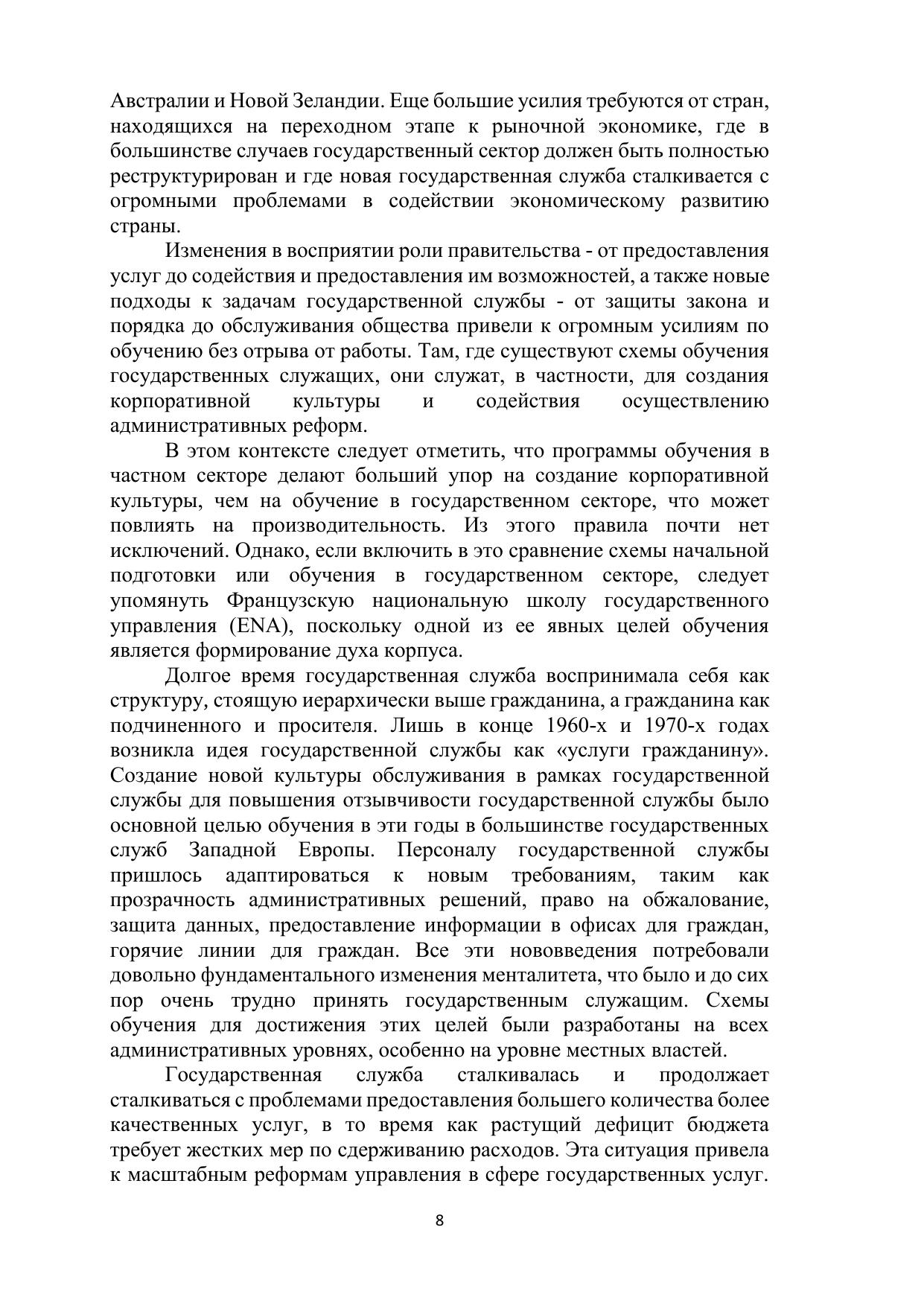 Страны с переходной экономикой сталкиваются с проблемой адаптации своей государственной службы к новой среде, возникшей в результате изменений в политической и экономической системе, к новым ожиданиям и требованиям граждан, а также требованиям соответствия современным международным стандартам. Эти фундаментальные изменения требуют серьезных изменений в государственном управлении, включая управление человеческими ресурсами. Для решения этих проблем крайне важно, чтобы служащие как можно быстрее приобрели новые навыки и квалификацию, включая изменения в поведении по отношению к общественности. Печатается по решению ученого совета Владимирского филиала РАНХиГС.