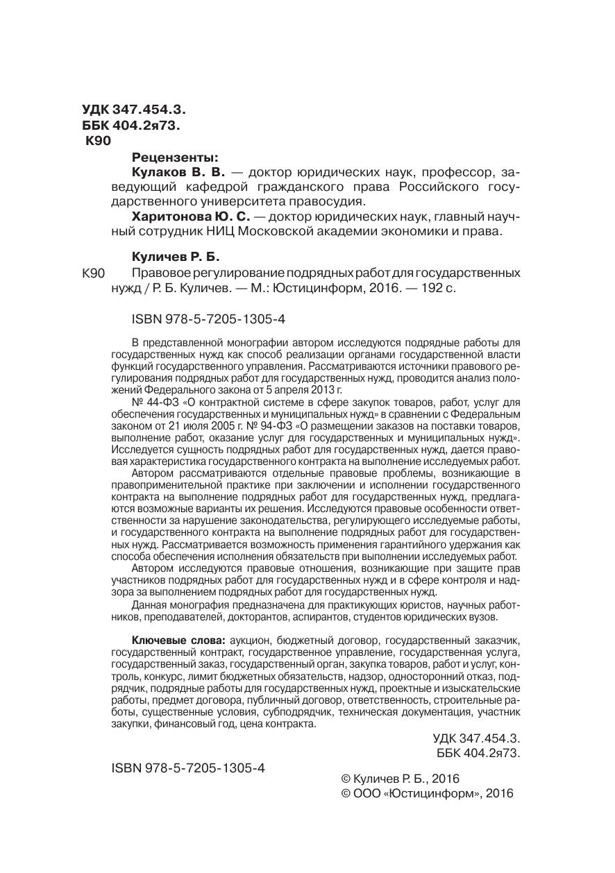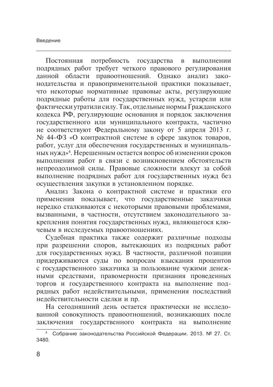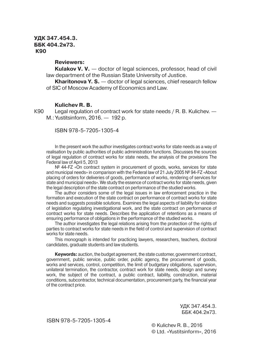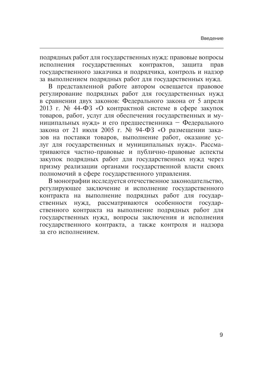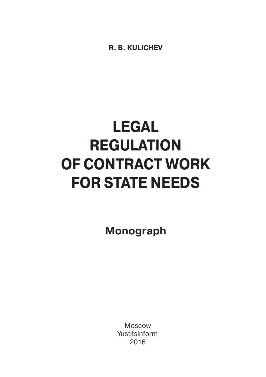 В представленной монографии автором исследуются подрядные работы для государственных нужд как способ реализации органами государственной власти функций государственного управления. Рассматриваются источники правового регулирования подрядных работ для государственных нужд, проводится анализ положений Федерального закона от 5 апреля 2013 г. № 44-ФЗ «О контрактной системе в сфере закупок товаров, работ, услуг для обеспечения государственных и муниципальных нужд» в сравнении с Федеральным законом от 21 июля 2005 г. № 94-ФЗ «О размещении заказов на поставки товаров, выполнение работ, оказание услуг для государственных и муниципальных нужд». Исследуется сущность подрядных работ для государственных нужд, дается правовая характеристика государственного контракта на выполнение исследуемых работ. Автором рассматриваются отдельные правовые проблемы, возникающие в правоприменительной практике при заключении и исполнении государственного контракта на выполнение подрядных работ для государственных нужд, предлагаются возможные варианты их решения. Исследуются правовые особенности ответственности за нарушение законодательства, регулирующего исследуемые работы, и государственного контракта на выполнение подрядных работ для государственных нужд. Рассматривается возможность применения гарантийного удержания как способа обеспечения исполнения обязательств при выполнении исследуемых работ. Автором исследуются правовые отношения, возникающие при защите прав участников подрядных работ для государственных нужд и в сфере контроля и надзора за выполнением подрядных работ для государственных нужд.