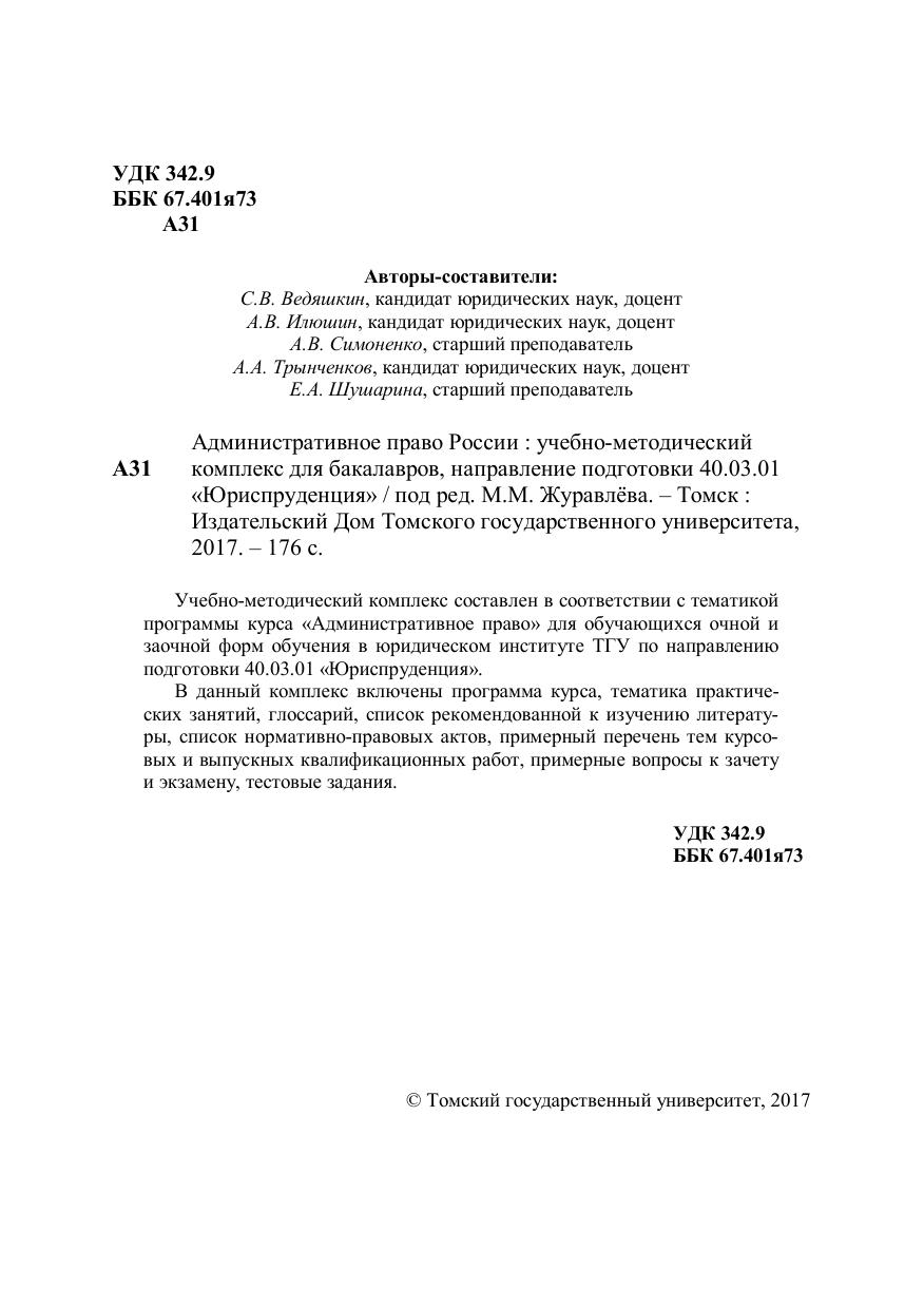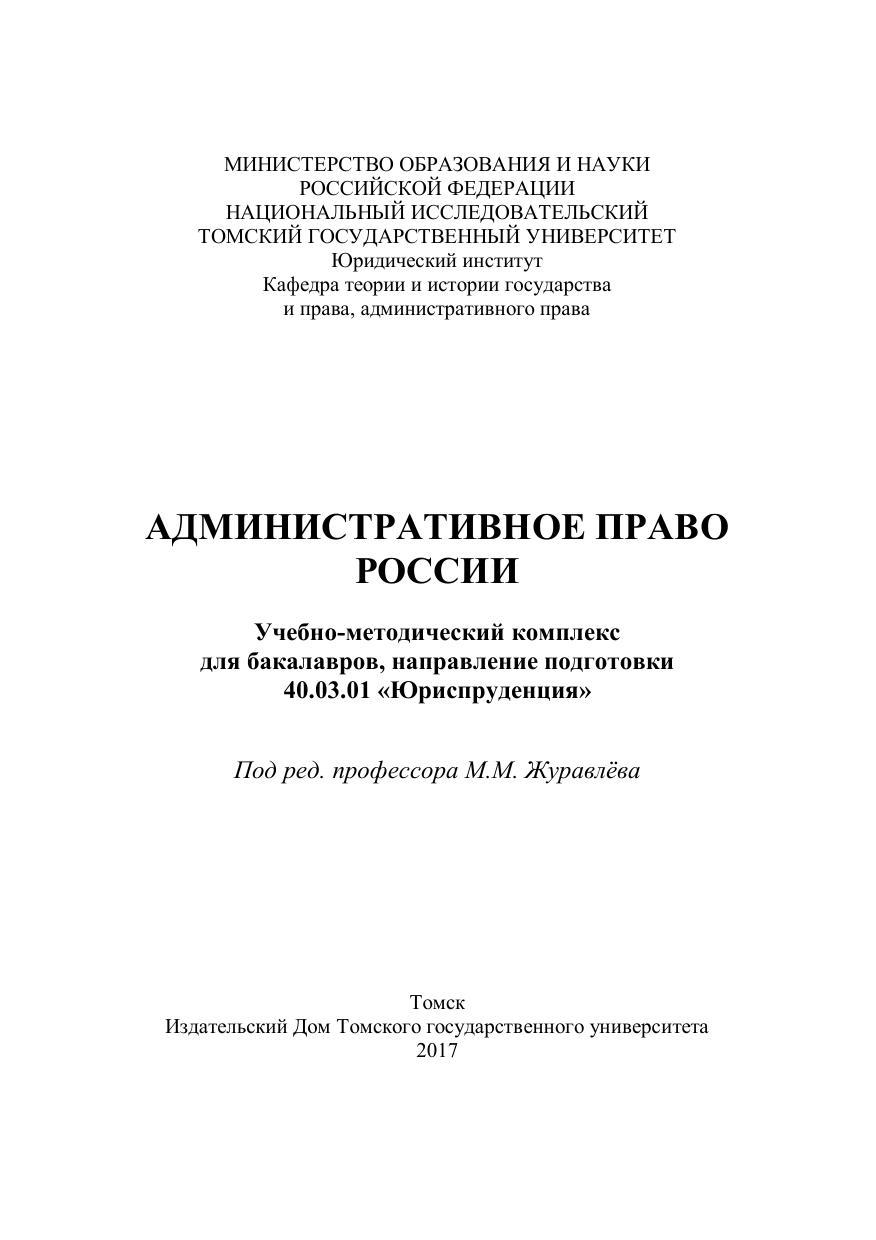 Учебно-методический комплекс составлен в соответствии с тематикой программы курса «Административное право» для обучающихся очной и заочной форм обучения в юридическом институте ТГУ по направлению подготовки 40.03.01 «Юриспруденция». В данный комплекс включены программа курса, тематика практических занятий, глоссарий, список рекомендованной к изучению литературы, список нормативно-правовых актов, примерный перечень тем курсовых и выпускных квалификационных работ, примерные вопросы к зачету и экзамену, тестовые задания.