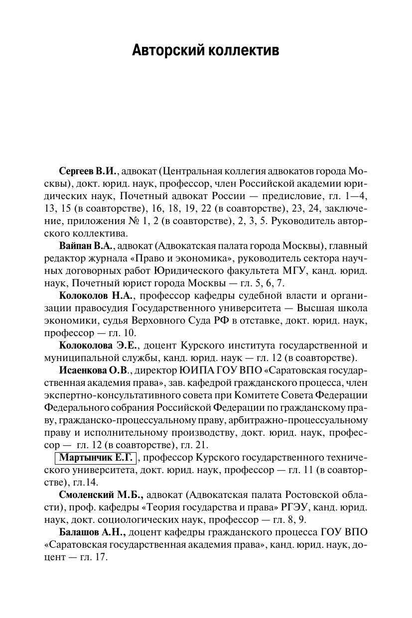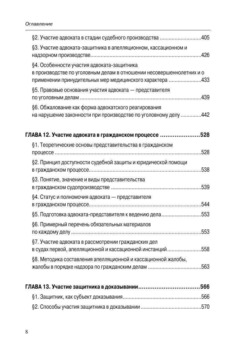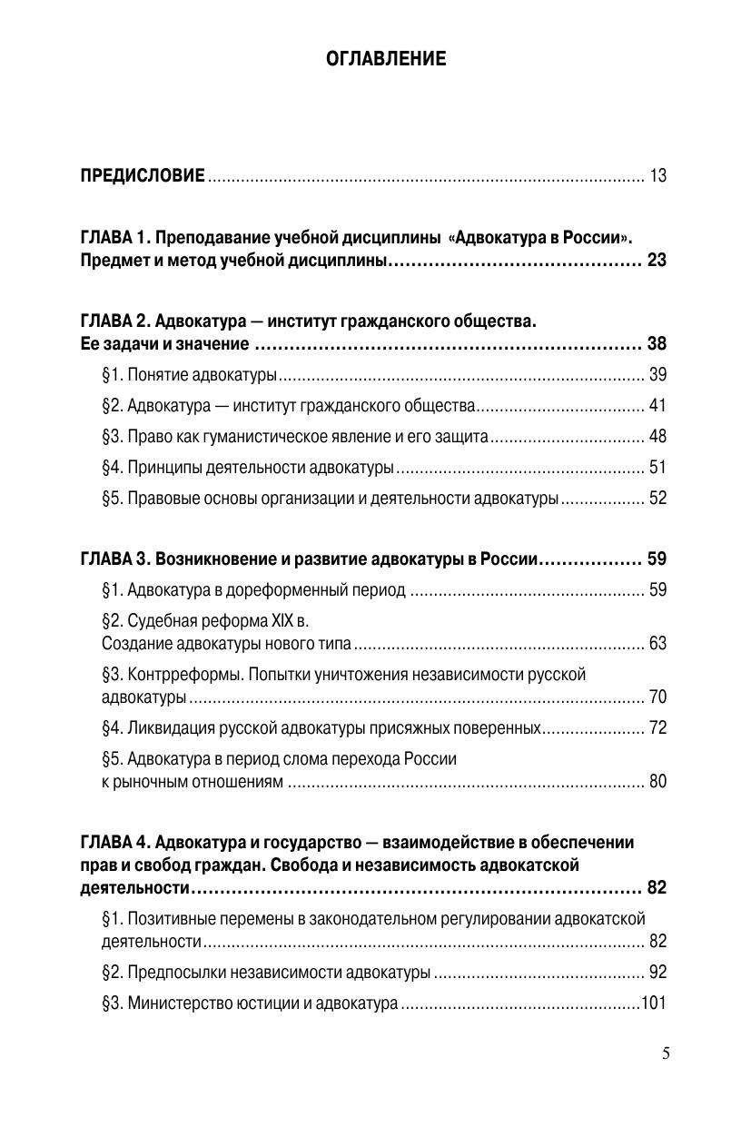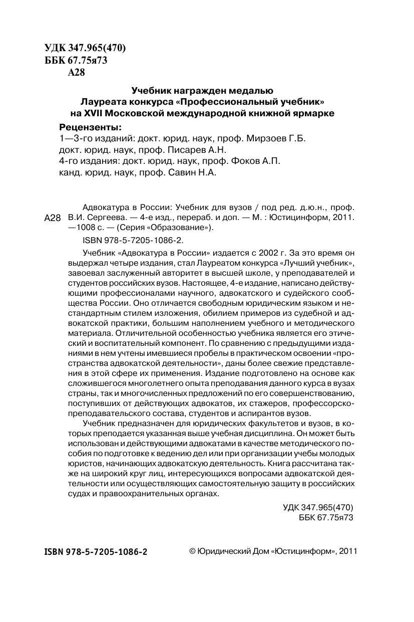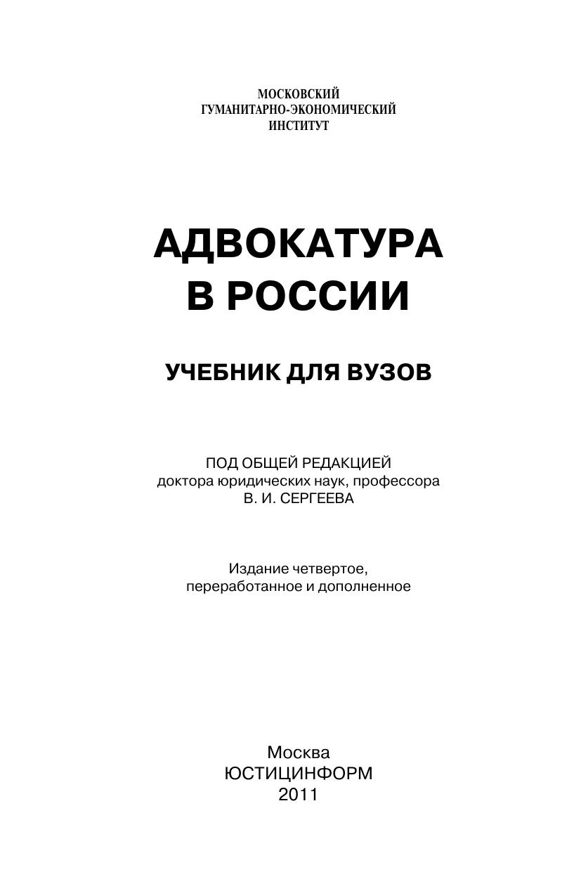 Учебник «Адвокатура в России» издается с 2002 г. За это время он выдержал четыре издания, стал Лауреатом конкурса «Лучший учебник», завоевал заслуженный авторитет в высшей школе, у преподавателей и студентов российских вузов. Настоящее, 4-е издание, написано действующими профессионалами научного, адвокатского и судейского сообщества России. Оно отличается свободным юридическим языком и нестандартным стилем изложения, обилием примеров из судебной и адвокатской практики, большим наполнением учебного и методического материала. Отличительной особенностью учебника является его этический и воспитательный компонент. По сравнению с предыдущими изданиями в нем учтены имевшиеся пробелы в практическом освоении «пространства адвокатской деятельности», даны более свежие представления в этой сфере их применения. Издание подготовлено на основе как сложившегося многолетнего опыта преподавания данного курса в вузах страны, так и многочисленных предложений по его совершенствованию, поступивших от действующих адвокатов, их стажеров, профессорскопреподавательского состава, студентов и аспирантов вузов. Учебник предназначен для юридических факультетов и вузов, в которых преподается указанная выше учебная дисциплина. Он может быть использован и действующими адвокатами в качестве методического пособия по подготовке к ведению дел или при организации учебы молодых юристов, начинающих адвокатскую деятельность. Книга рассчитана также на широкий круг лиц, интересующихся вопросами адвокатской деятельности или осуществляющих самостоятельную защиту в российских судах и правоохранительных органах.