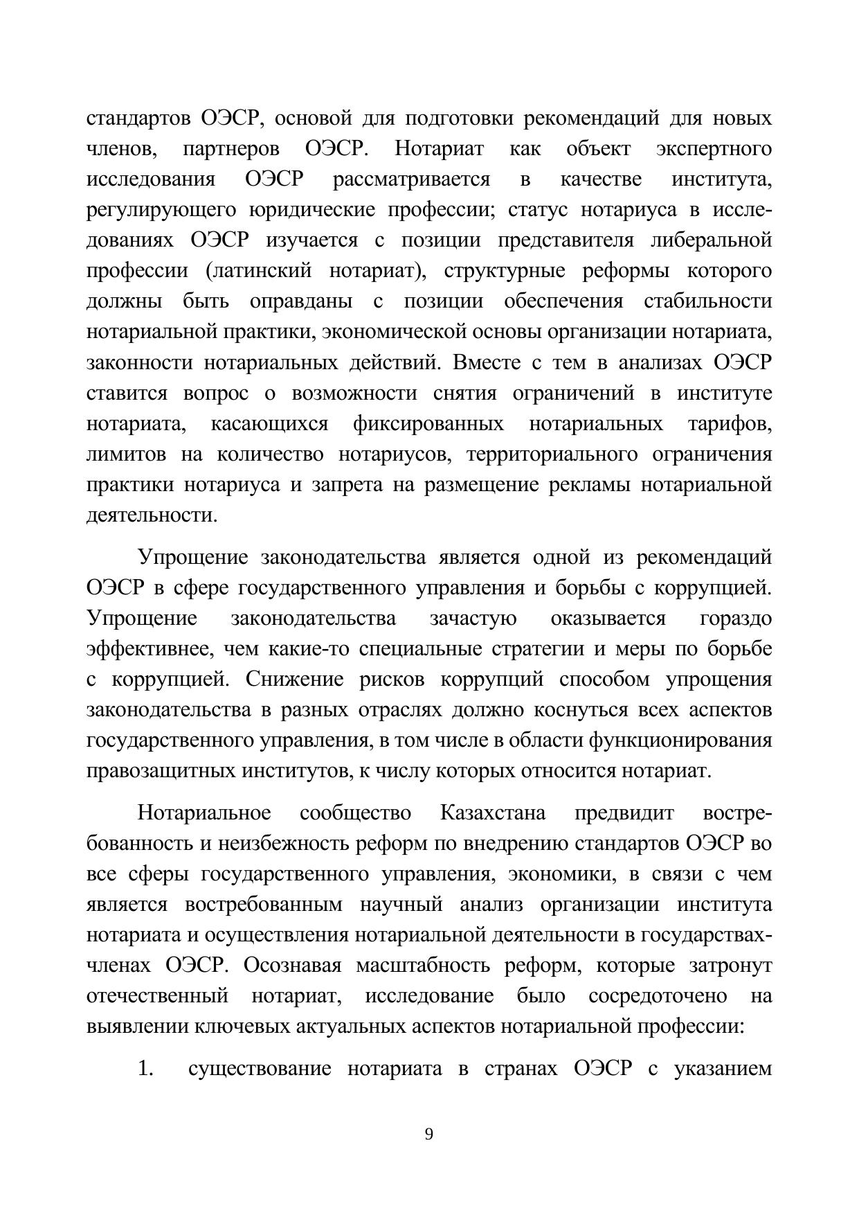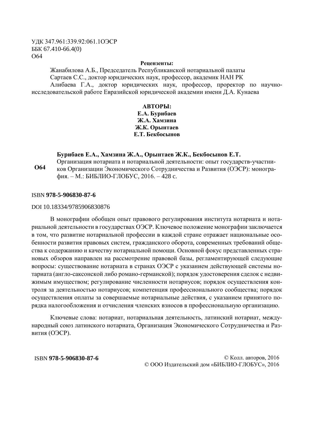 В монографии обобщен опыт правового регулирования института нотариата и нота-риальной деятельности в государствах ОЭСР. Ключевое положение монографии заключается в том, что развитие нотариальной профессии в каждой стране отражает национальные осо-бенности развития правовых систем, гражданского оборота, современных требований обще-ства к содержанию и качеству нотариальной помощи. Основной фокус представленных стра-новых обзоров направлен на рассмотрение правовой базы, регламентирующей следующие вопросы: существование нотариата в странах ОЭСР с указанием действующей системы но-тариата (англо-саксонской либо романо-германской); порядок удостоверения сделок с недви-жимым имуществом; регулирование численности нотариусов; порядок осуществления кон-троля за деятельностью нотариусов; компетенция профессионального сообщества; порядок осуществления оплаты за совершаемые нотариальные действия, с указанием принятого по-рядка налогообложения и отчисления членских взносов в профессиональную организацию.