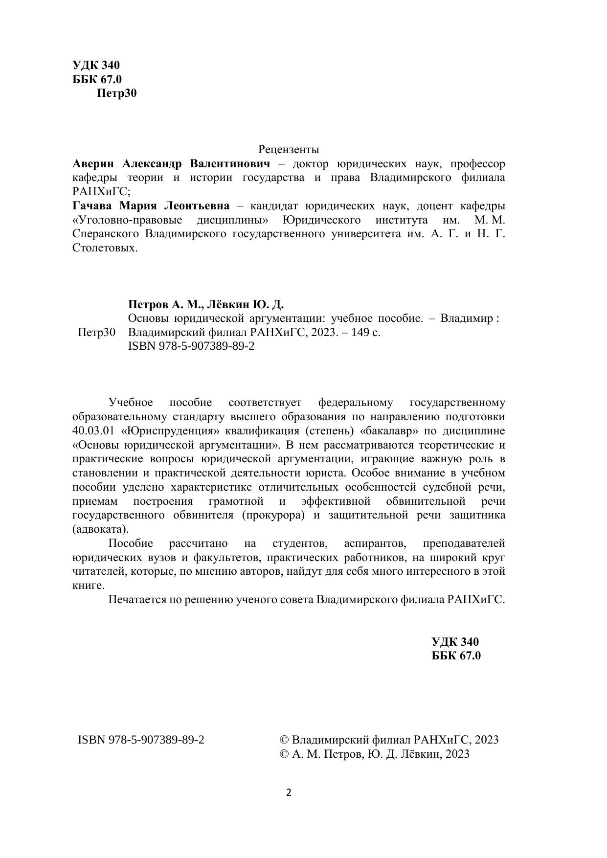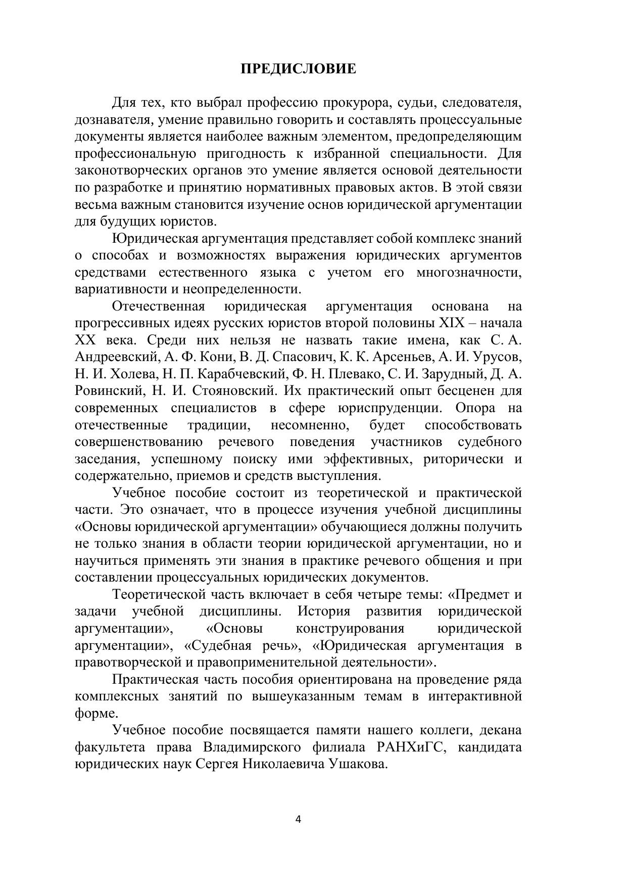 Учебное пособие соответствует федеральному государственному образовательному стандарту высшего образования по направлению подготовки 40.03.01 «Юриспруденция» квалификация (степень) «бакалавр» по дисциплине «Основы юридической аргументации». В нем рассматриваются теоретические и практические вопросы юридической аргументации, играющие важную роль в становлении и практической деятельности юриста. Особое внимание в учебном пособии уделено характеристике отличительных особенностей судебной речи, приемам построения грамотной и эффективной обвинительной речи государственного обвинителя (прокурора) и защитительной речи защитника (адвоката). Пособие рассчитано на студентов, аспирантов, преподавателей юридических вузов и факультетов, практических работников, на широкий круг читателей, которые, по мнению авторов, найдут для себя много интересного в этой книге. Печатается по решению ученого совета Владимирского филиала РАНХиГС.
