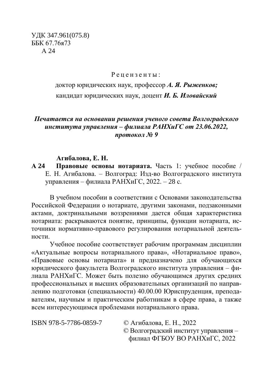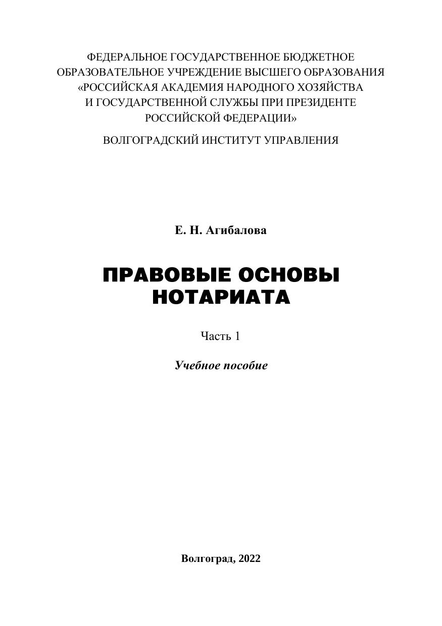В учебном пособии в соответствии с Основами законодательства Российской Федерации о нотариате, другими законами, подзаконными актами, доктринальными воззрениями дается общая характеристика нотариата: раскрываются понятие, принципы, функции нотариата, ис-точники нормативно-правового регулирования нотариальной деятель-ности. Учебное пособие соответствует рабочим программам дисциплин «Актуальные вопросы нотариального права», «Нотариальное право», «Правовые основы нотариата» и предназначено для обучающихся юридического факультета Волгоградского института управления – фи-лиала РАНХиГС. Может быть полезно обучающимся других средних профессиональных и высших образовательных организаций по направ-лению подготовки (специальности) 40.00.00 Юриспруденция, препода-вателям, научным и практическим работникам в сфере права, а также всем интересующимся проблемами нотариального права.