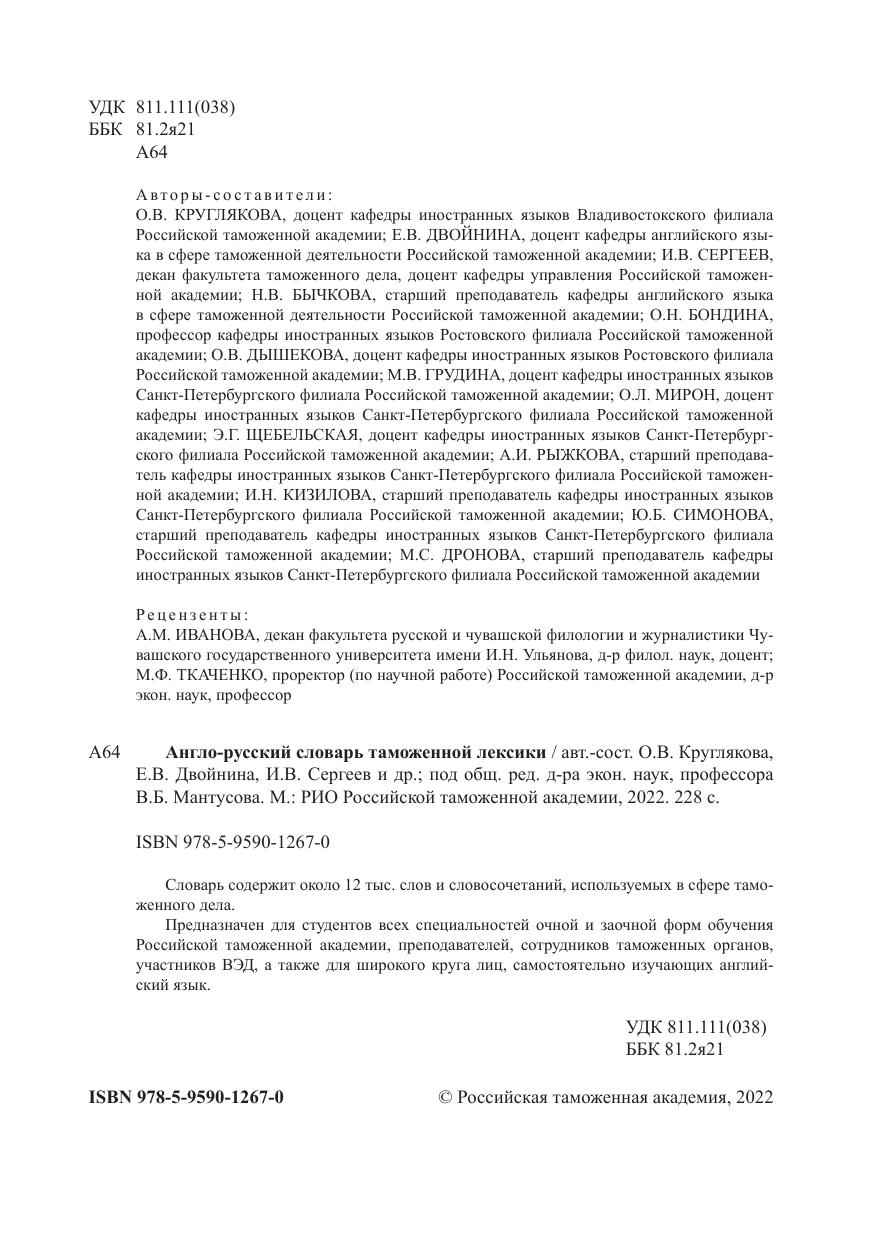 Предназначен для студентов всех специальностей очной и заочной форм обучения Российской таможенной академии, преподавателей, сотрудников таможенных органов, участников ВЭД, а также для широкого круга лиц, самостоятельно изучающих английский язык.