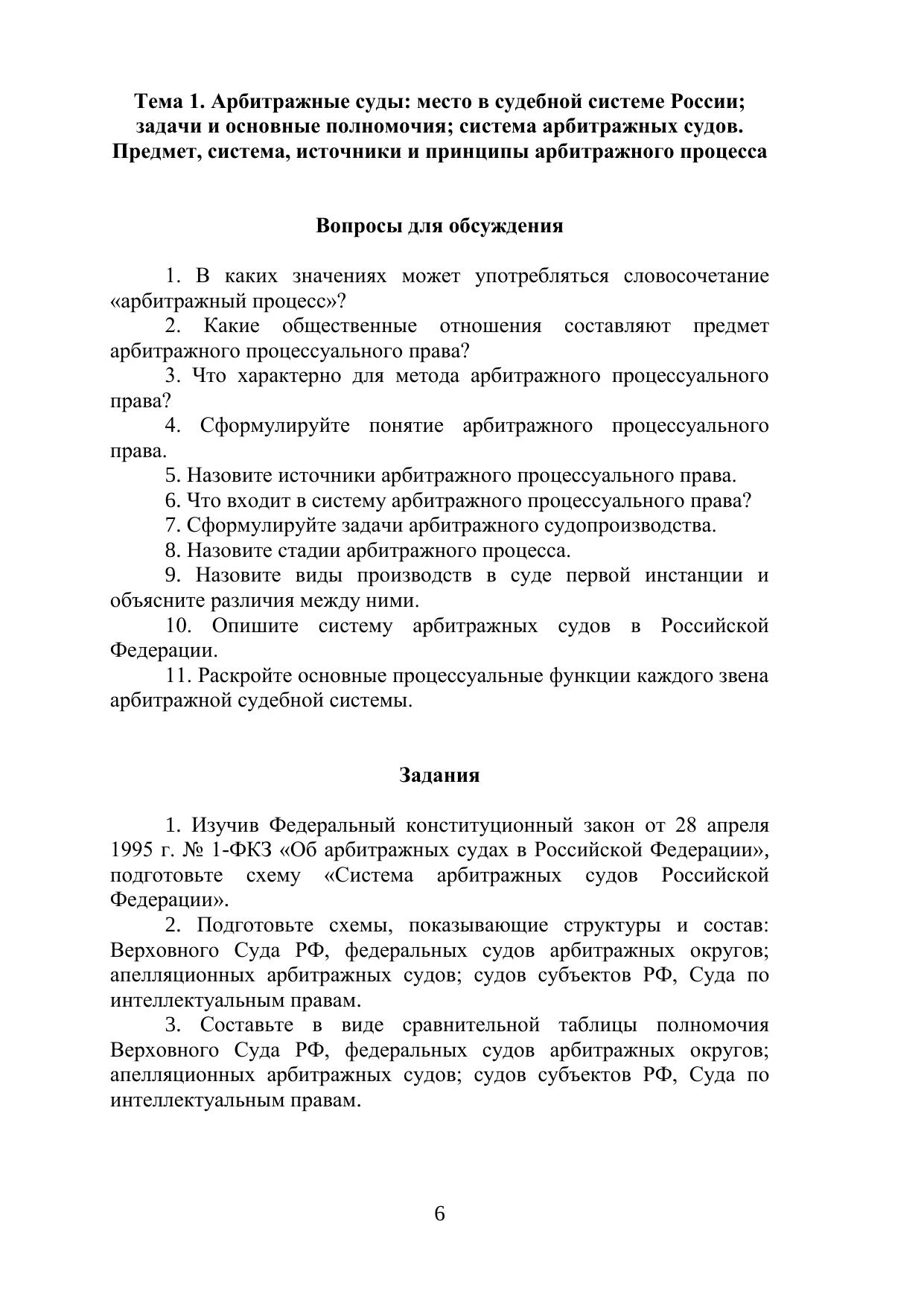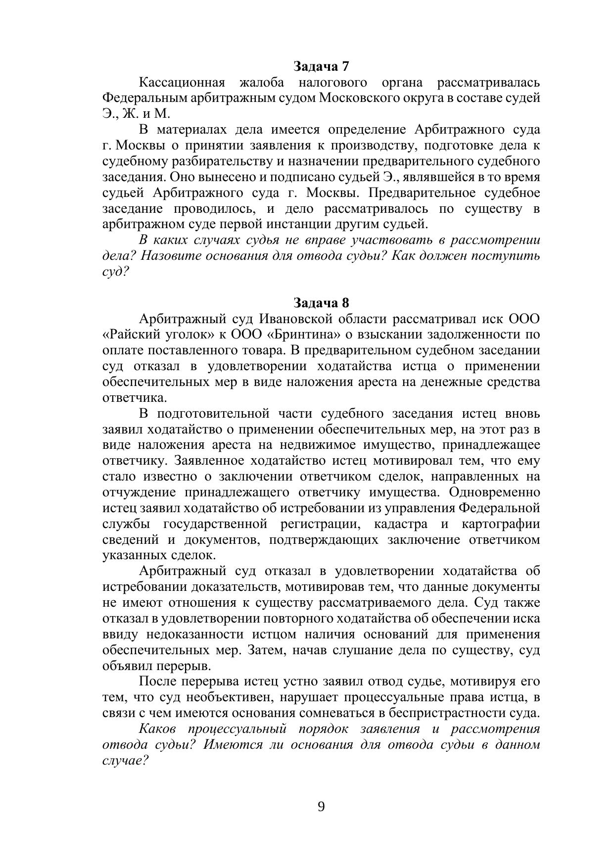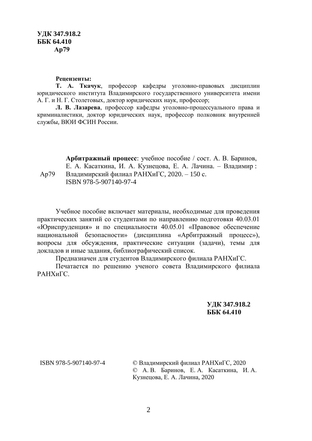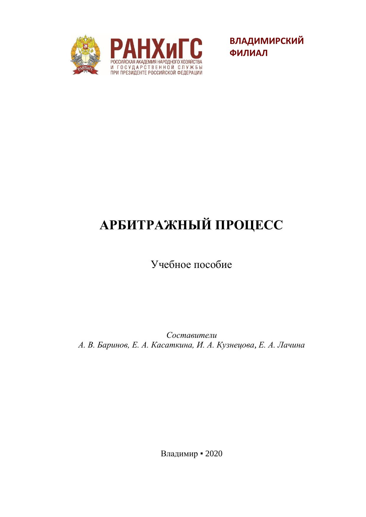 Учебное пособие включает материалы, необходимые для проведения практических занятий со студентами по направлению подготовки 40.03.01 «Юриспруденция» и по специальности 40.05.01 «Правовое обеспечение национальной безопасности» (дисциплина «Арбитражный процесс»), вопросы для обсуждения, практические ситуации (задачи), темы для докладов и иные задания, библиографический список. Предназначен для студентов Владимирского филиала РАНХиГС. Печатается по решению ученого совета Владимирского филиала РАНХиГС.