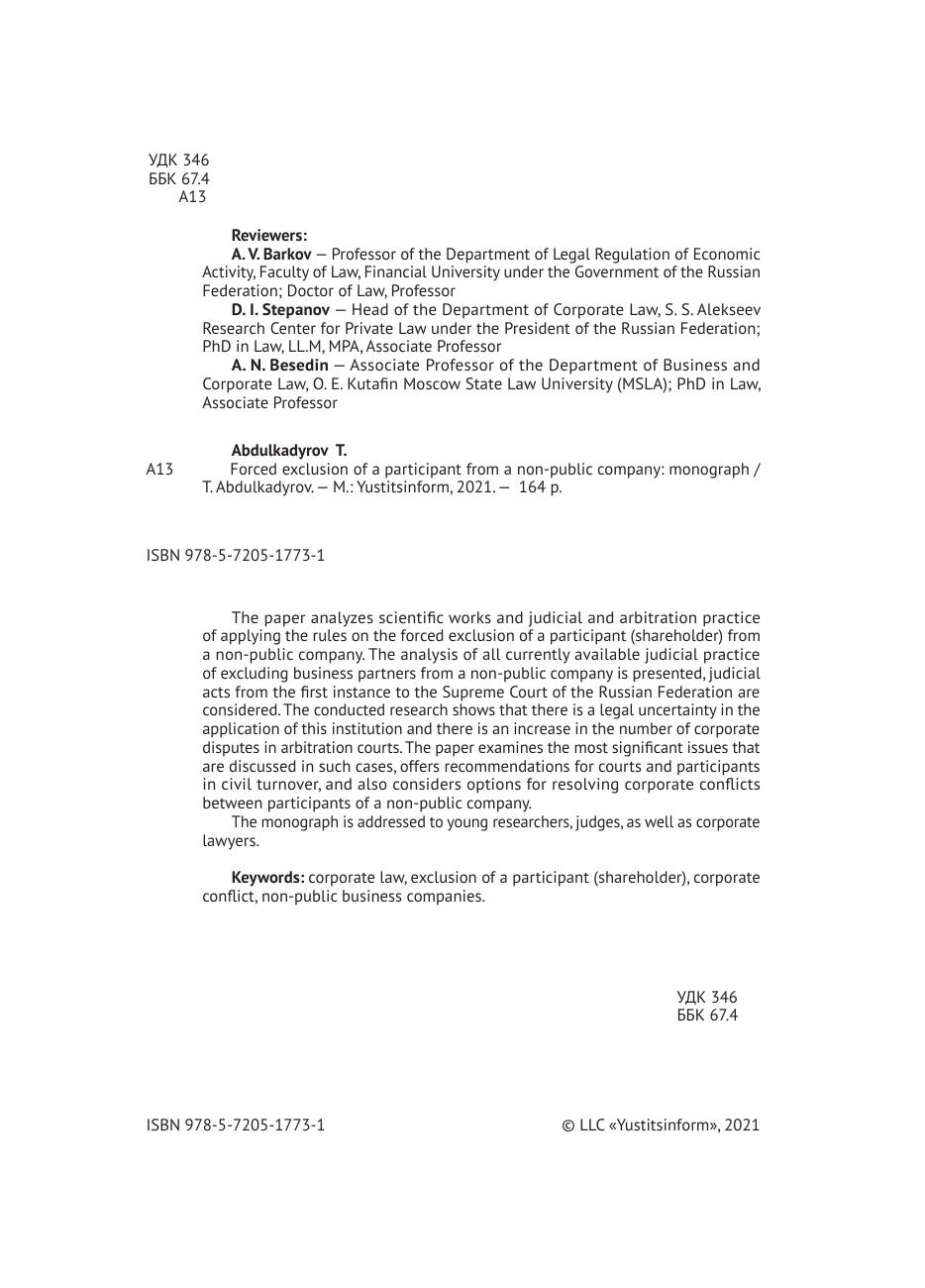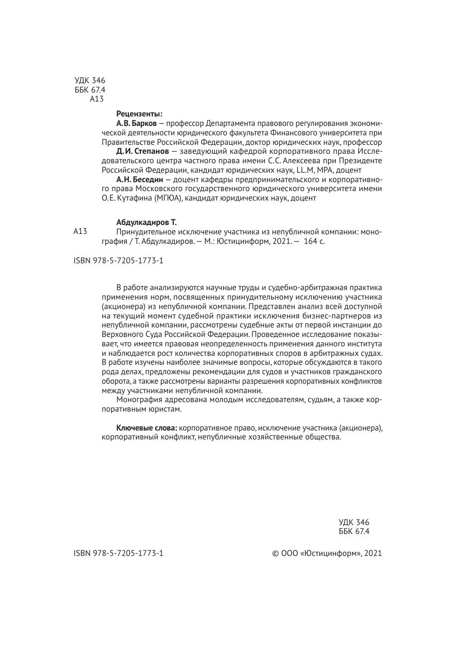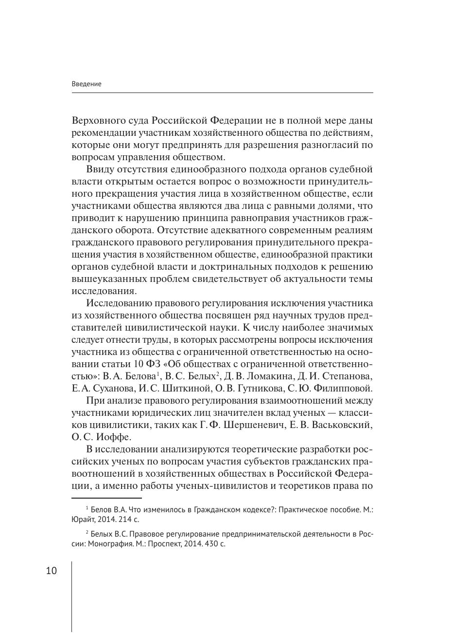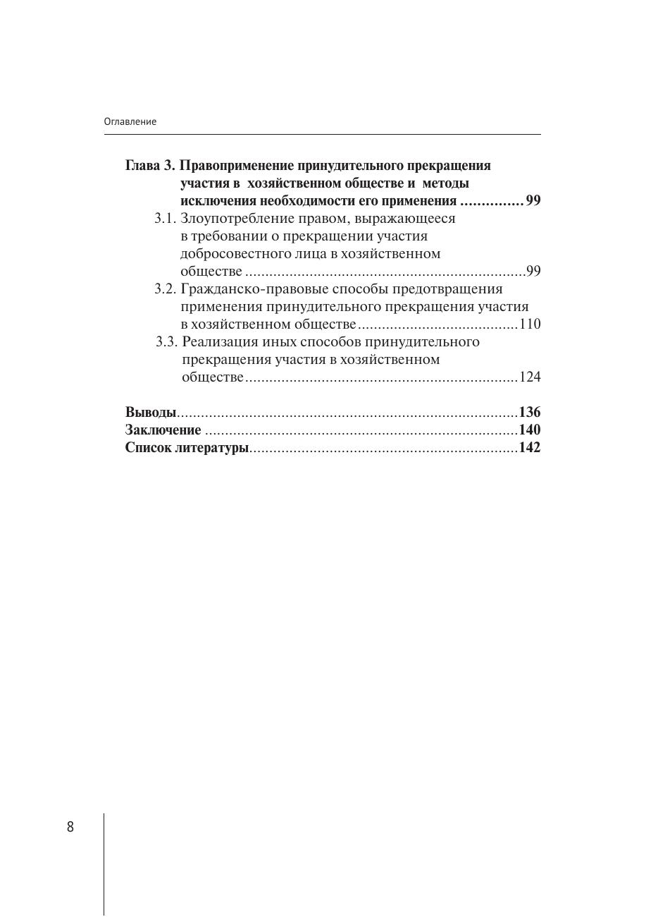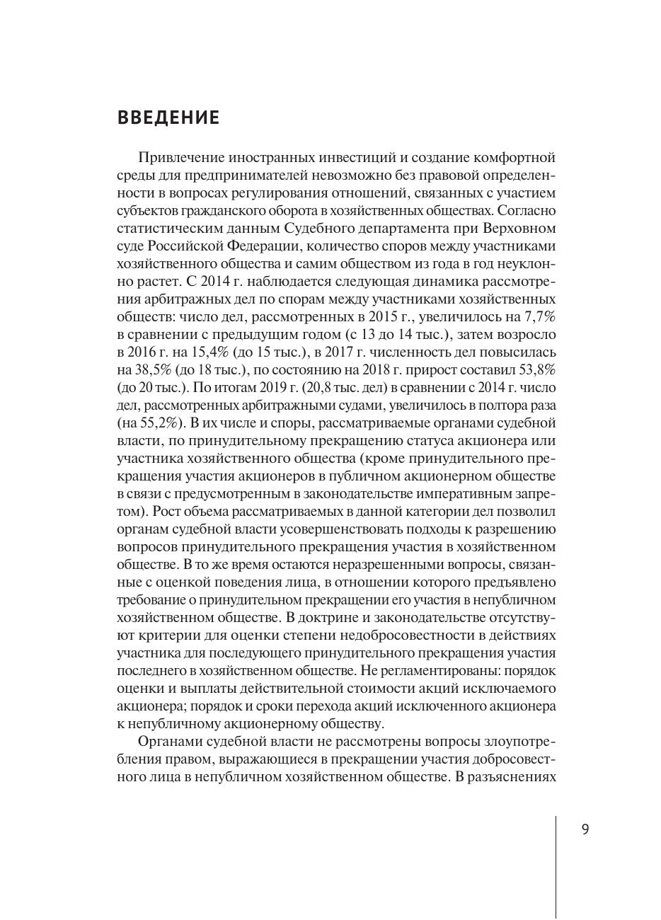 В работе анализируются научные труды и судебно-арбитражная практика применения норм, посвященных принудительному исключению участника (акционера) из непубличной компании. Представлен анализ всей доступной на текущий момент судебной практики исключения бизнес-партнеров из непубличной компании, рассмотрены судебные акты от первой инстанции до Верховного Суда Российской Федерации. Проведенное исследование показывает, что имеется правовая неопределенность применения данного института и наблюдается рост количества корпоративных споров в арбитражных судах. В работе изучены наиболее значимые вопросы, которые обсуждаются в такого рода делах, предложены рекомендации для судов и участников гражданского оборота, а также рассмотрены варианты разрешения корпоративных конфликтов между участниками непубличной компании. Монография адресована молодым исследователям, судьям, а также корпоративным юристам.
