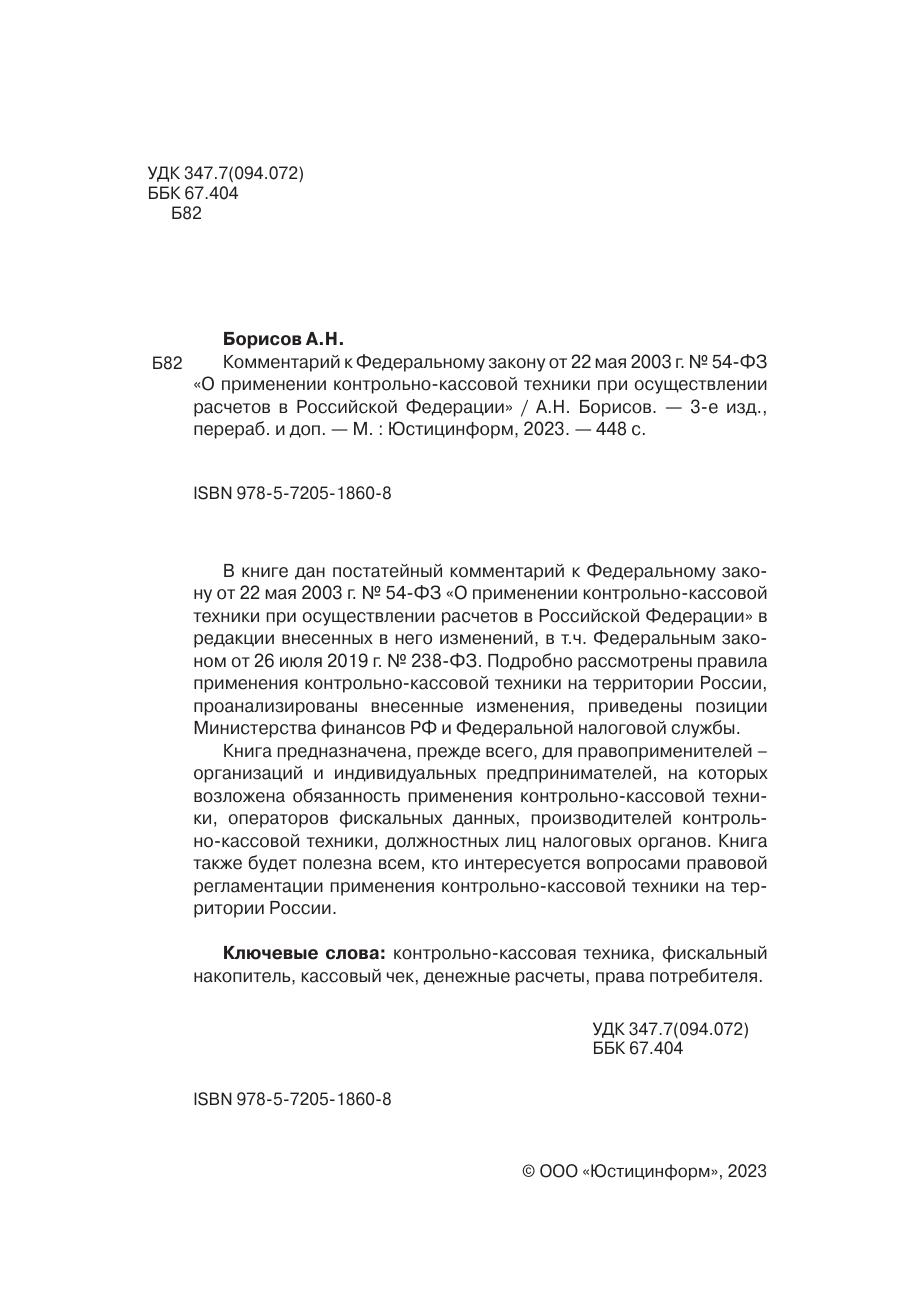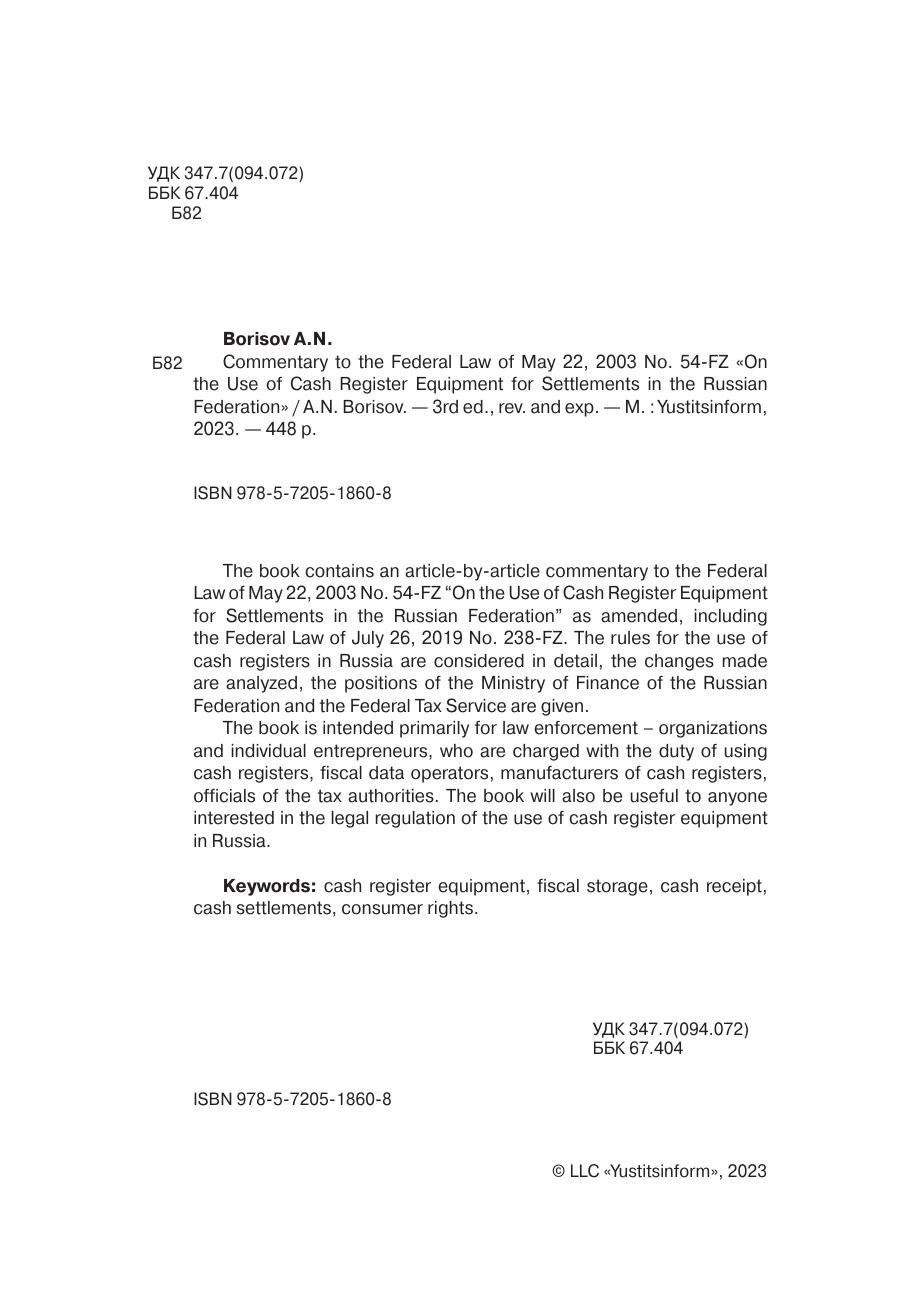 В книге дан постатейный комментарий к Федеральному закону от 22 мая 2003 г. № 54-ФЗ «О применении контрольно-кассовой техники при осуществлении расчетов в Российской Федерации» в редакции внесенных в него изменений, в т.ч. Федеральным законом от 26 июля 2019 г. № 238-ФЗ. Подробно рассмотрены правила применения контрольно-кассовой техники на территории России, проанализированы внесенные изменения, приведены позиции Министерства финансов РФ и Федеральной налоговой службы. Книга предназначена, прежде всего, для правоприменителей – организаций и индивидуальных предпринимателей, на которых возложена обязанность применения контрольно-кассовой техники, операторов фискальных данных, производителей контрольно-кассовой техники, должностных лиц налоговых органов. Книга также будет полезна всем, кто интересуется вопросами правовой регламентации применения контрольно-кассовой техники на территории России.