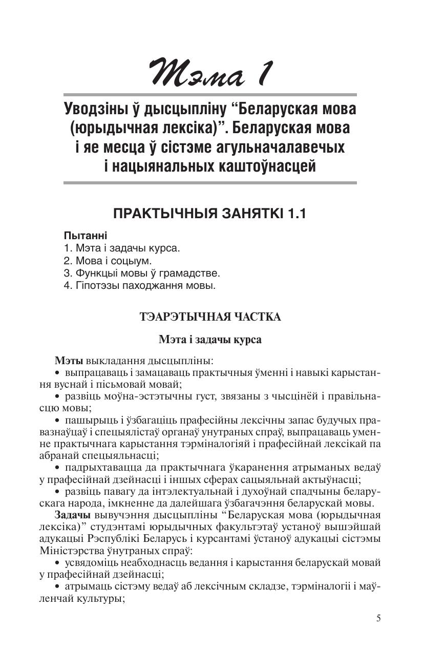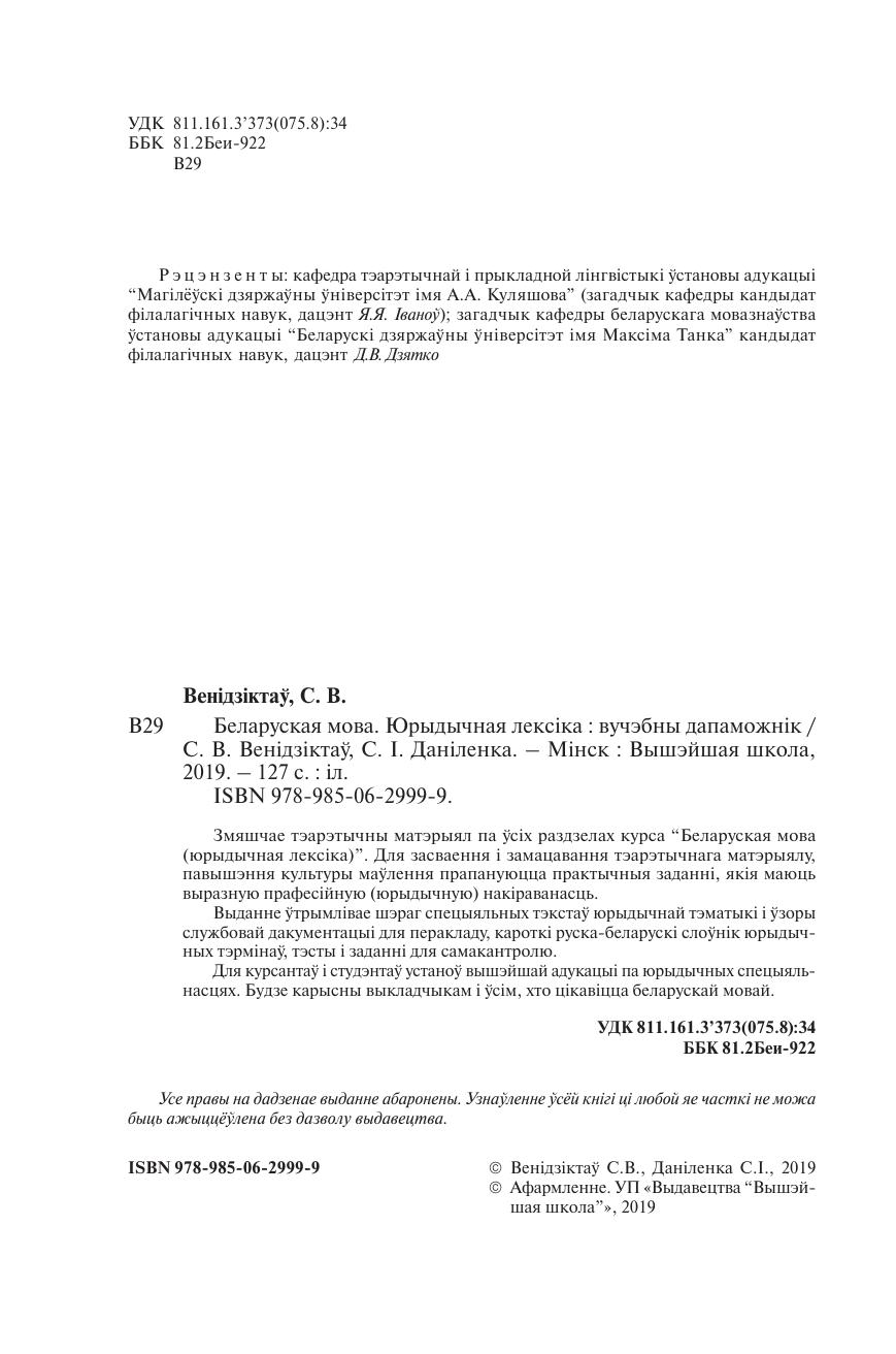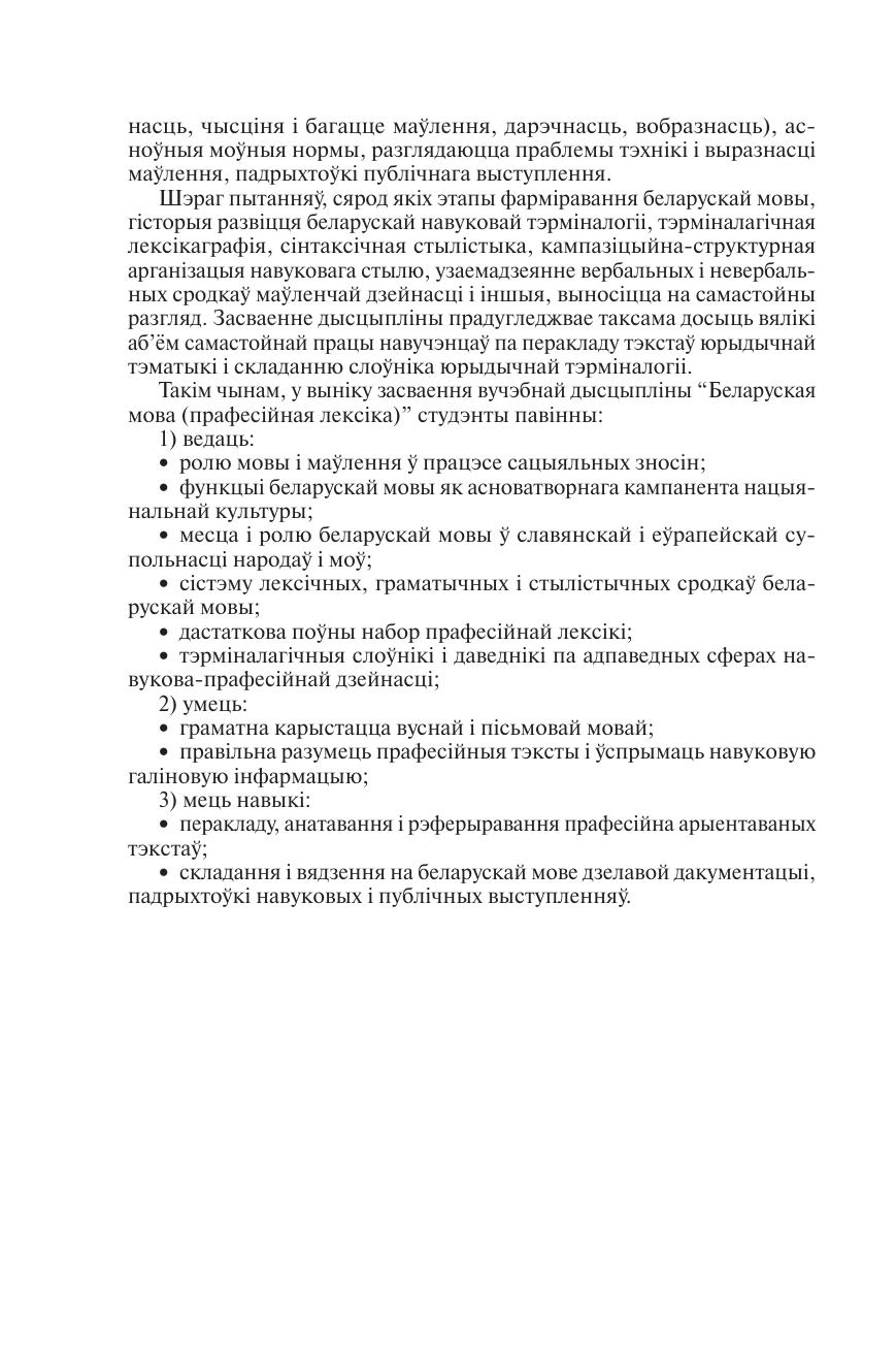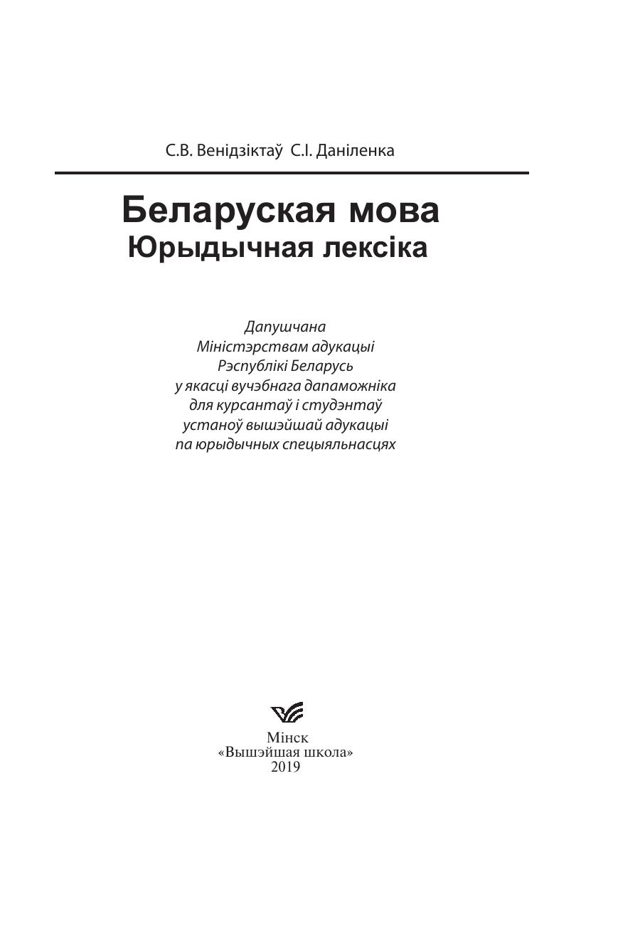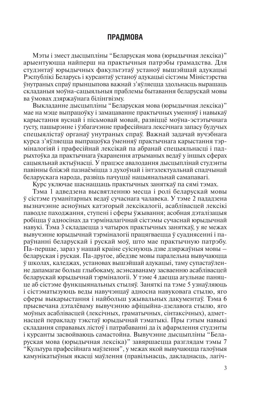 Змяшчае тэарэтычны матэрыял па ўсіх раздзелах курса “Беларуская мова (юрыдычная лексіка)”. Для засваення і замацавання тэарэтычнага матэрыялу, павышэння культуры маўлення прапануюцца практычныя заданні, якія маюць выразную прафесійную (юрыдычную) накіраванасць. Выданне ўтрымлівае шэраг спецыяльных тэкстаў юрыдычнай тэматыкі і ўзоры службовай дакументацыі для перакладу, кароткі руска-беларускі слоўнік юрыдычных тэрмінаў, тэсты і заданні для самакантролю. Для курсантаў і студэнтаў устаноў вышэйшай адукацыі па юрыдычных спецыяльнасцях. Будзе карысны выкладчыкам і ўсім, хто цікавіцца беларускай мовай.