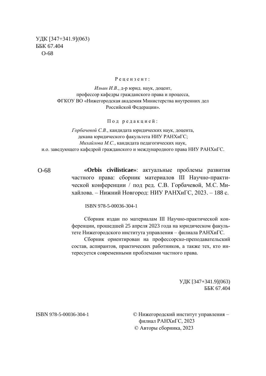 Сборник издан по материалам III Научно-практической кон-ференции, прошедшей 25 апреля 2023 года на юридическом факуль-тете Нижегородского института управления – филиала РАНХиГС. Сборник ориентирован на профессорско-преподавательский состав, аспирантов, практических работников, а также тех, кто ин-тересуется современными проблемами частного права.