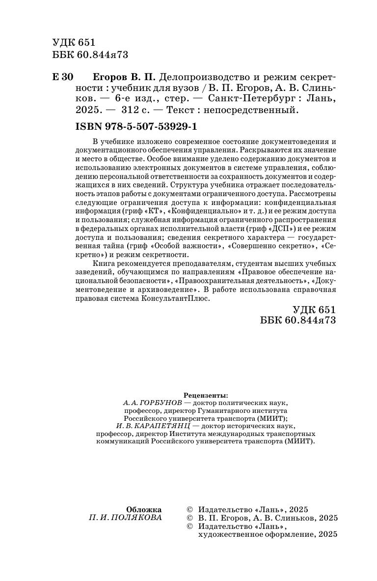 В учебнике изложено современное состояние документо-ведения и документационного обеспечения управления. Раскрываются их значение и место в обществе. Особое внимание уделено содержанию документов и использованию электронных документов в системе управ-ления, соблюдению персональной ответственности за сохранность доку-ментов и содержащихся в них сведений. Структура учебника отражает последовательность этапов работы с документами ограниченного до-ступа. Рассмотрены следующие ограничения доступа к информации: конфиденциальная информация (гриф «КТ», «Конфиденциально» и т. д.) и ее режим доступа и пользования, служебная информация ограничен-ного распространения в федеральных органах исполнительной власти (гриф «ДСП») и ее режим доступа и пользования, сведения секретного характера — государственная тайна (гриф «Особой важности», «Совер-шенно секретно», «Секретно») и режим секретности. Книга рекомендуется преподавателям, студентам высших учебных заведений, обучающихся по направлениям «Правовое обеспечение национальной безопасности», «Правоохранительная деятельность», «Документоведение и архивоведение». В работе использована справочная правовая система КонсультантПлюс.